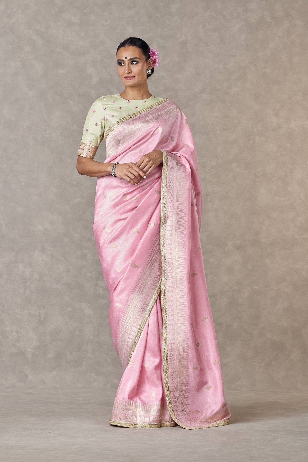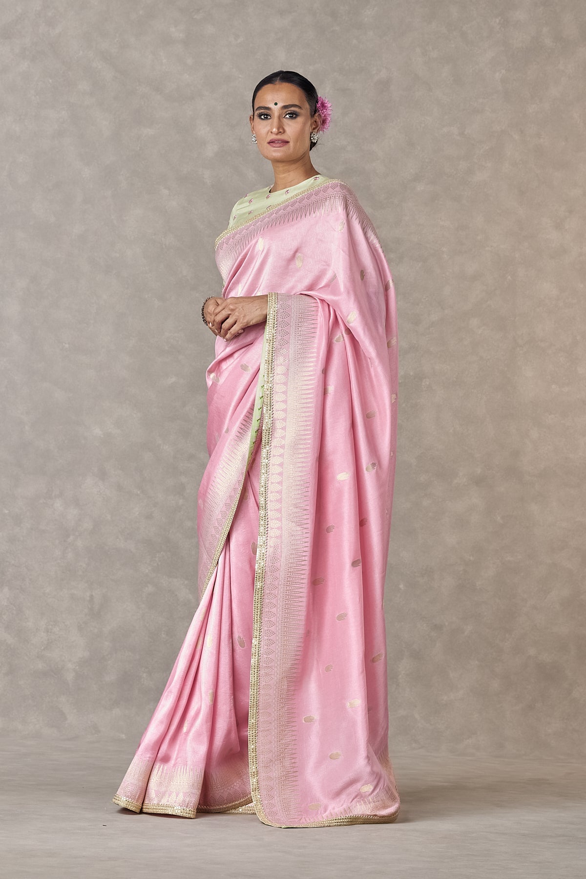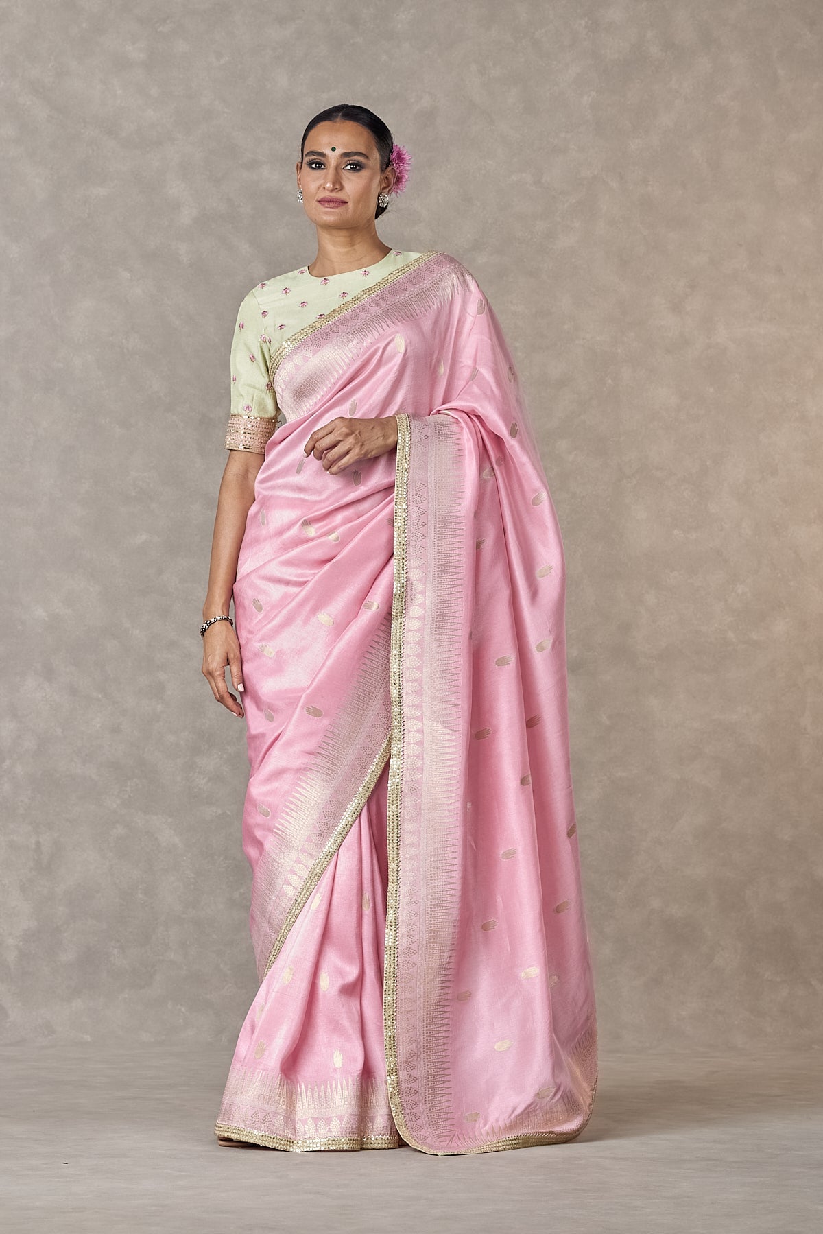 Details: Saree - Jacquard saree with Trikone and anar zari border | Embellished with embroidered border and edged with kinari Blouse piece - Silk blouse piece embellished with embroidered border and resham kaam.