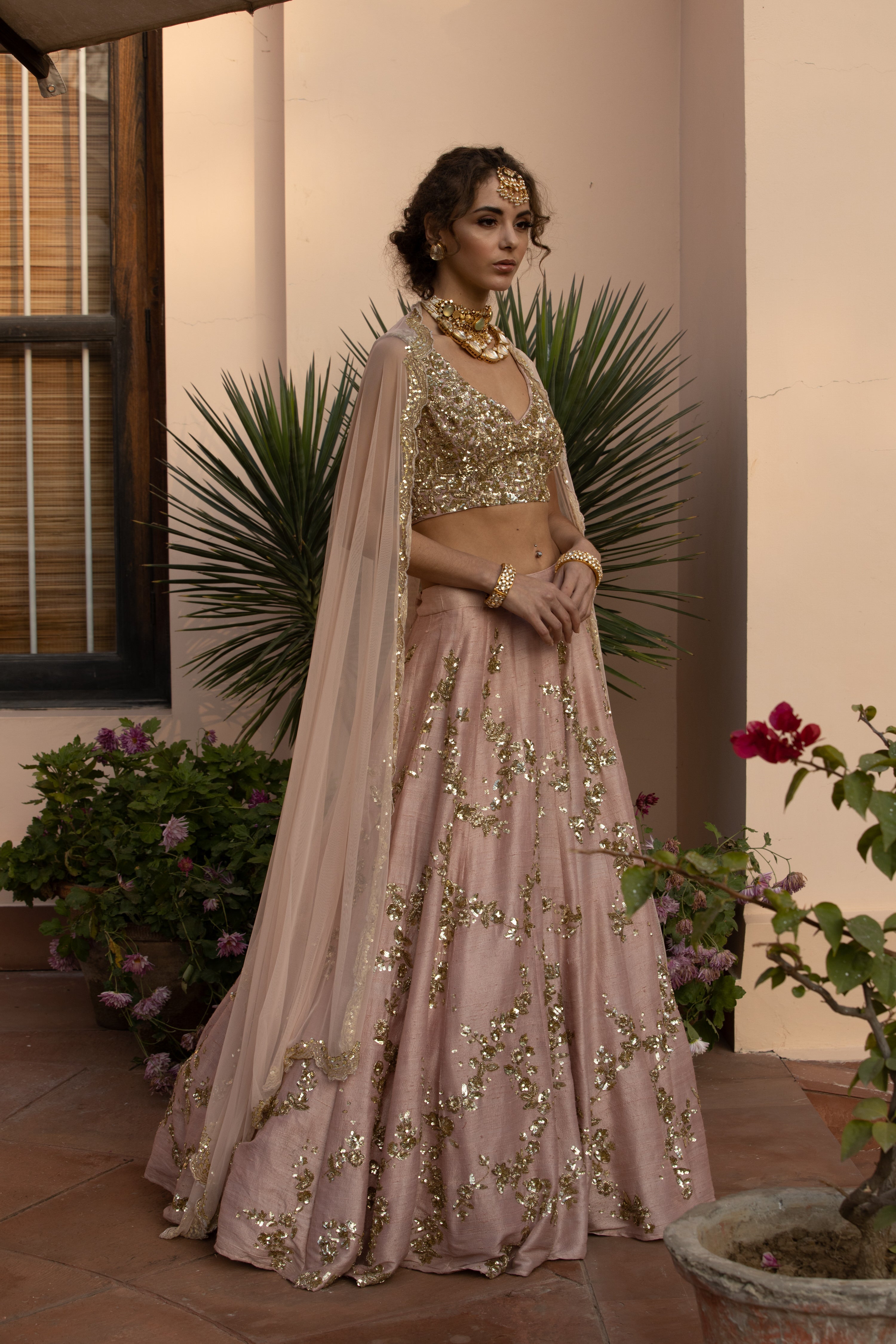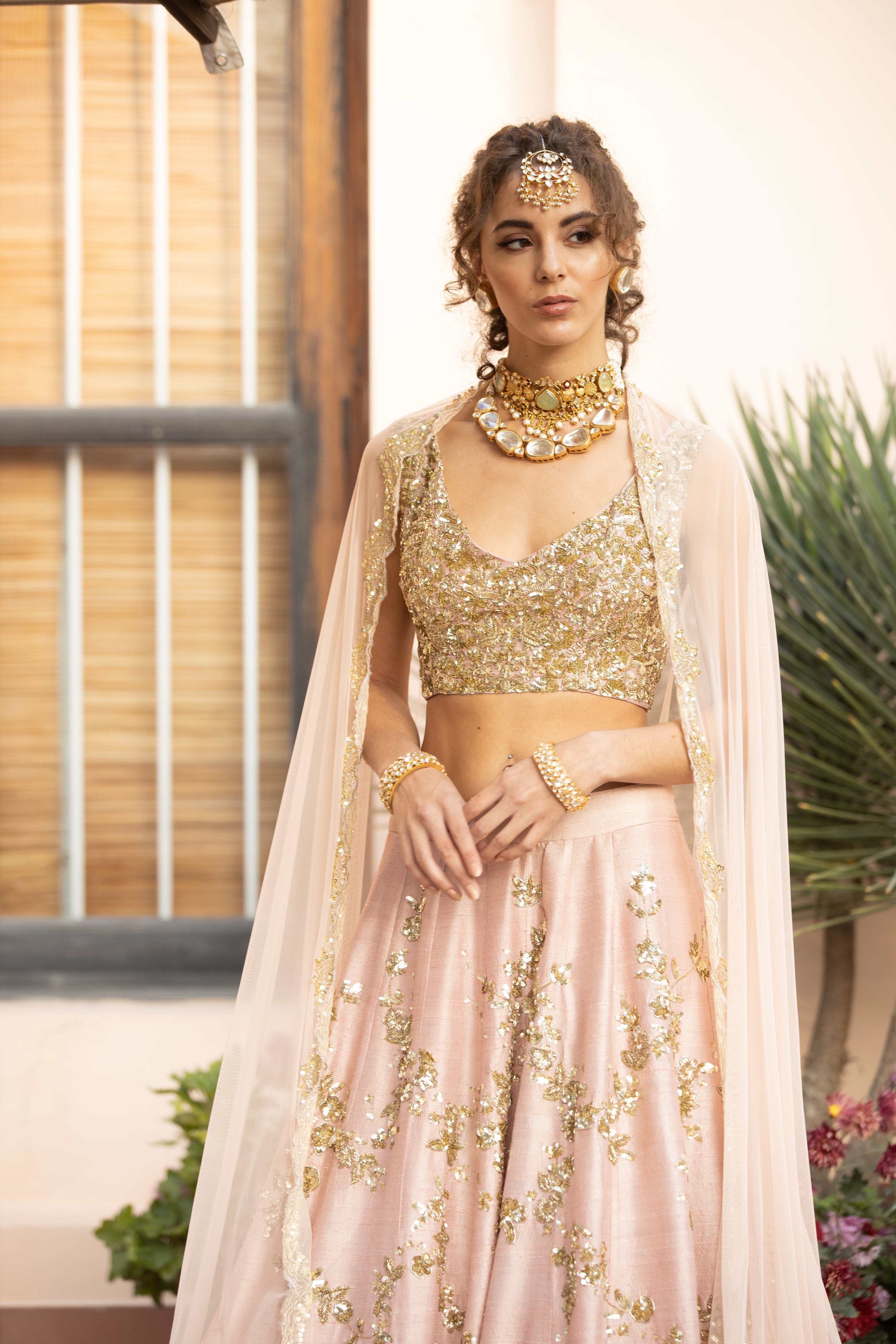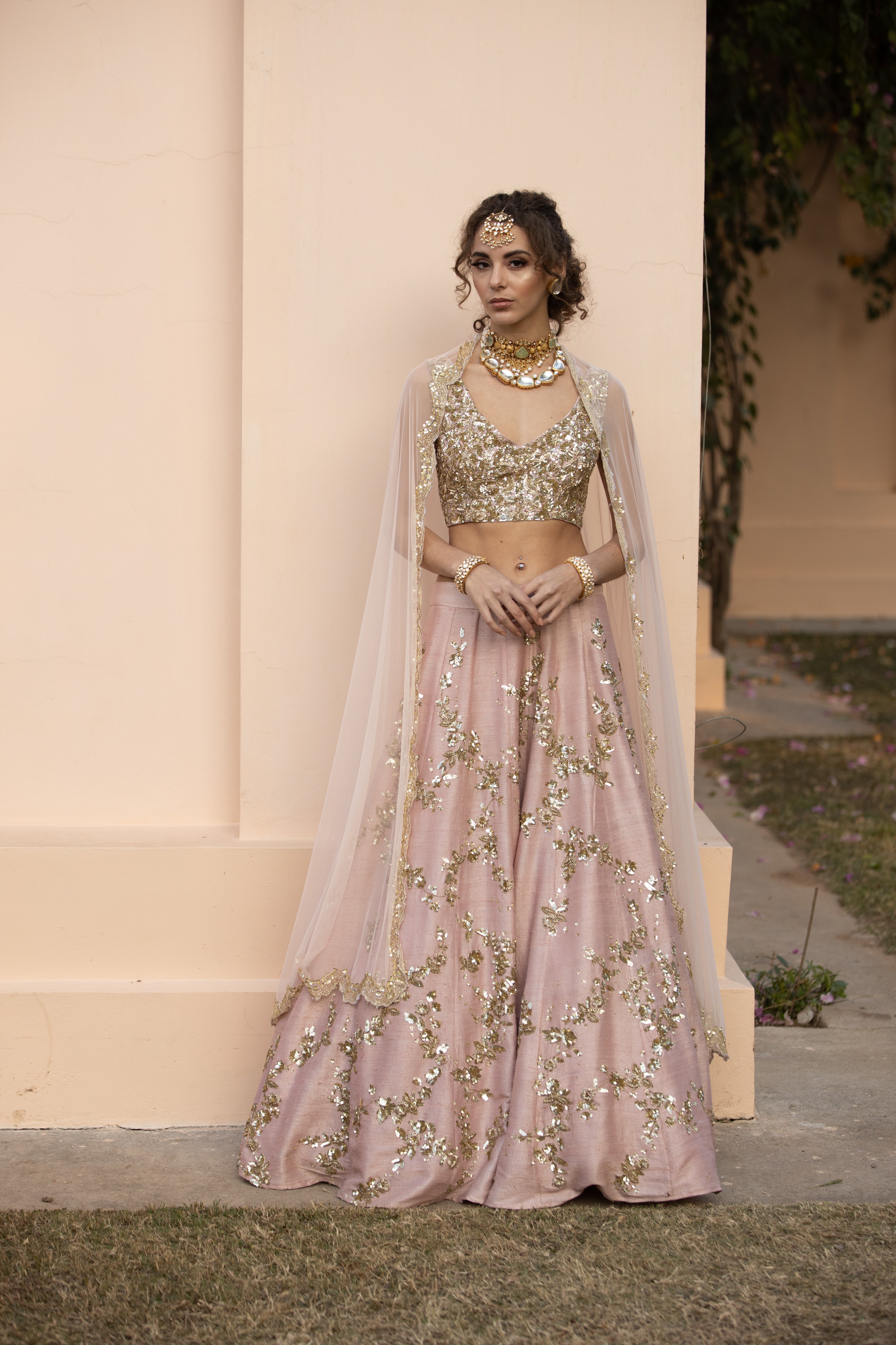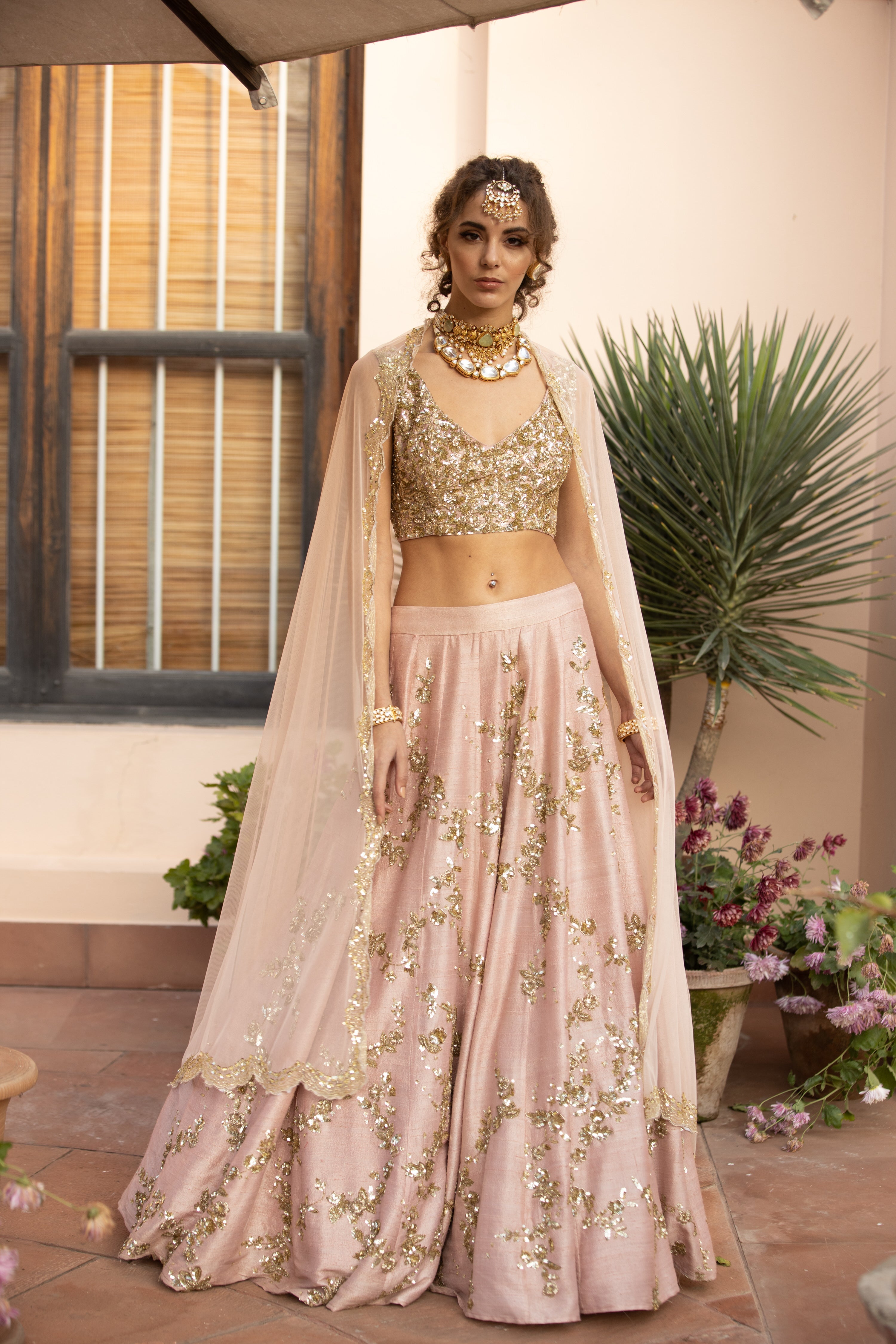 Featuring a BABY PINK WITH GOLD JAAL WORK LEHENGA SET IN RAW SILK.