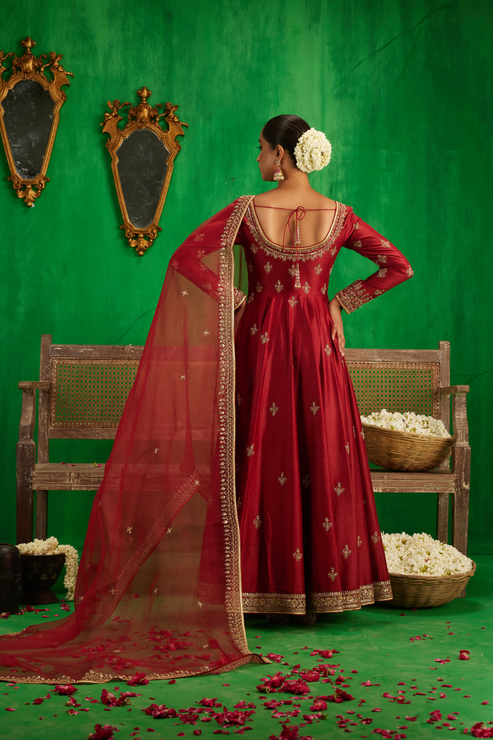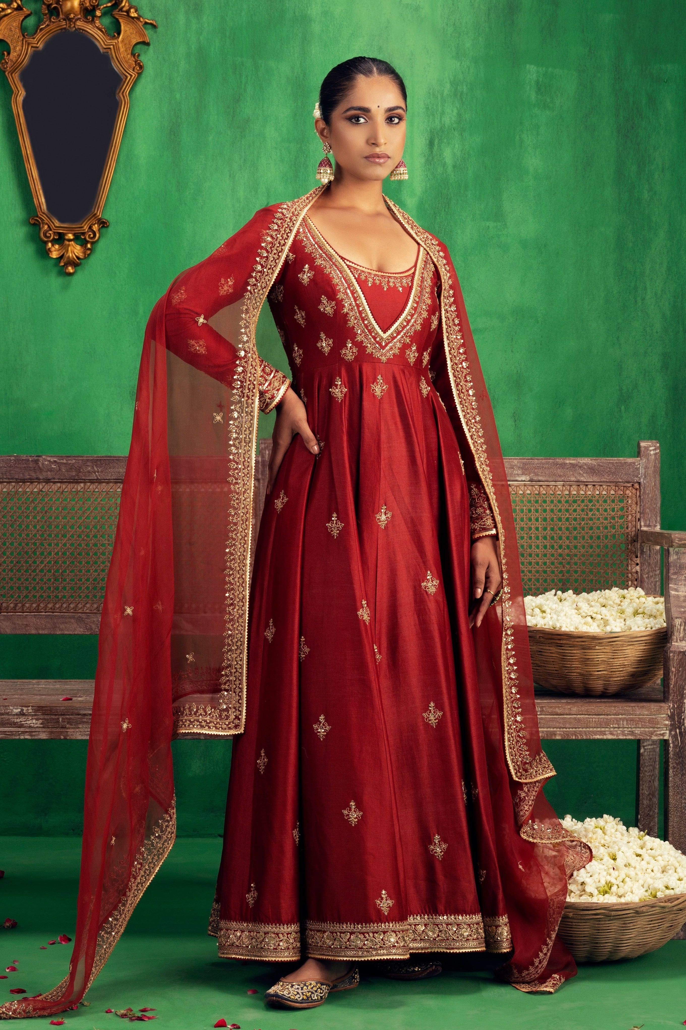 Featuring a red Chanderi Anarkali paired with a cotton silk churidar and an organza dupatta with gold dori and aari embroidery