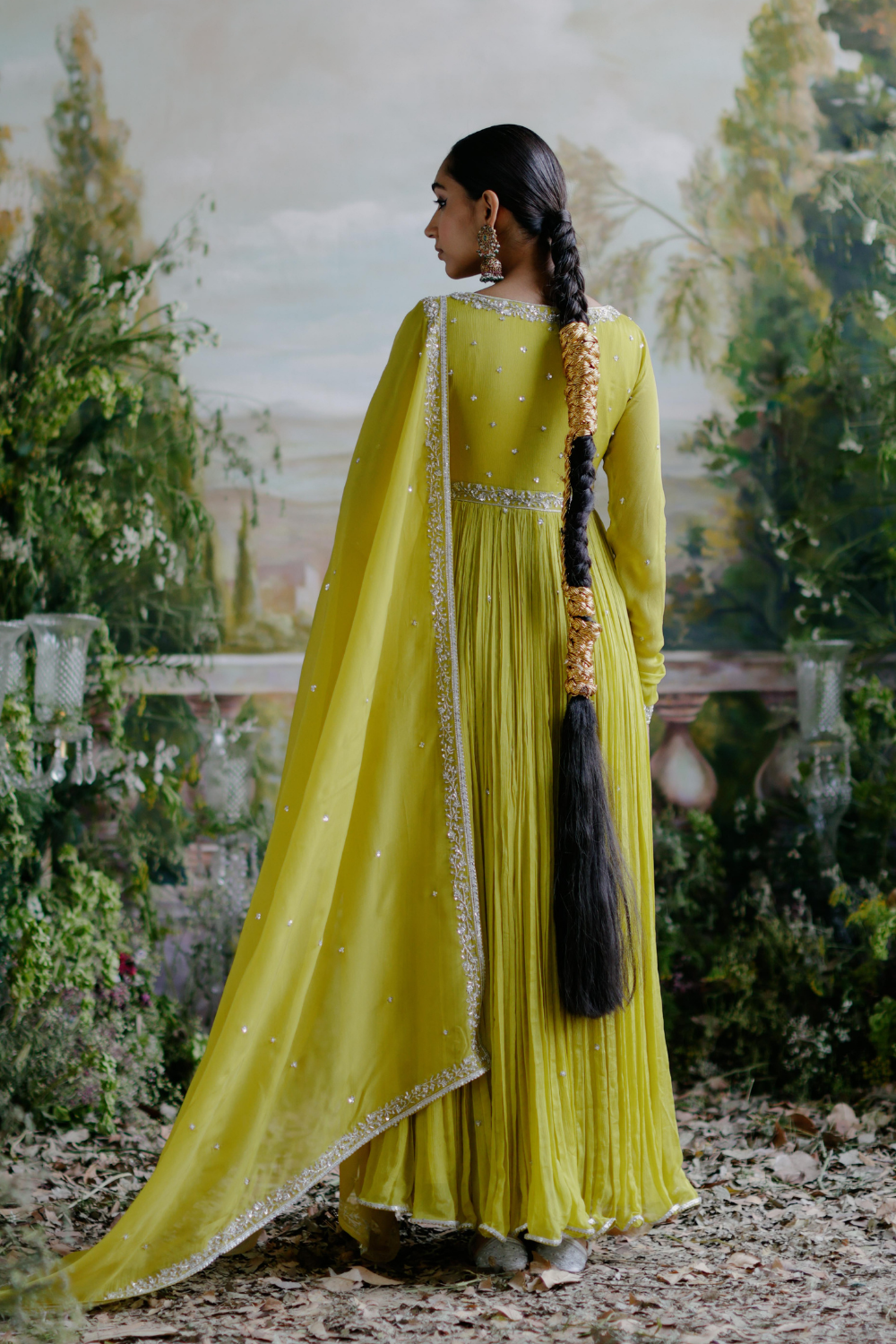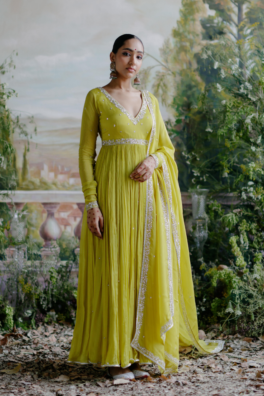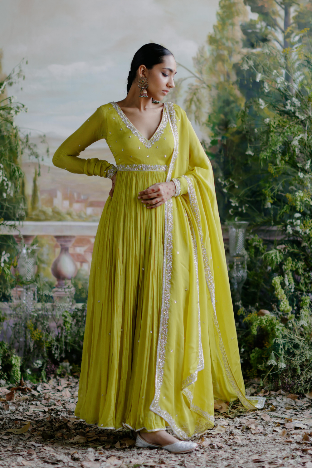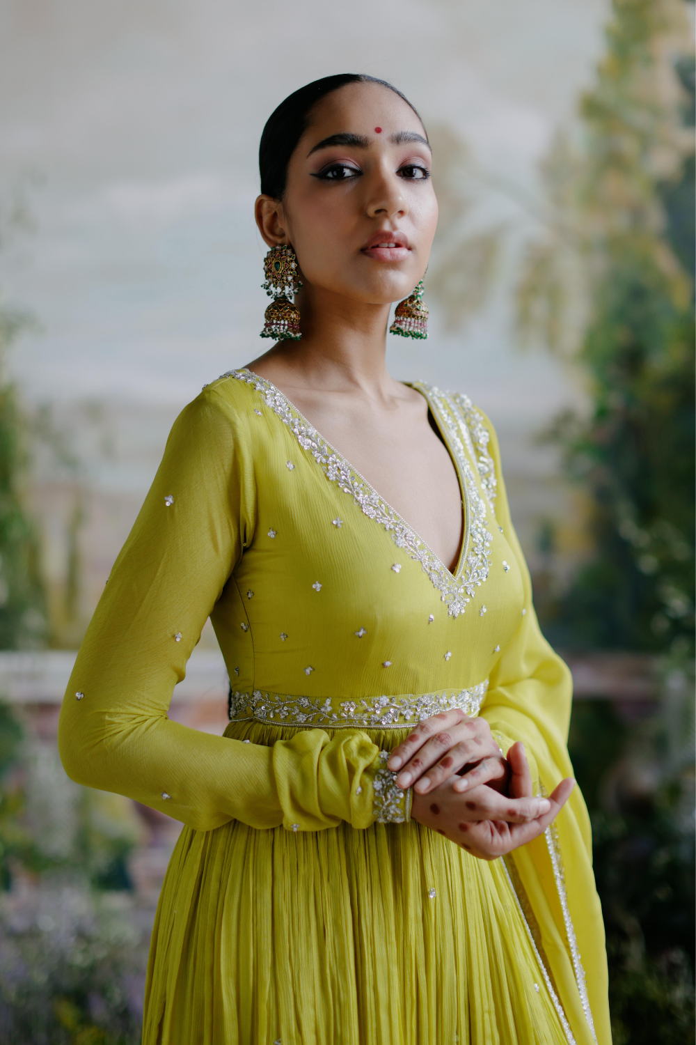 Featuring a lime chinon chiffon Anarkali set paired with an organza base dupatta with silver dori and embellished pearl hand embroidery.