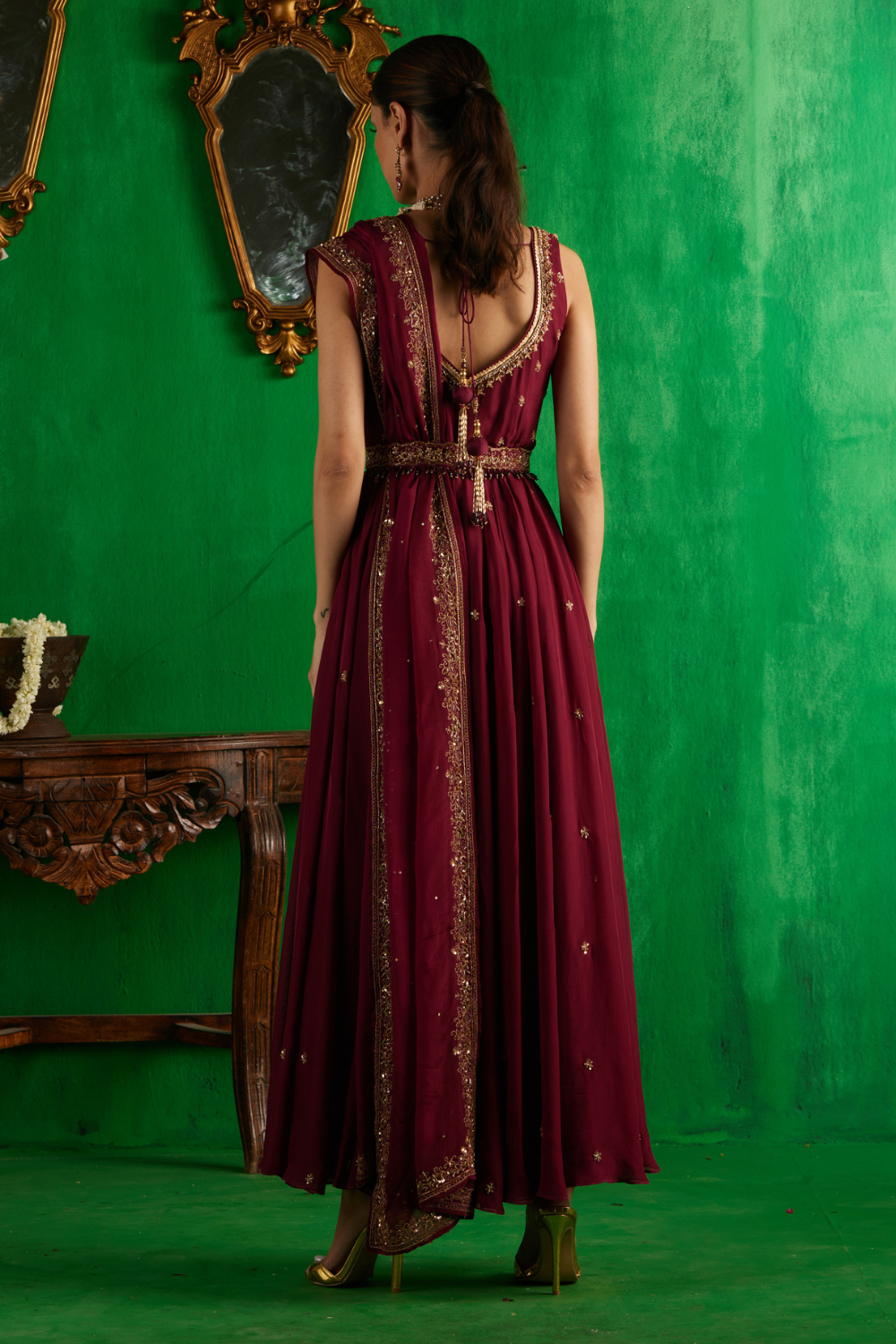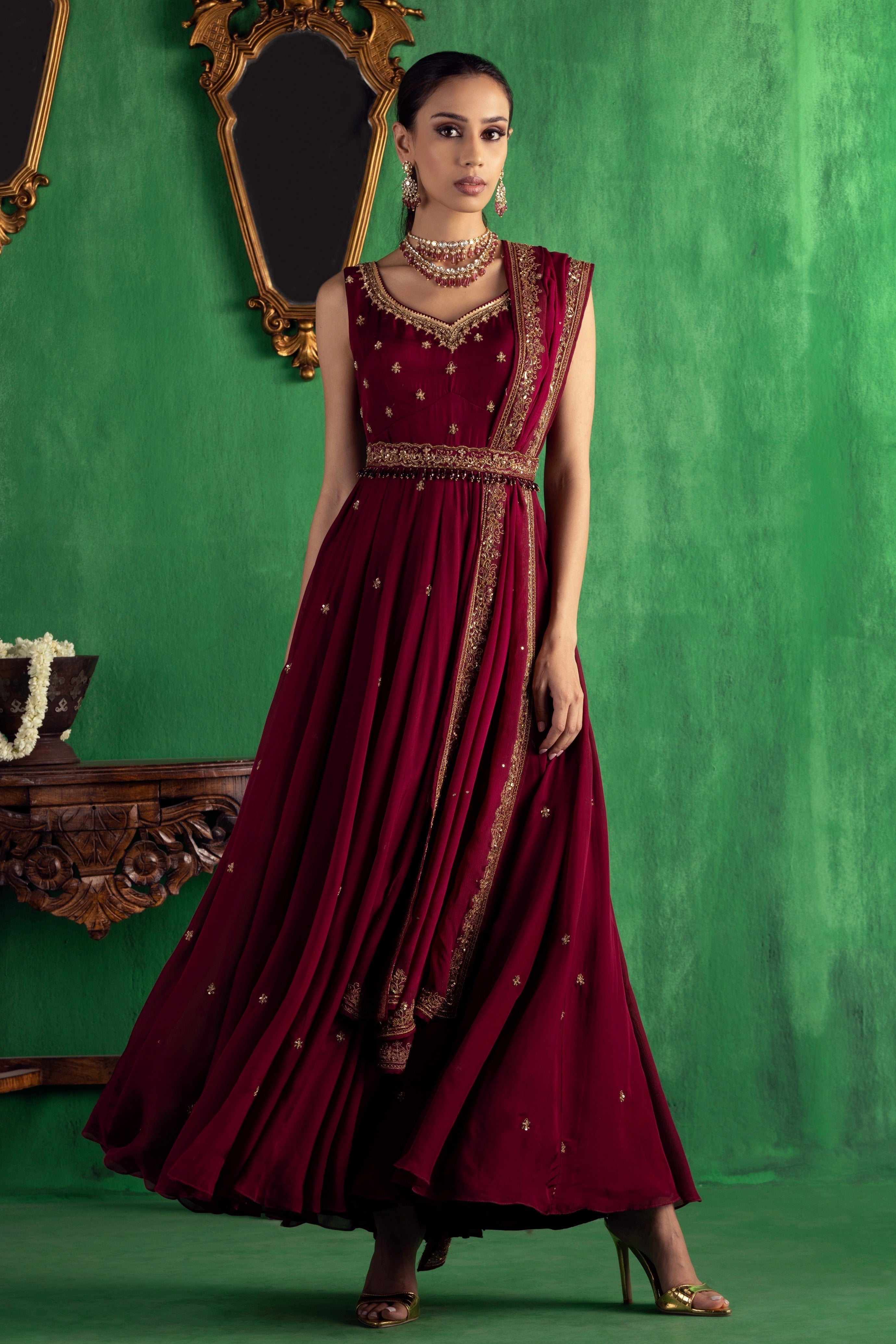 Featuring a wine flat chiffon anarkali paired with cotton silk churidar and chiffon base dhupatta with gold zari and aari embroidery