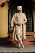 Beige Monga Achkan embroidered all over in antique zari with dabka and beads with monga kurta and churidar.