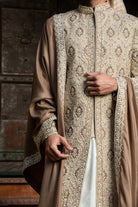 Beige Brown Raw Silk Patchwork achkan embroidered with dori Kasab dabka and beadwork with monga kurta and churidar.