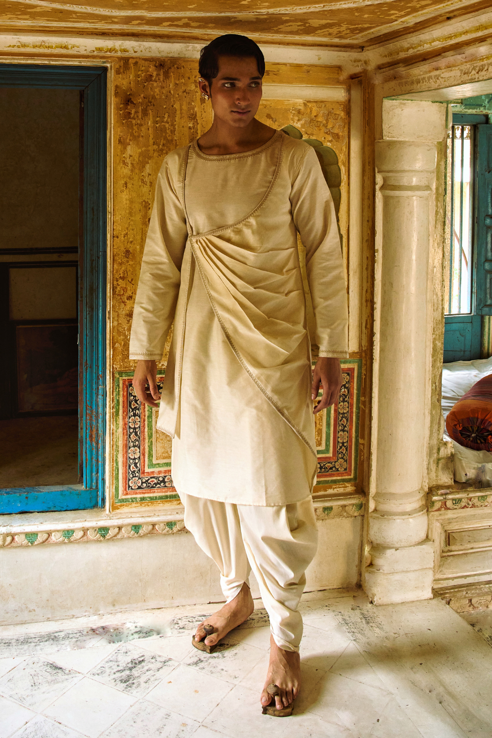 Beige cotton-silk angrakha with dhoti