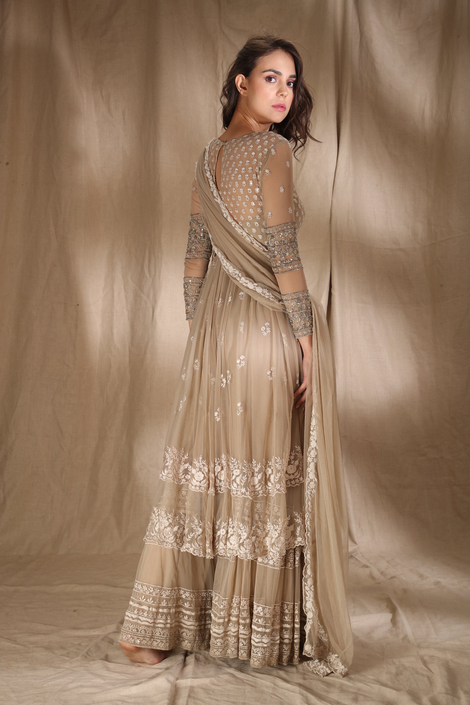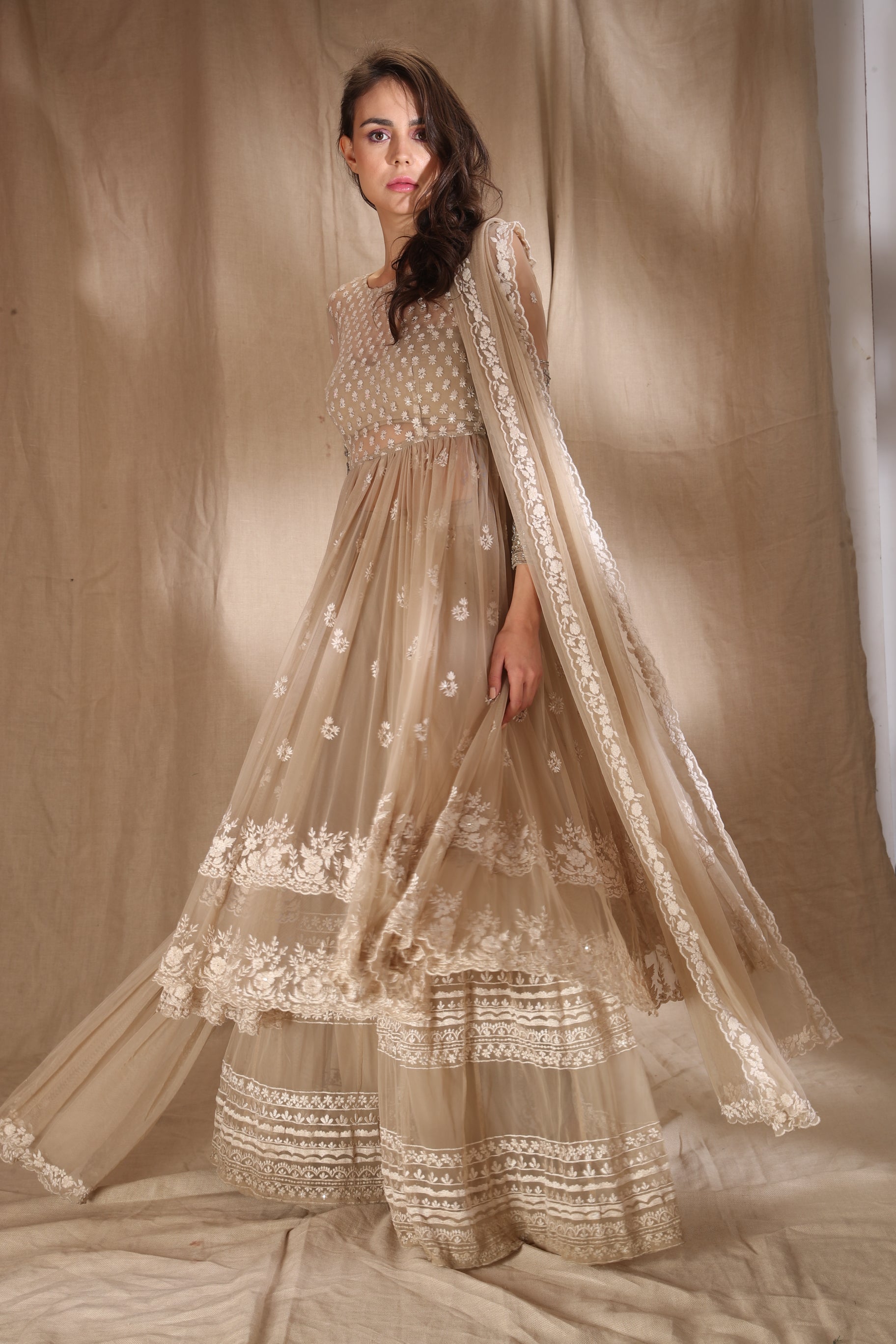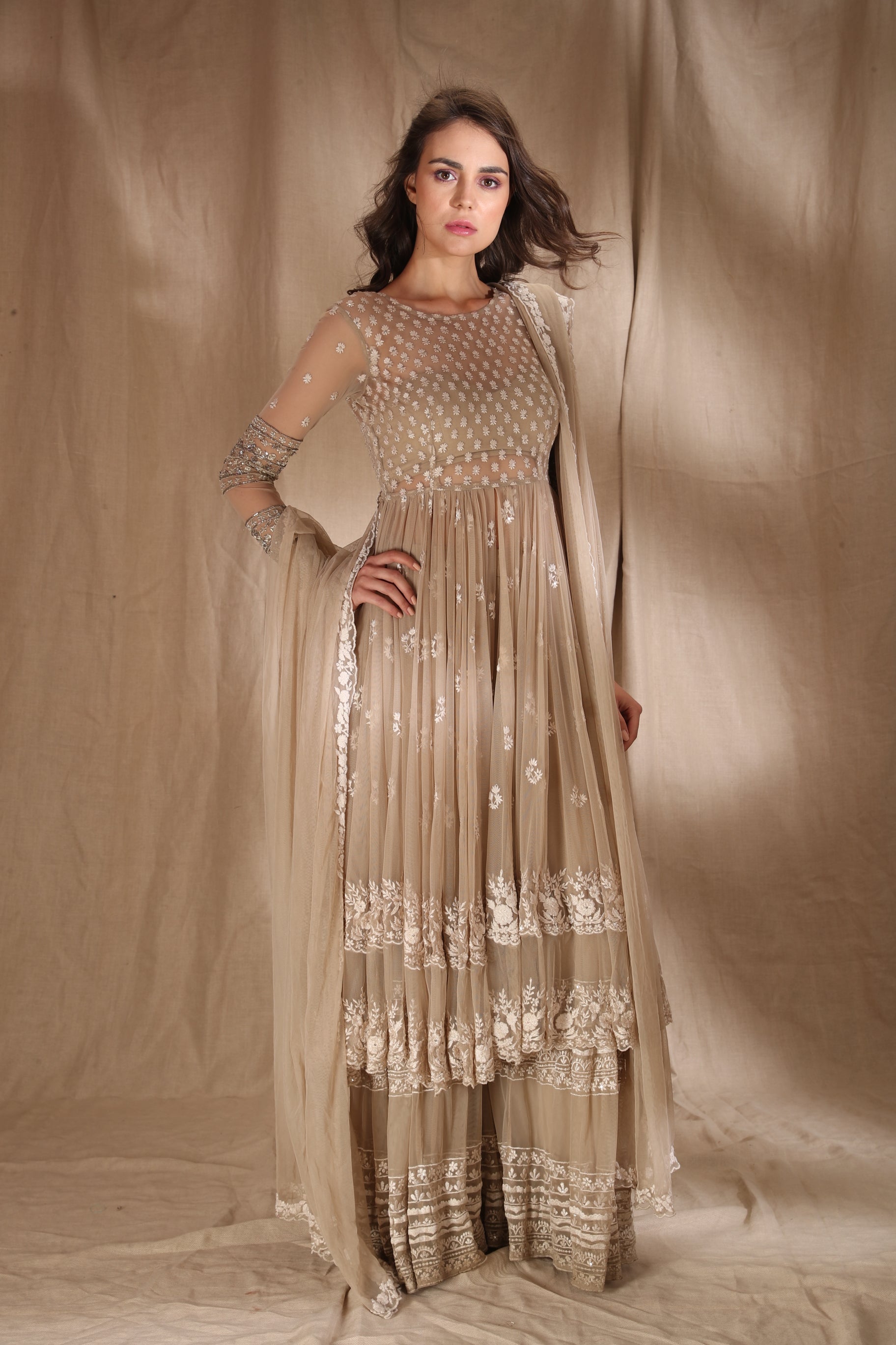 Featuring a BEIGE CREAM THREADWORK WITH JACKET IN NET.