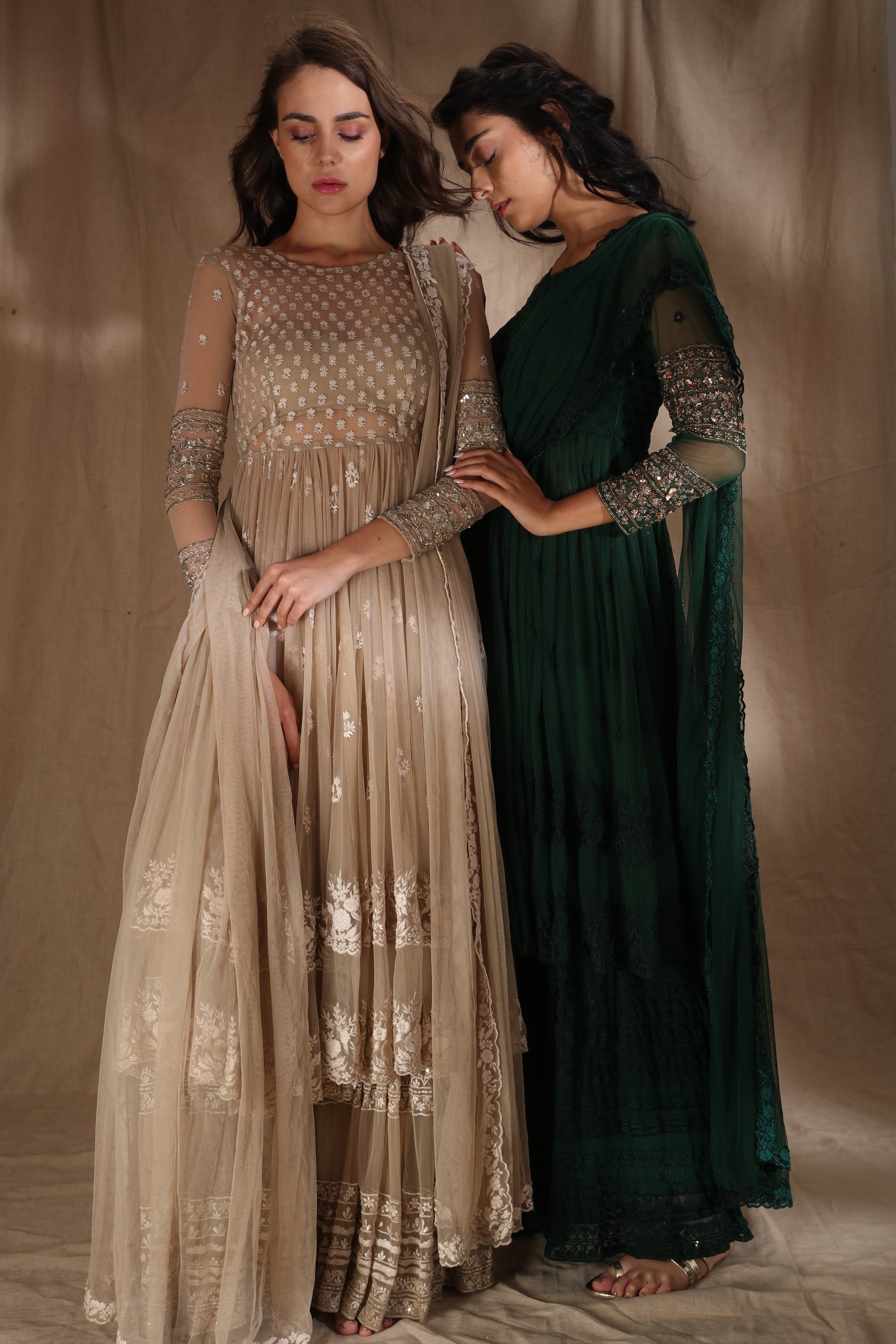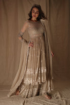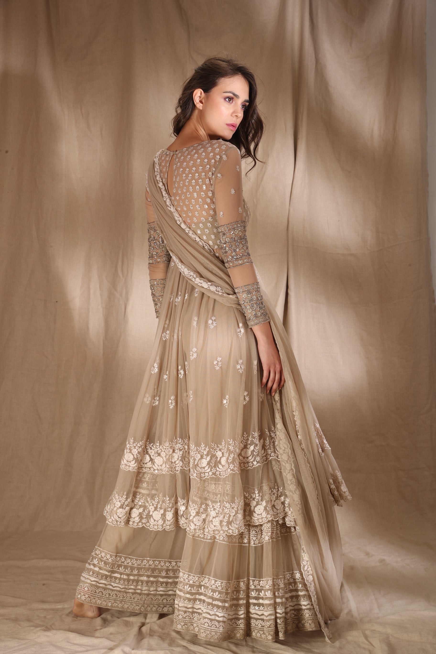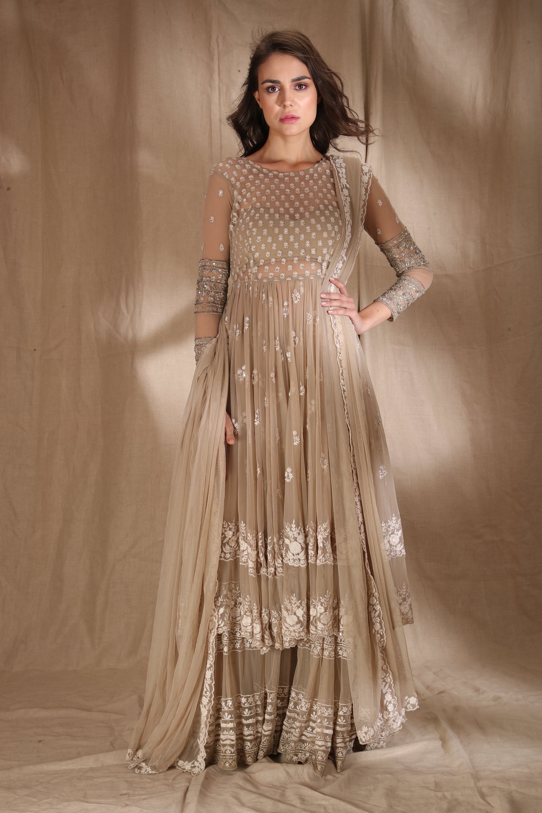 Featuring a BEIGE CREAM THREADWORK WITH JACKET IN NET.