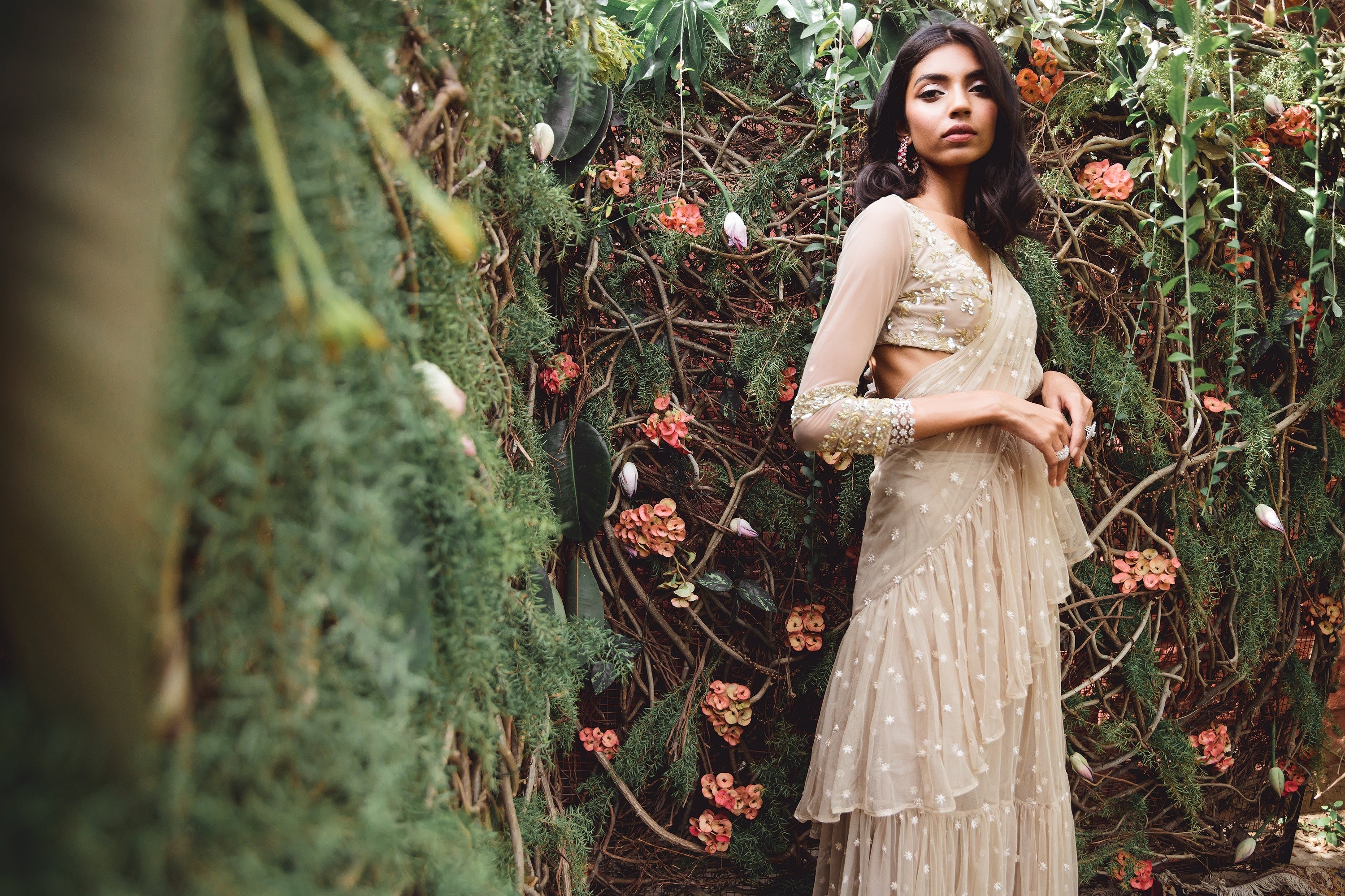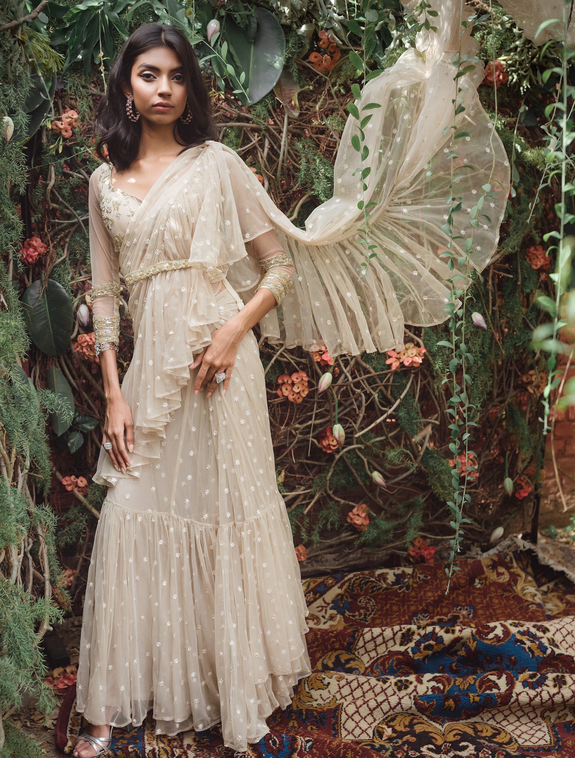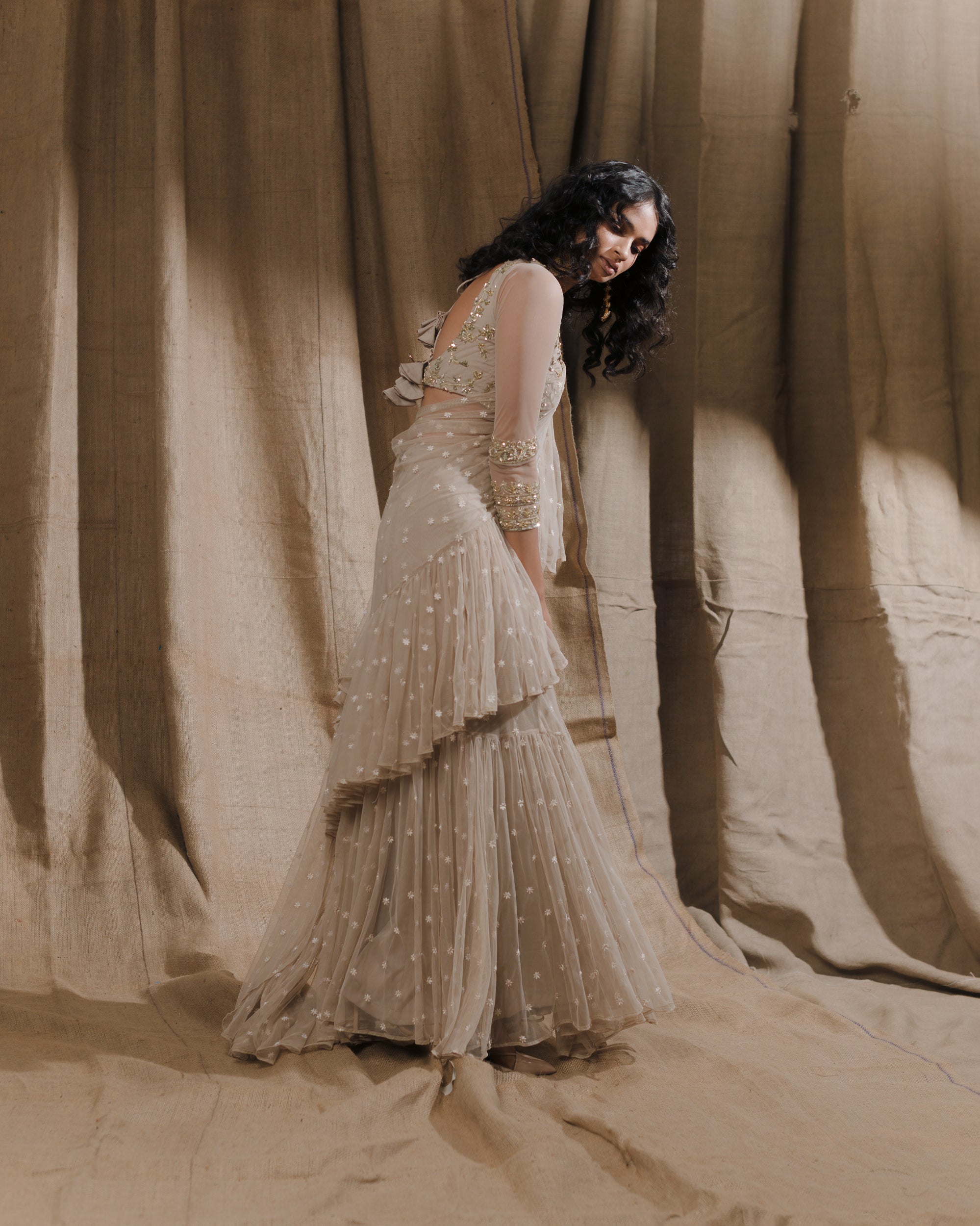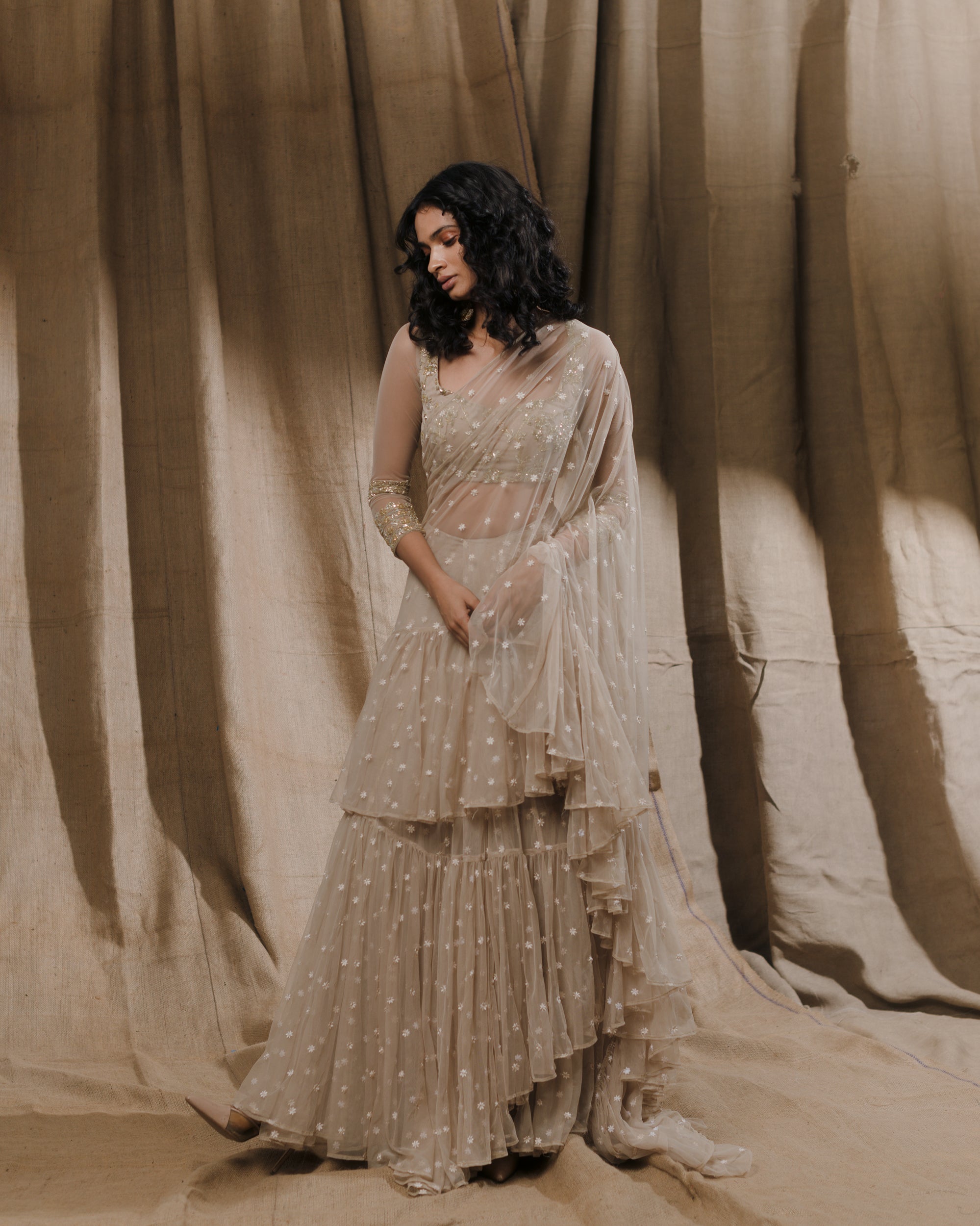 Featuring a BEIGE EMBELLISHED SAREE SET IN NET.