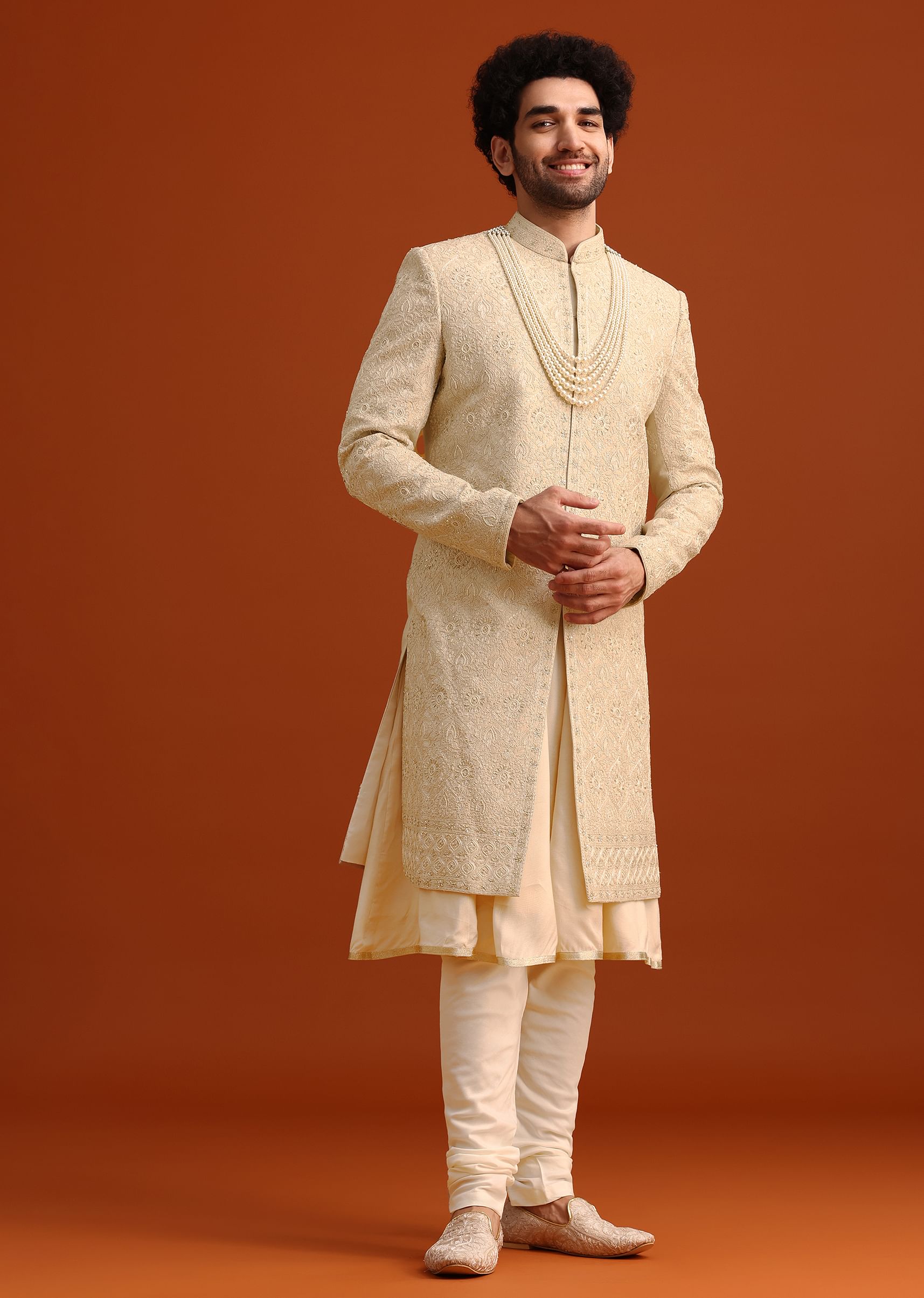 - A meticulous tale of rich artistry and expert craftsmanship this beige sherwani set is crafted for grandeur celebrations and wedding functions.