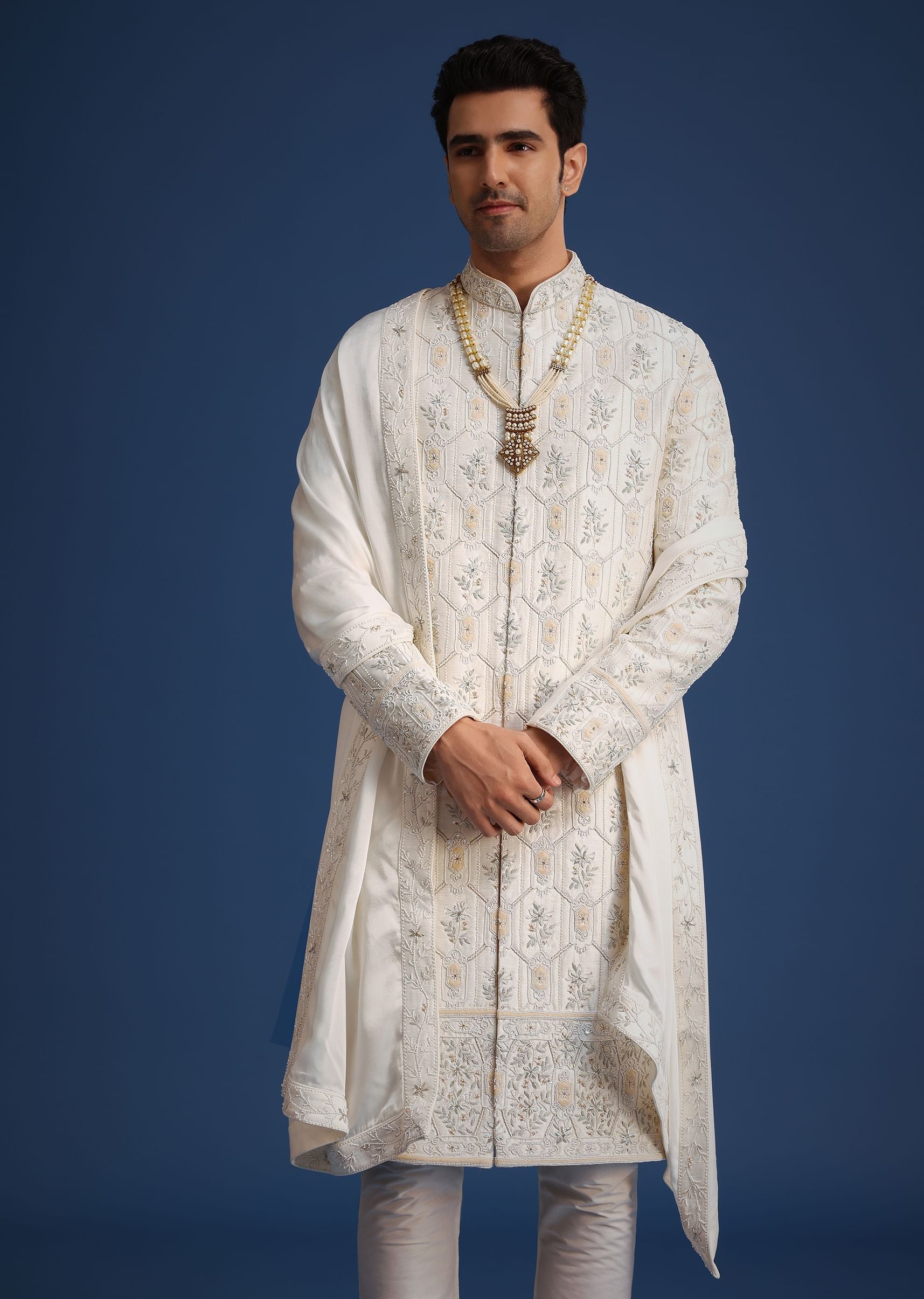- Adorned with sequin, pearls and patchwork, this beige silk sherwani set redefines traditional glamour.