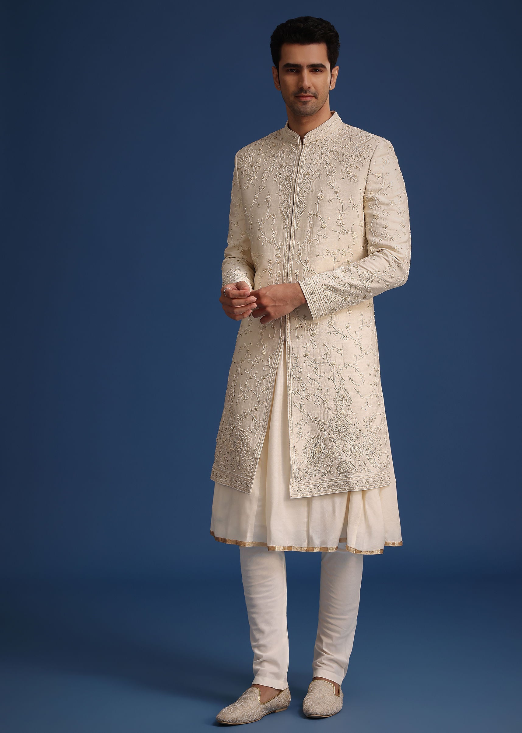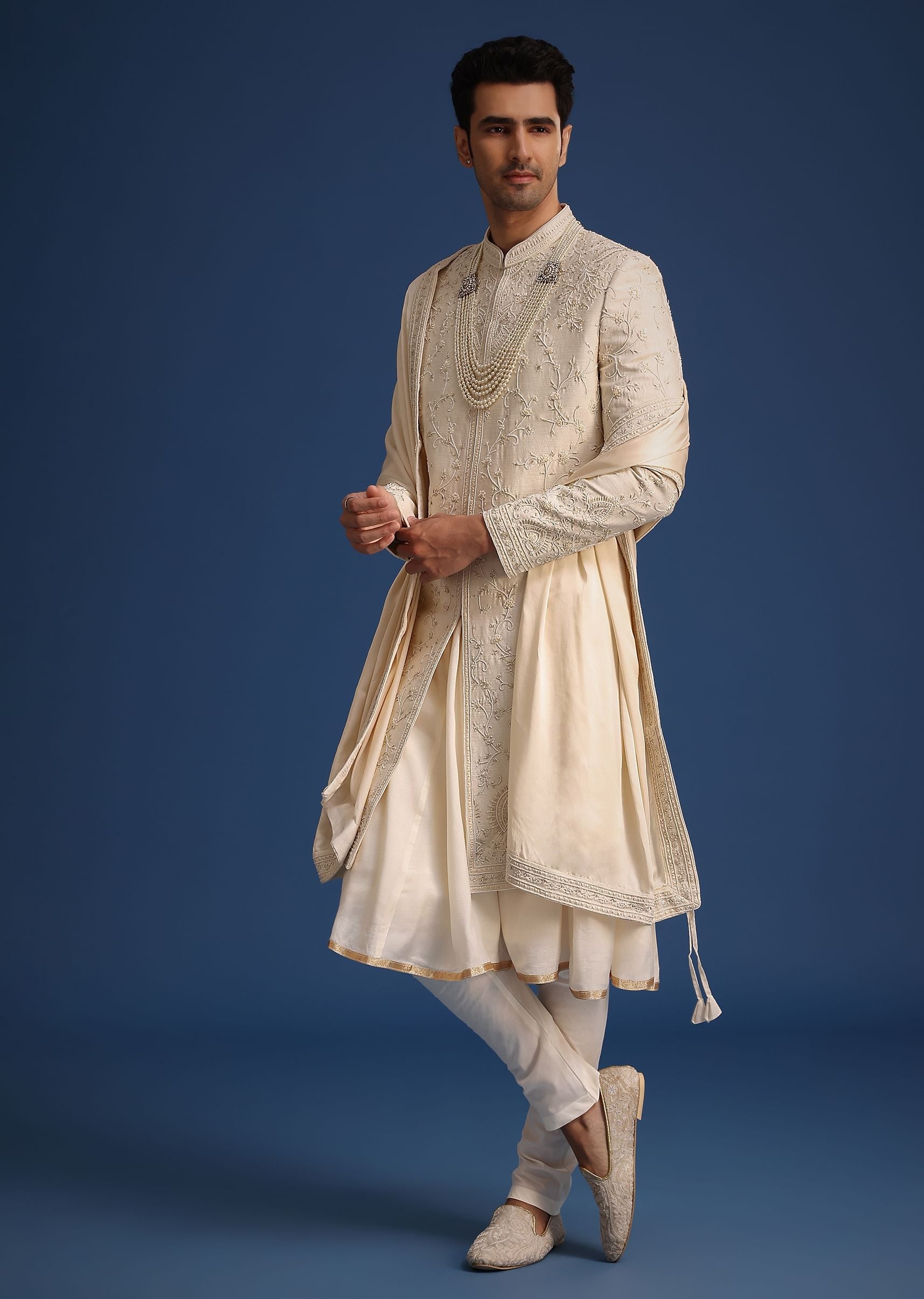 - Offering a resplendent look, our beige silk sherwani set exudes old world charm and refined glamour.