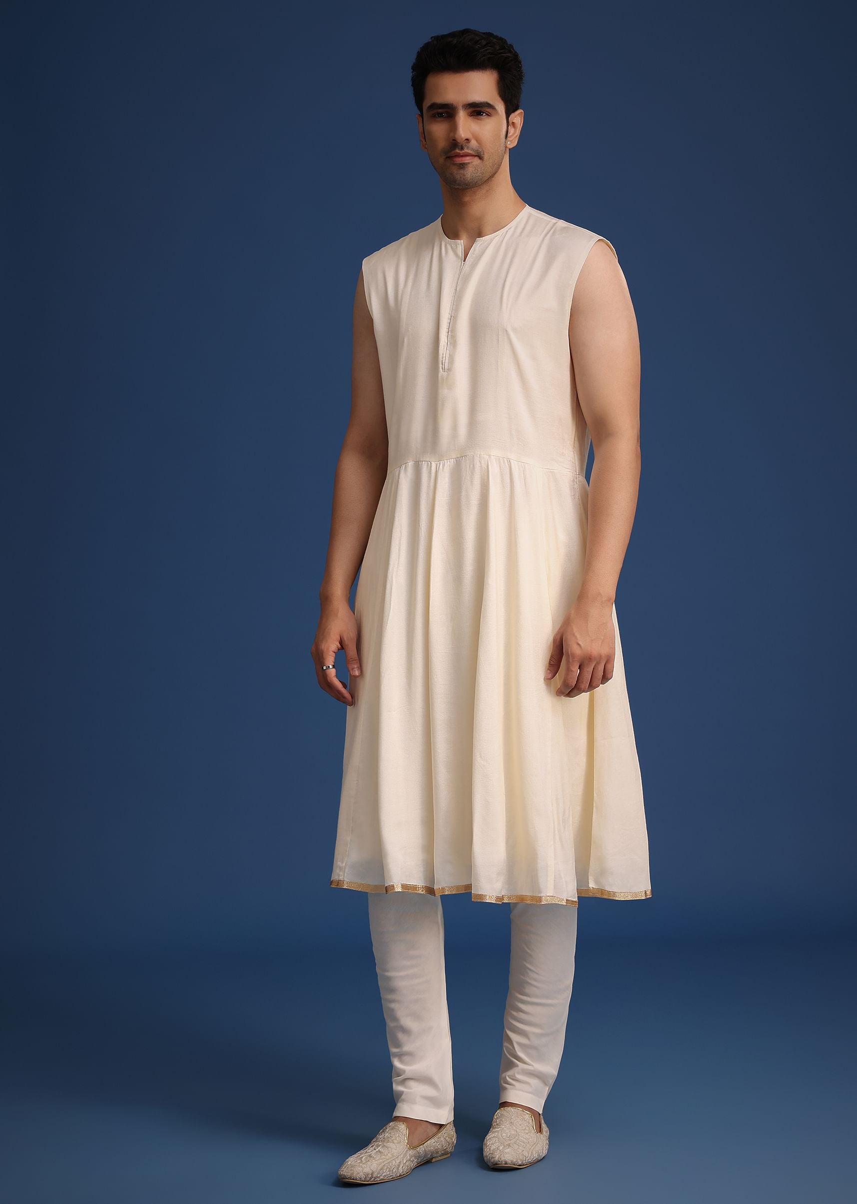 - Designed with a mandarin collar, front hook-eye placket and full sleeves, the exquisite craftsmanship is highlighted with accents of zardozi embroidery.
