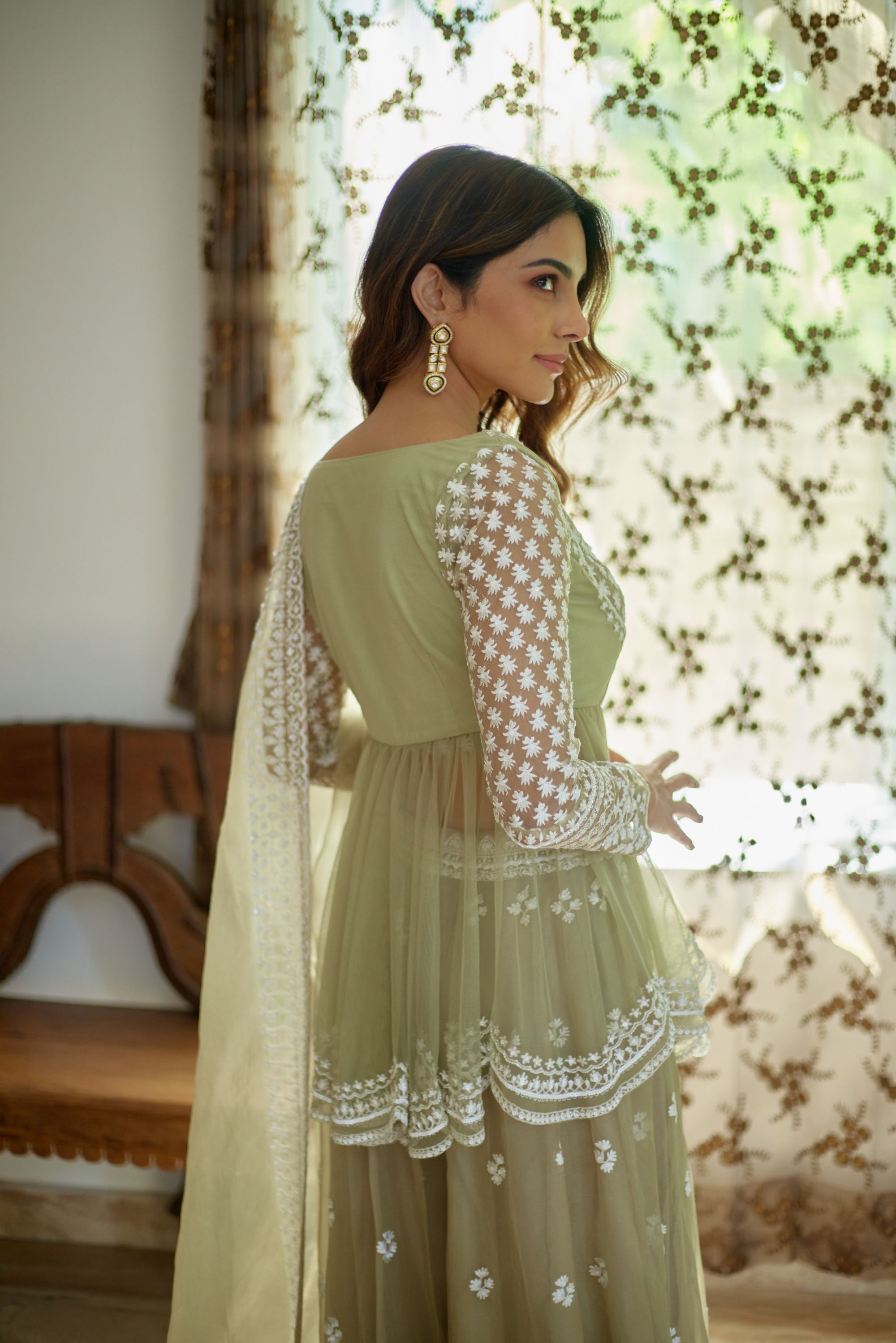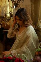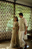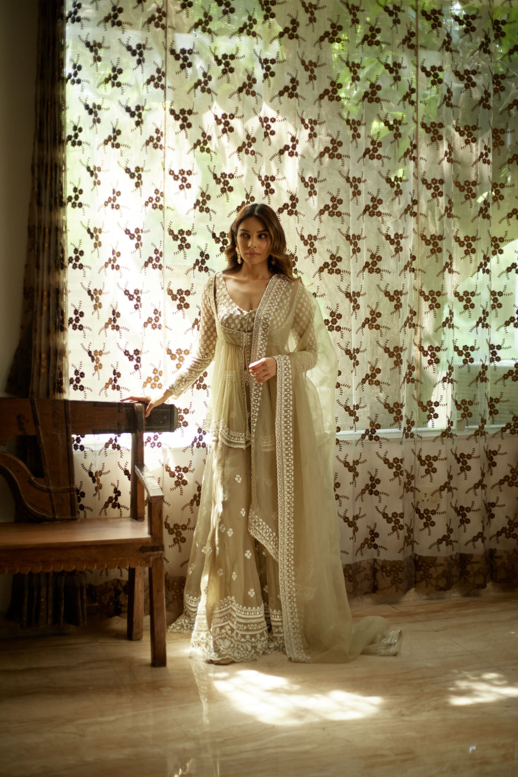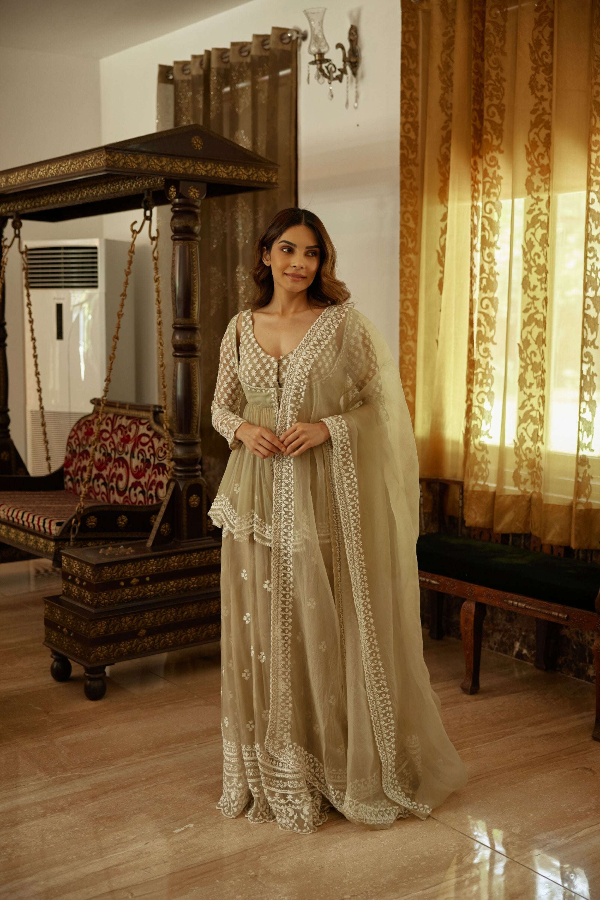 Featuring a Beige with White threadork Peplum set in Organza silk and Net.