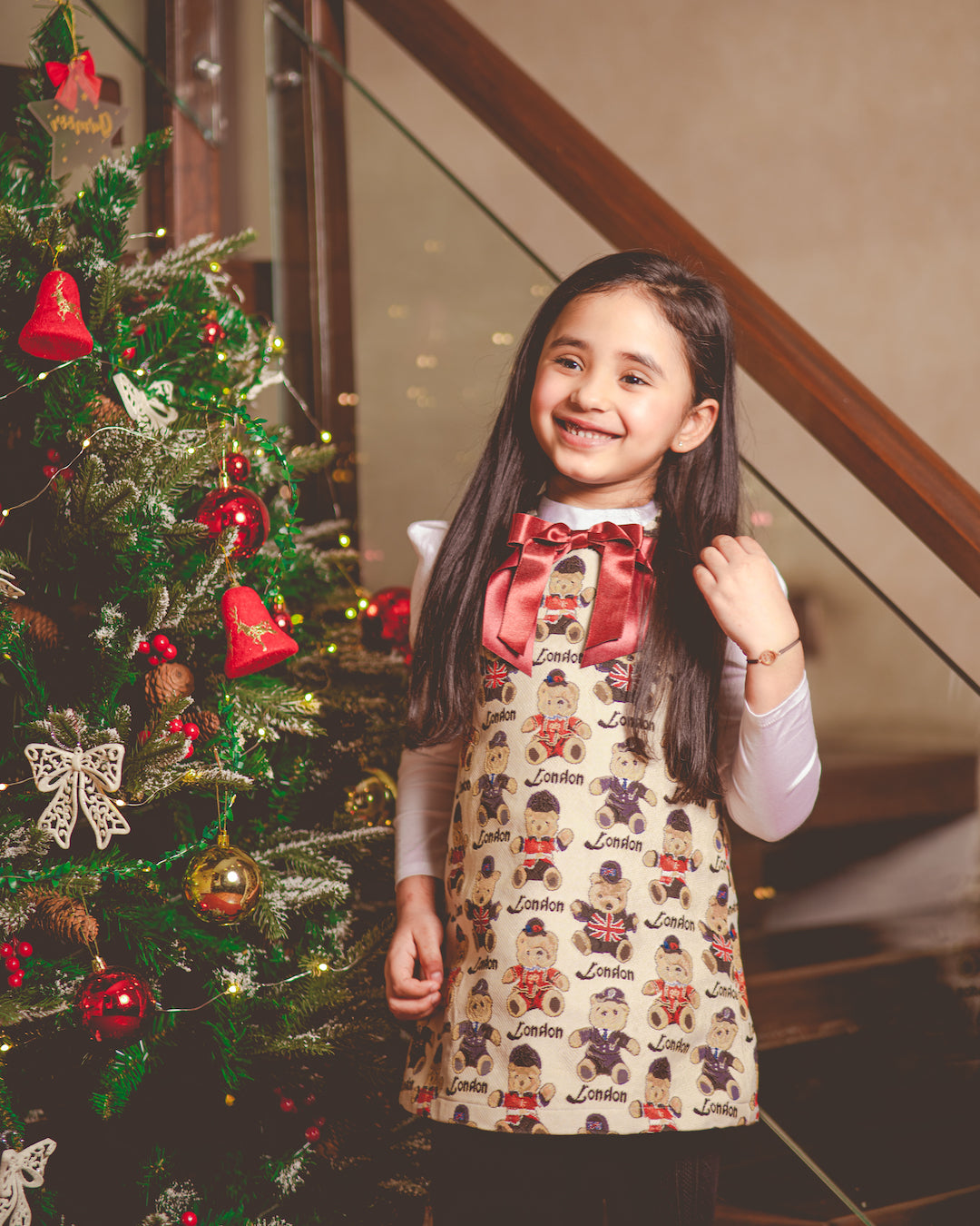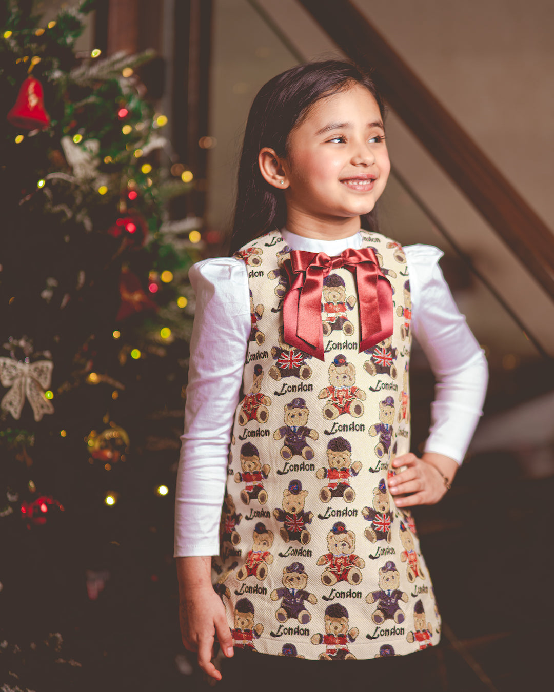 This adorable Pinafore, made in Jacquard fabric is going to be the cutest possession of your doll. Comes with a white high neck, this dress is for keeps.