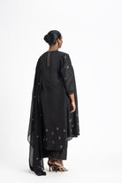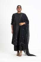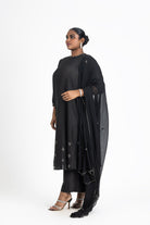 Black Chanderi Kurta Palazzo Set With A Chiffon Dupatta Featuring Gunmetal Embroidery.