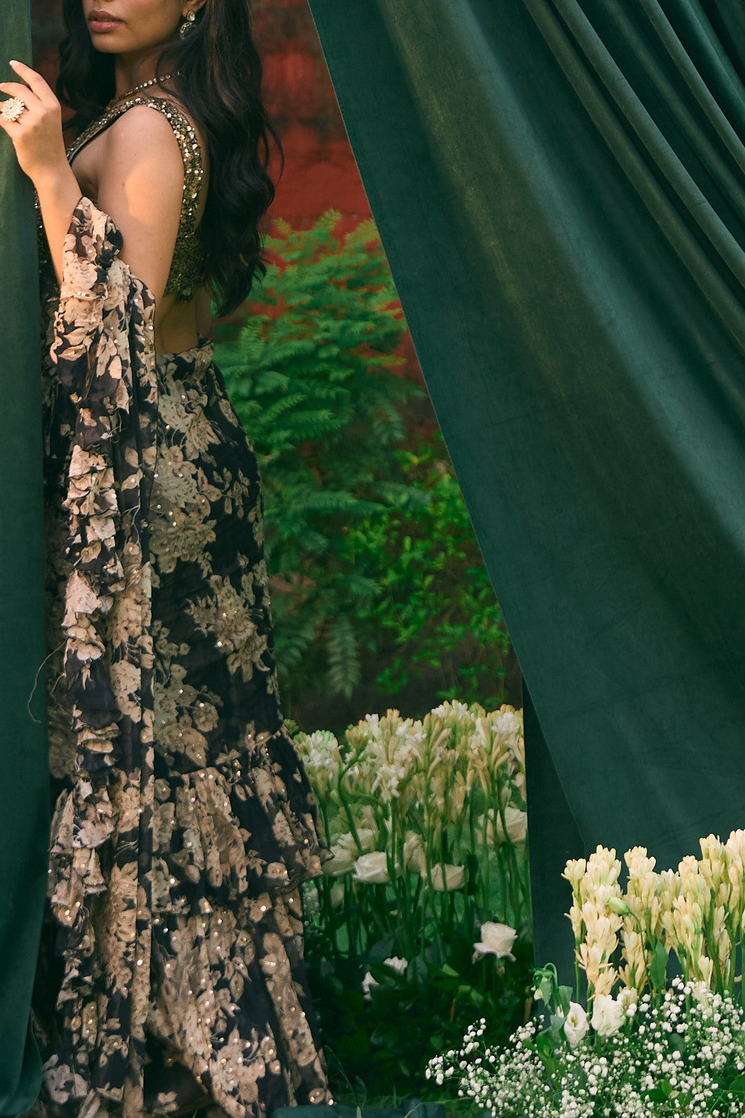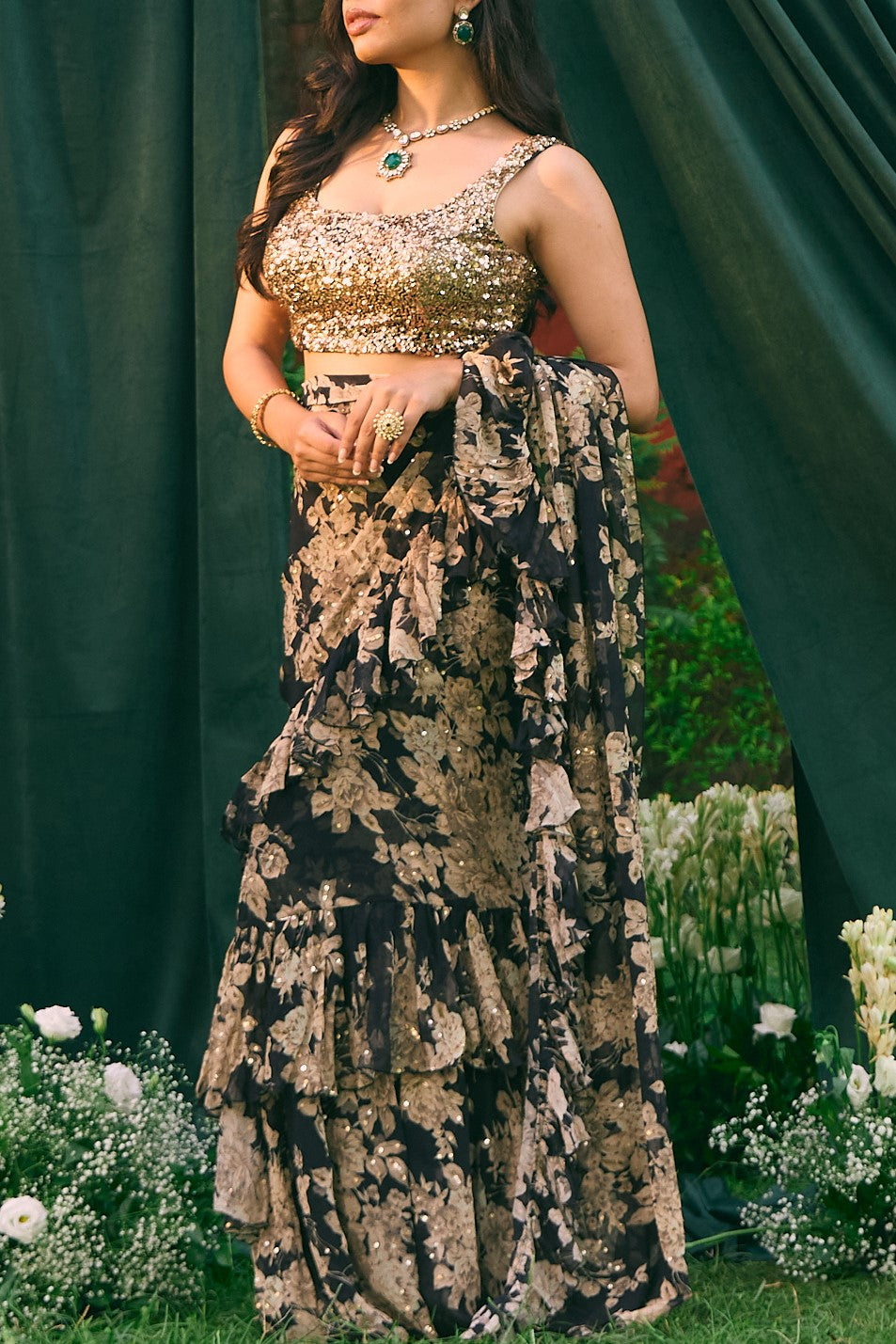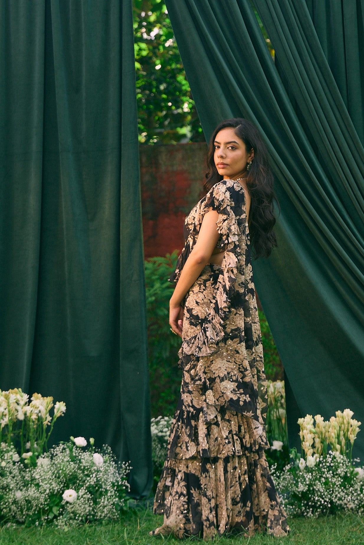 Featuring a Black Chiffon Floral Frill Saree in Chiffon.