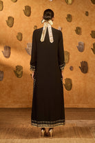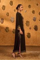 Details: A timeless black kaftan, featuring intricate hand embroidery at the front. Side slits are accented with a foil border and delicate coin detailing, adding subtle shimmer and artisanal charm to the silhouette.
