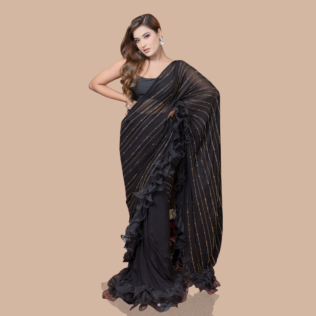 Black drape saree with ruffles and blouse