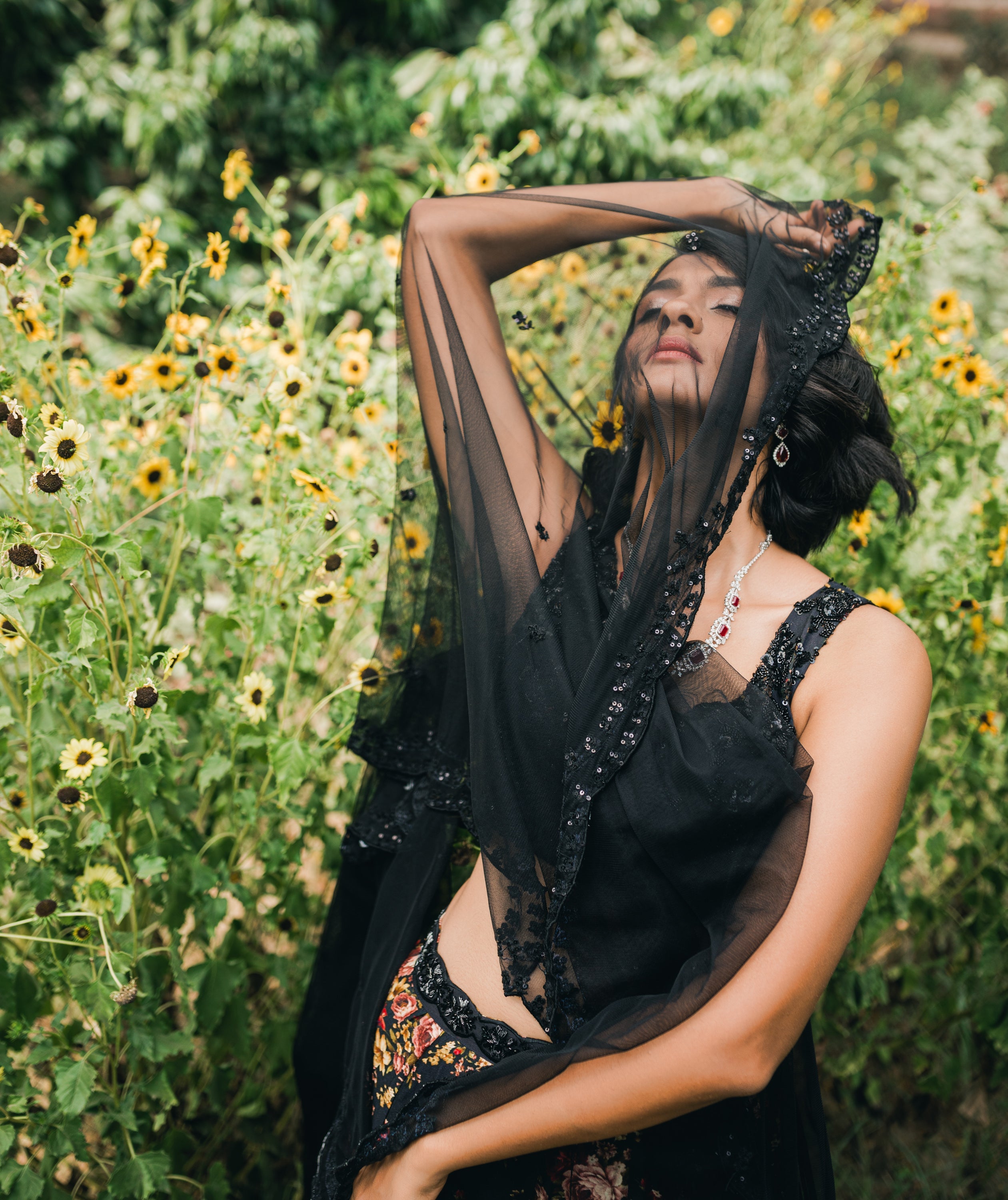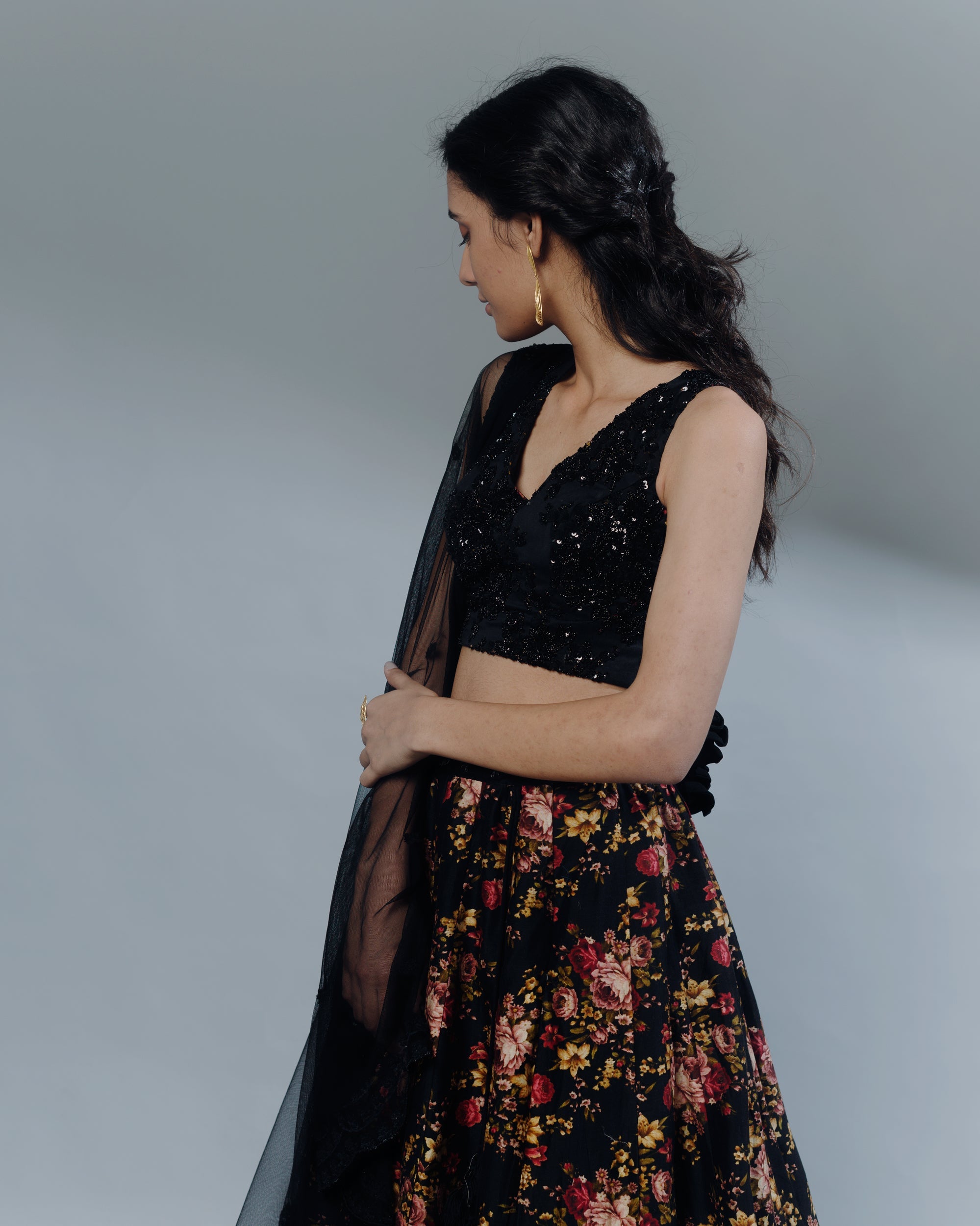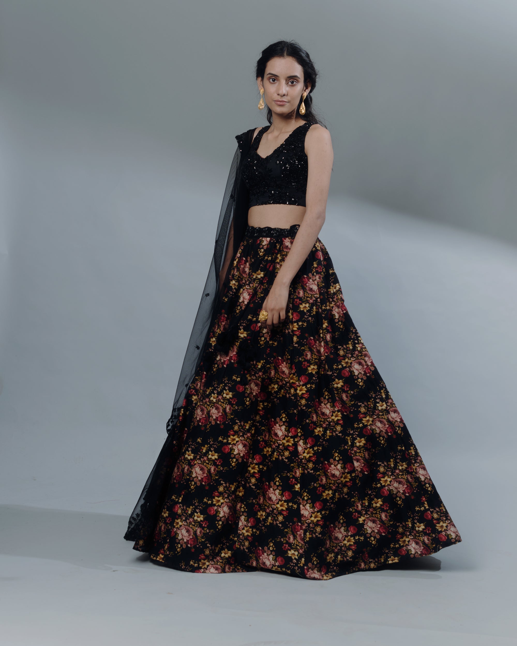 Featuring a BLACK FLORAL LEHENGA SET IN CHANDERI.
