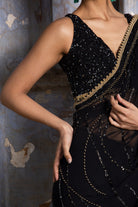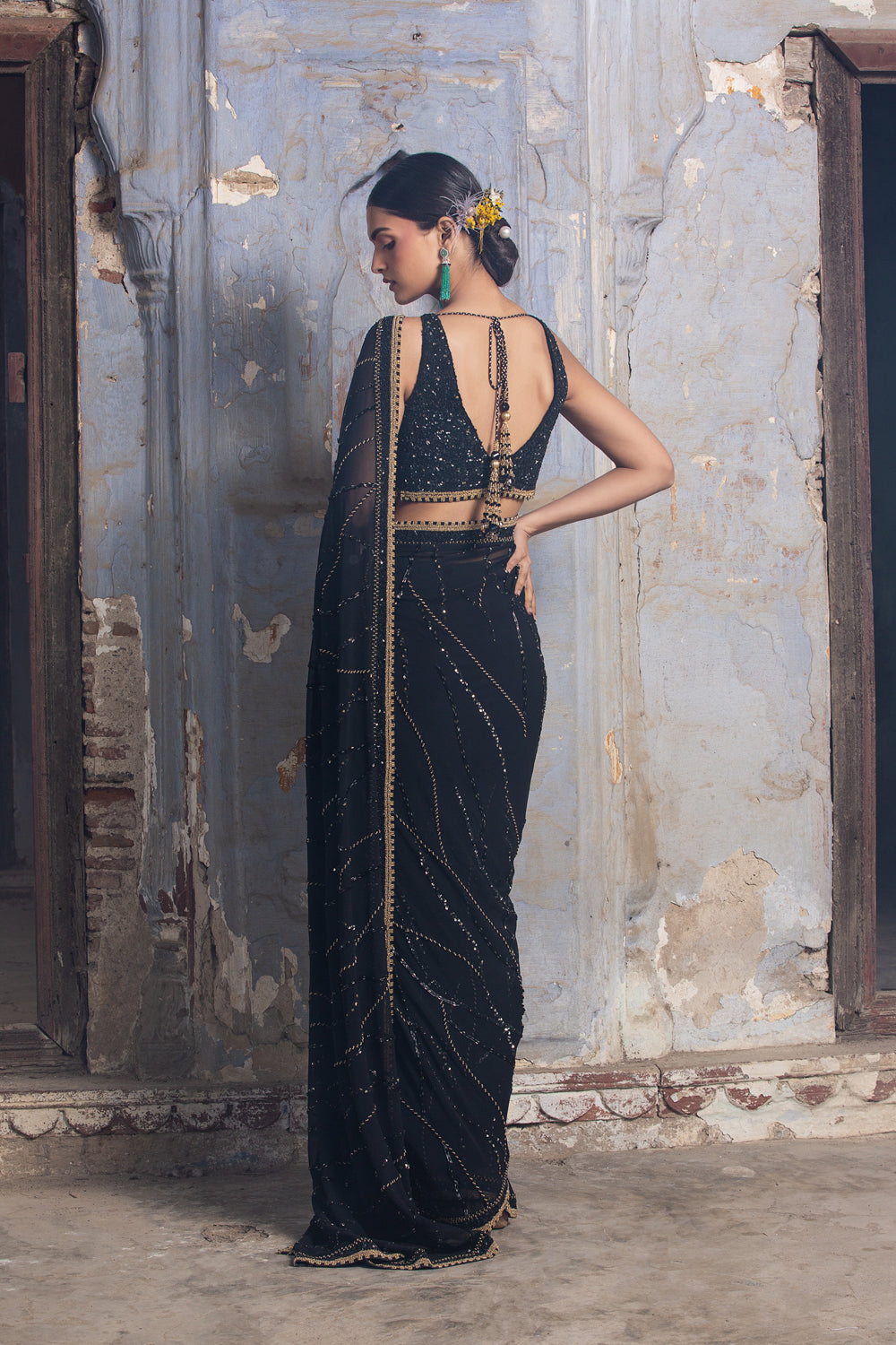 Black Gold Georgette Saree and organza blouse embroidered in tonal beadwork and crystals in an abstract pattern with a gold embroidered border.