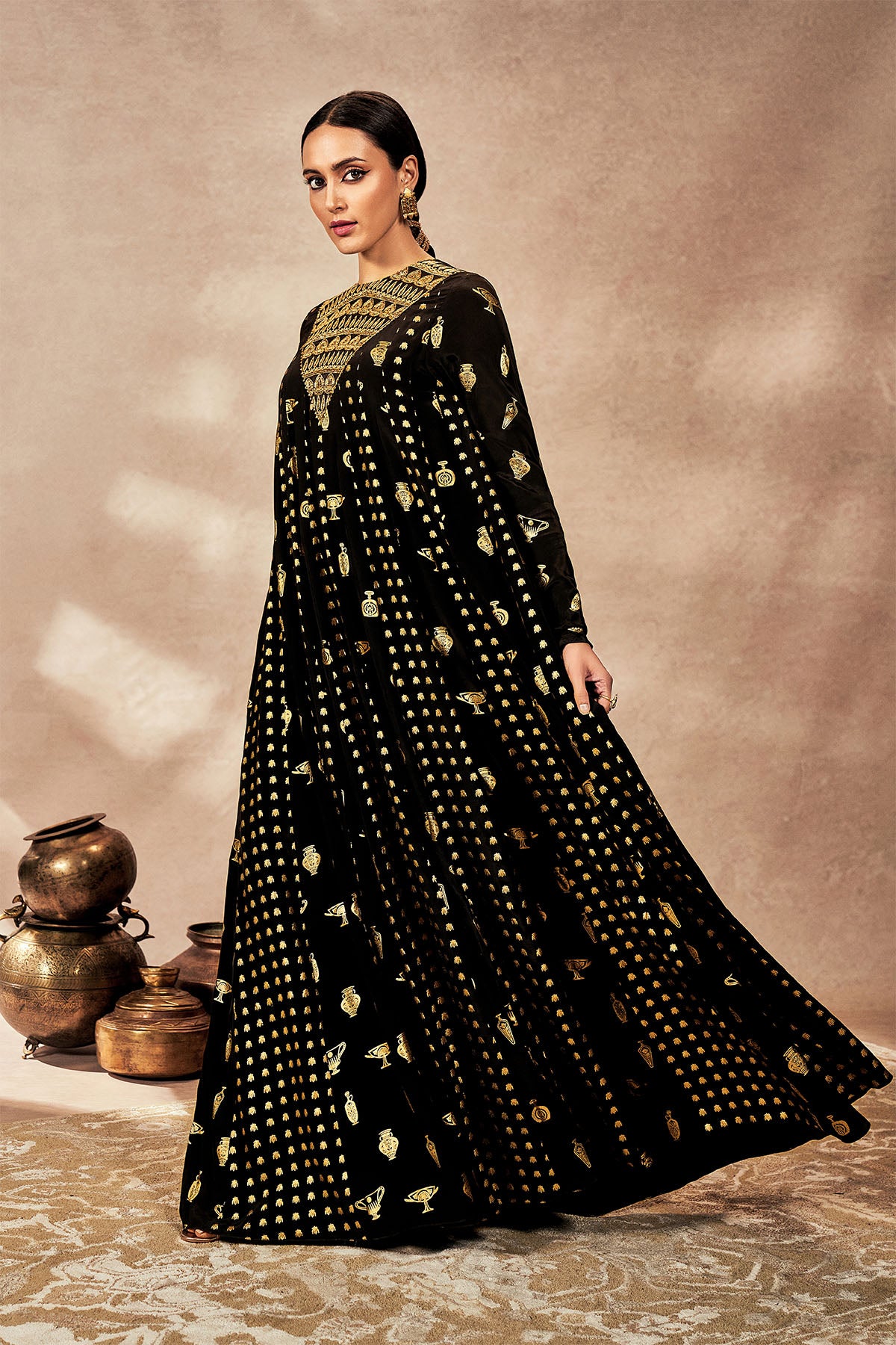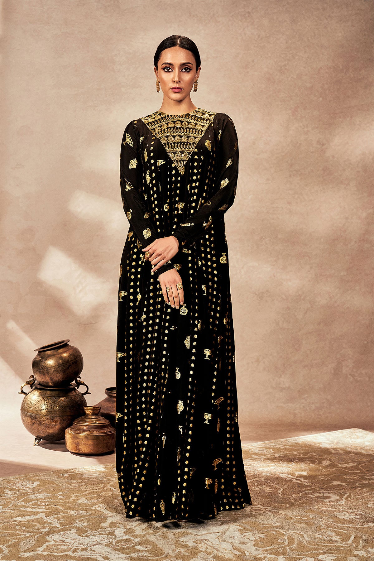 Anarkali- beautiful foil printed anarkali embellished with embroidered yoke and kinari | Full sleeves | Round neckline | Center back opening dupatta- georgette dupatta is embellished with embroidered border and edged with kinari.