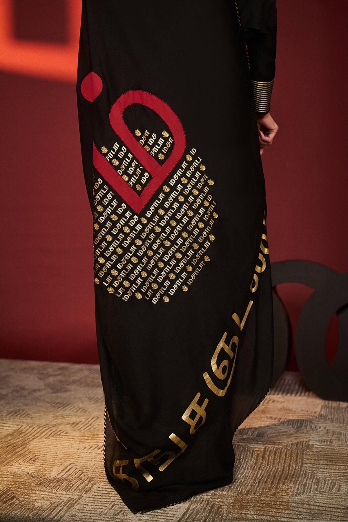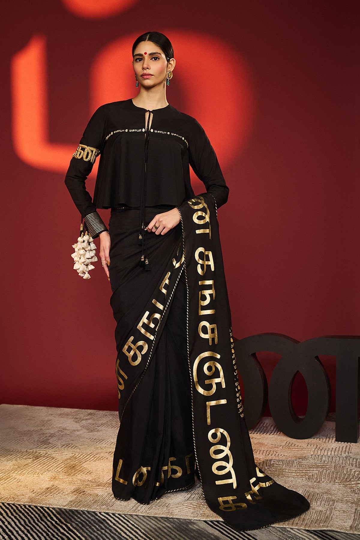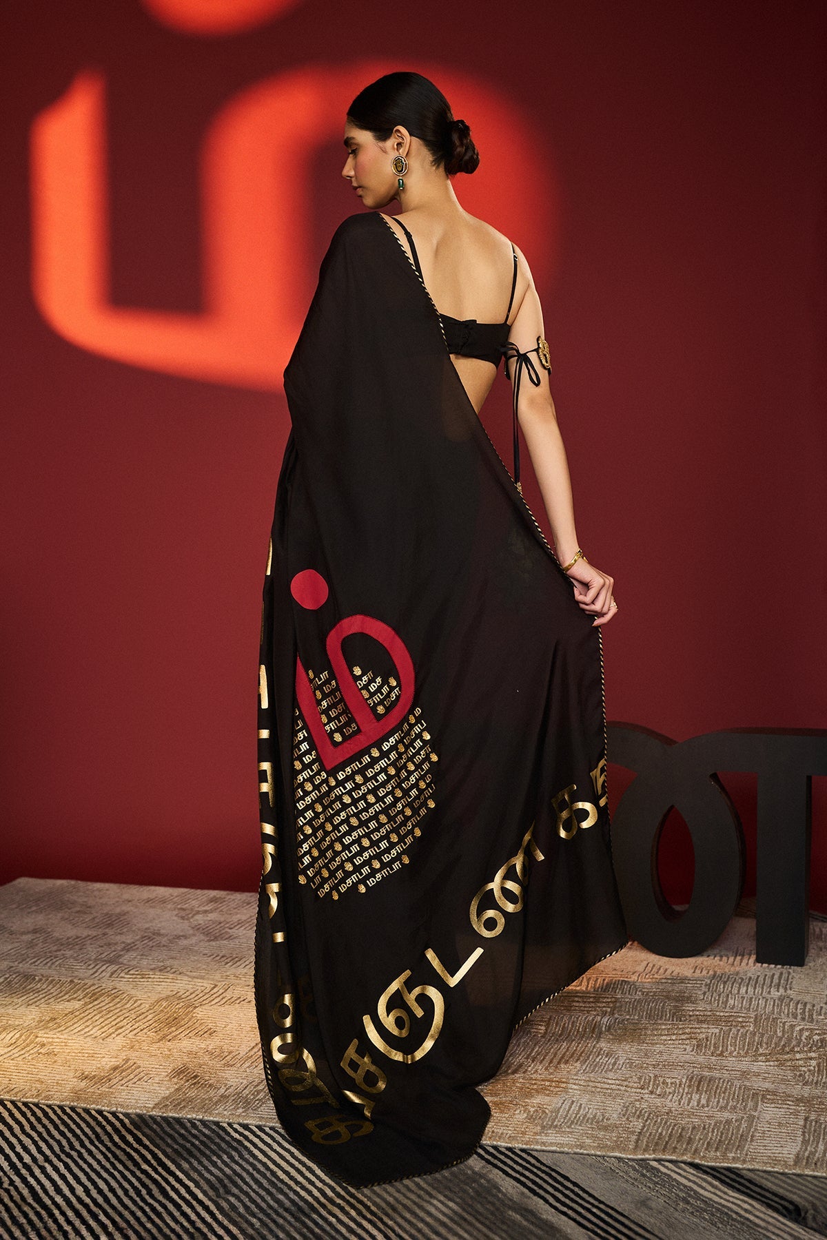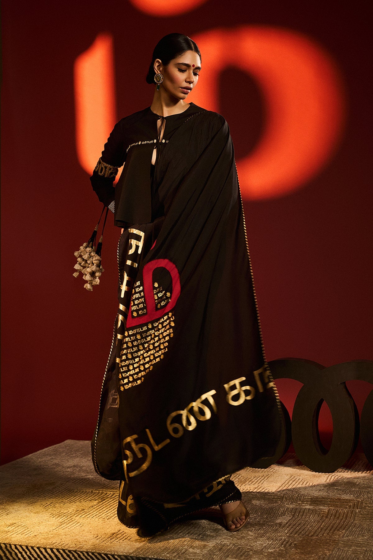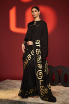 Saree with blouse piece- Black Madras Muse is a statement saree crafted in luxurious mul silk, adorned with opulent gold foil print and hand-embroidered detailing. A bold red Tamil letter commands attention on the palla, while Masaba and Palm motif repeat elegantly in a circular emblem. Foiled Tamil script lines the border like poetry in motion, finished with sharp pinstripes piping and a coordinated mul silk blouse. An ode to heritage, reimagined with contemporary elegance.