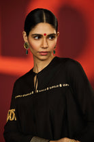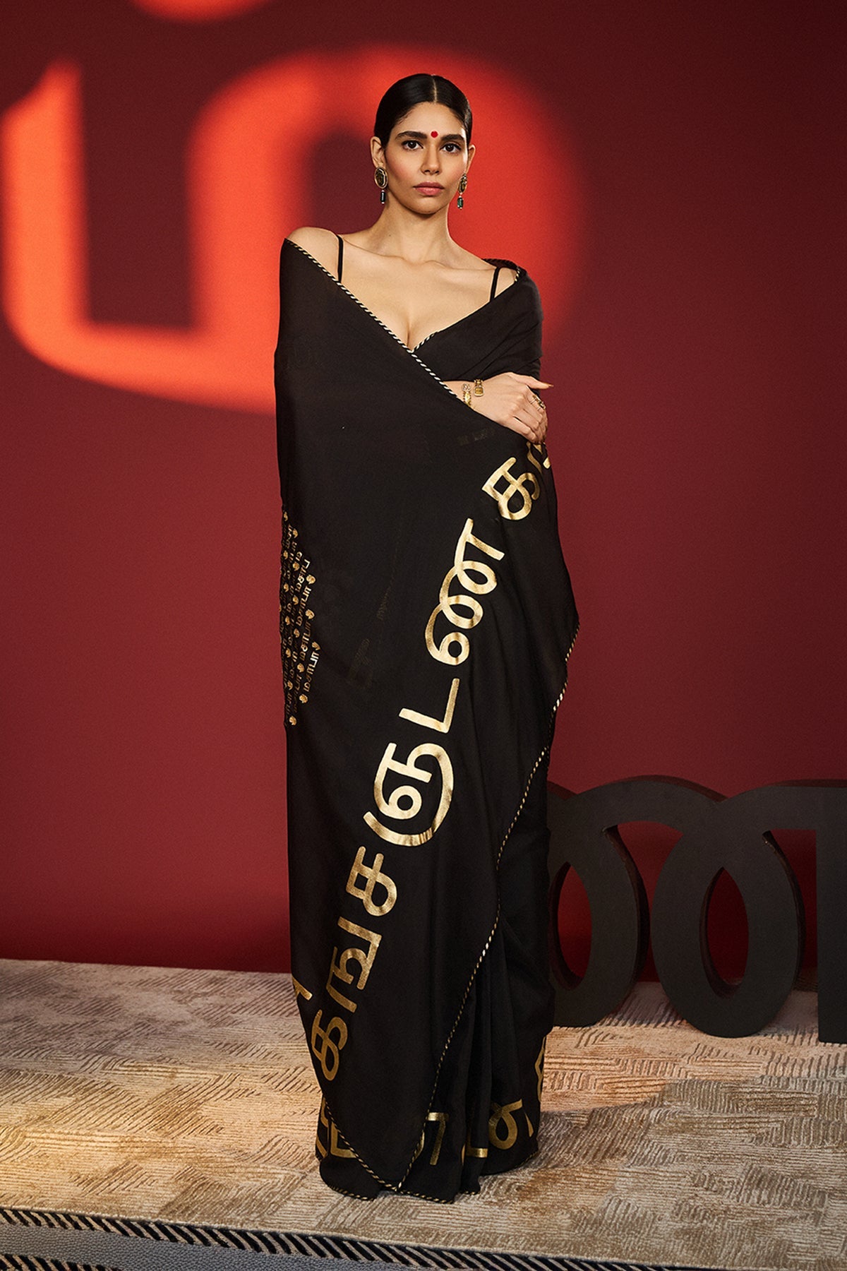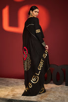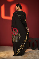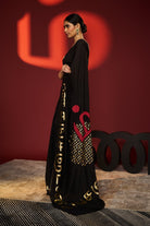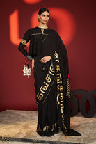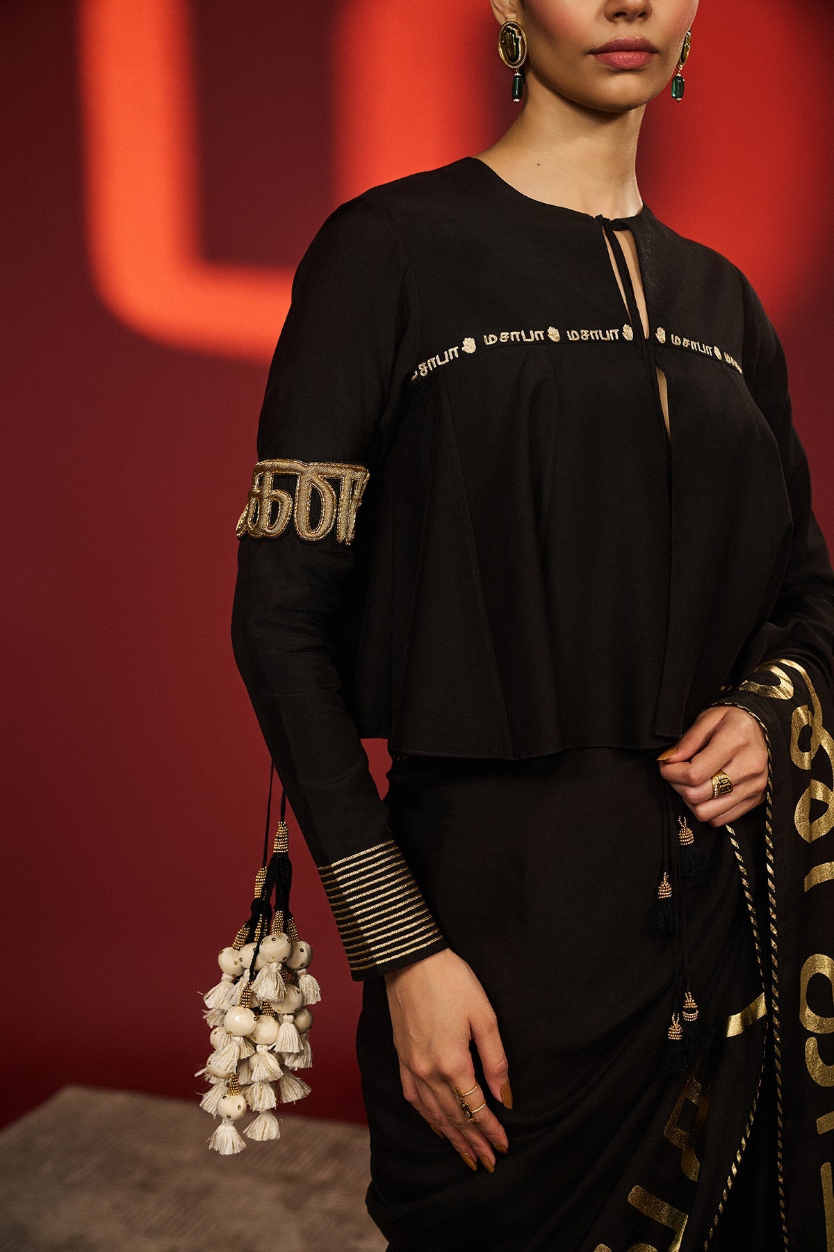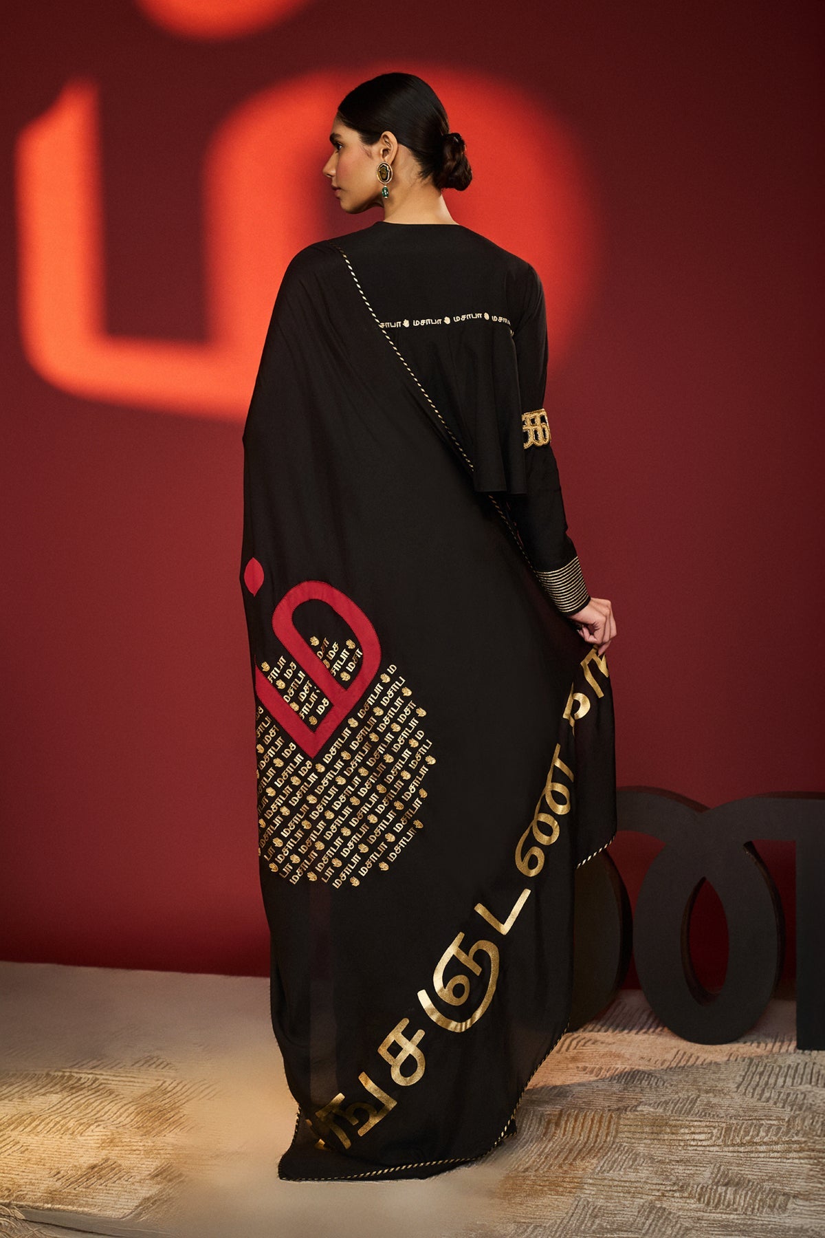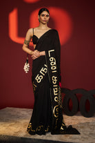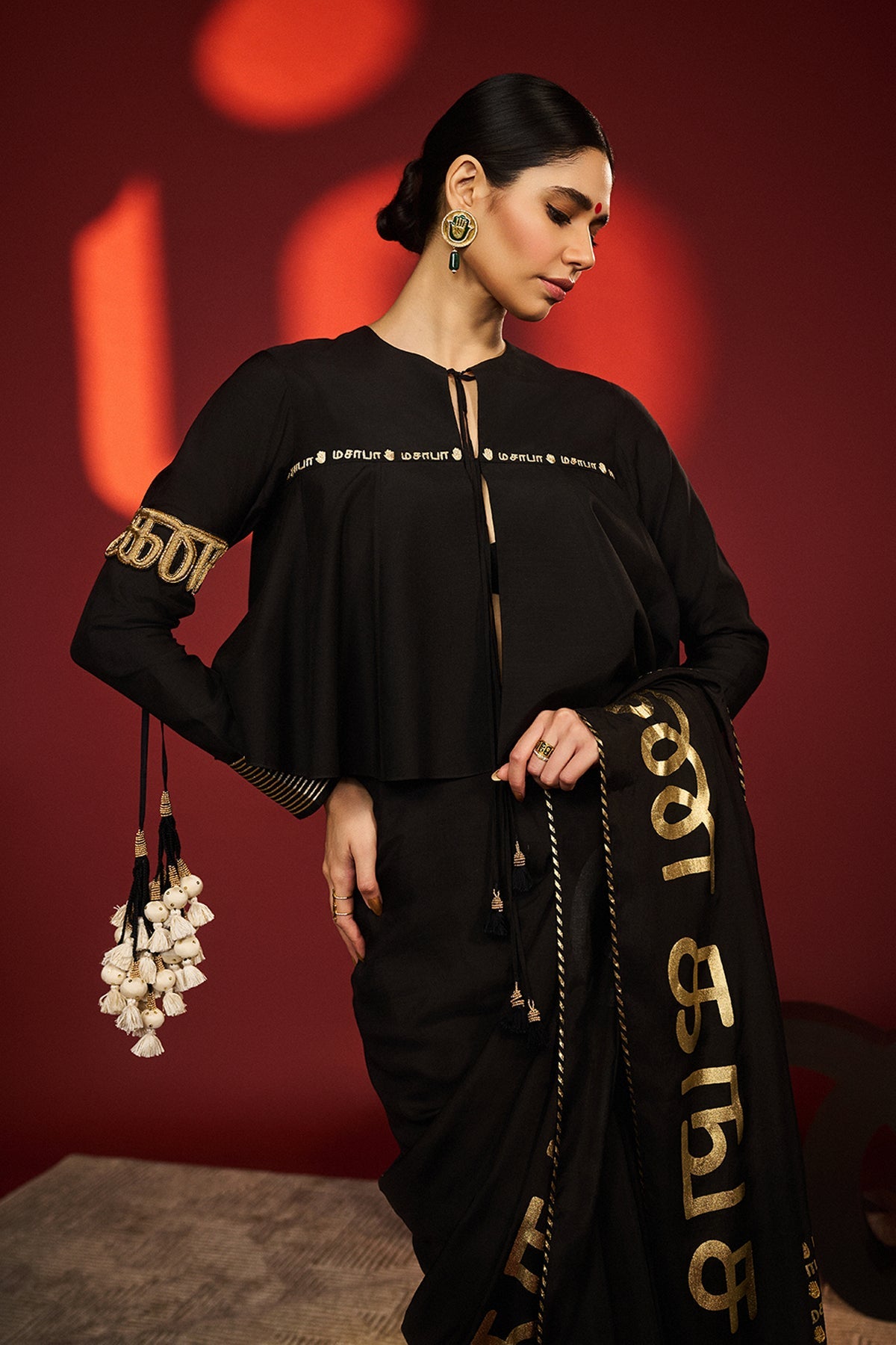 Saree with blouse piece- Black Madras Muse is a statement saree crafted in luxurious mul silk, adorned with opulent gold foil print and hand-embroidered detailing. A bold red Tamil letter commands attention on the palla, while Masaba and Palm motif repeat elegantly in a circular emblem. Foiled Tamil script lines the border like poetry in motion, finished with sharp pinstripes piping and a coordinated mul silk blouse. An ode to heritage, reimagined with contemporary elegance.