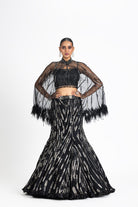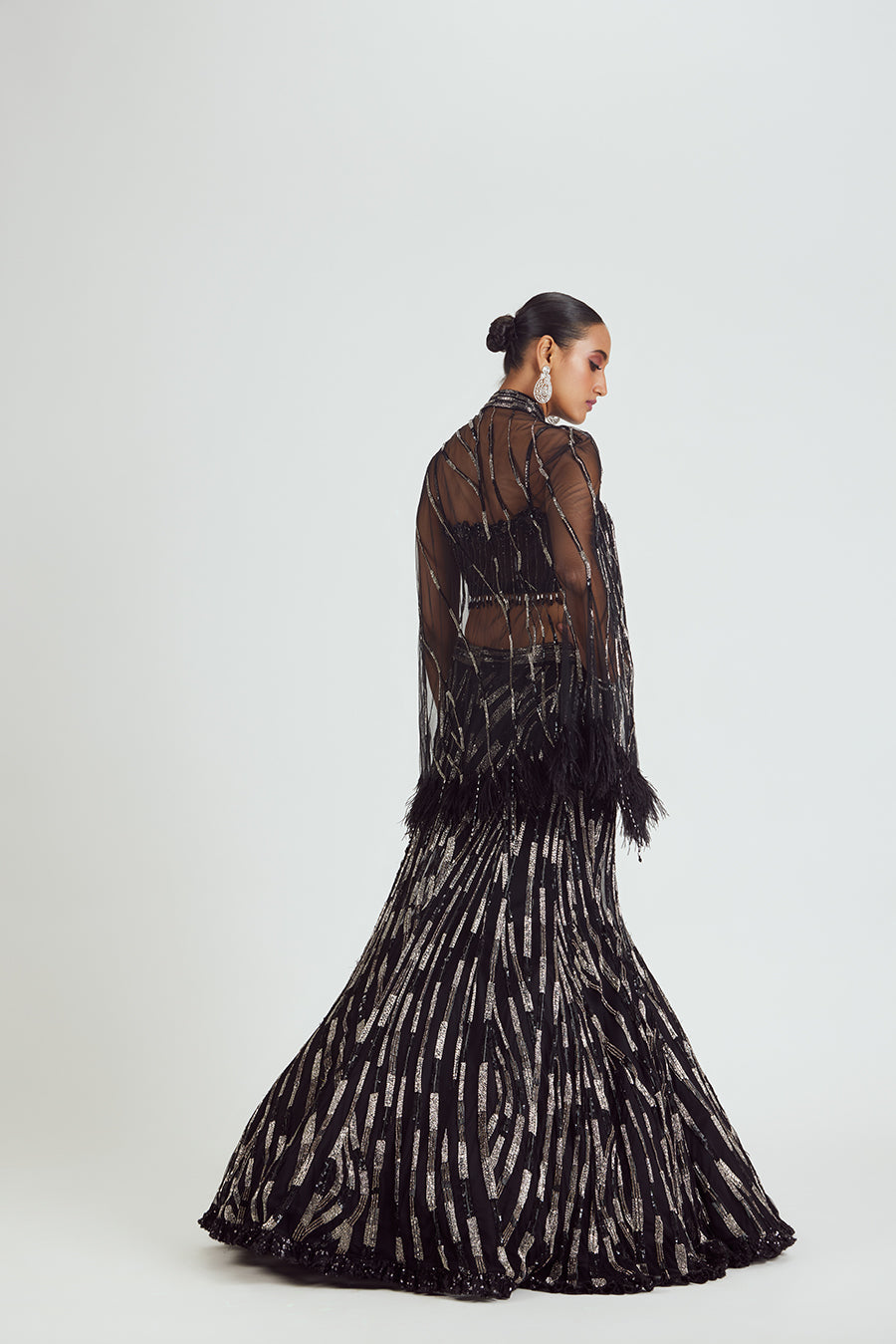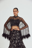 Black Net Fishtailed Skirt And Blouse With A Cape Embroidered In Black And Silver Metallics, Beads, And Crystals, Featuring Black Feather Trims.