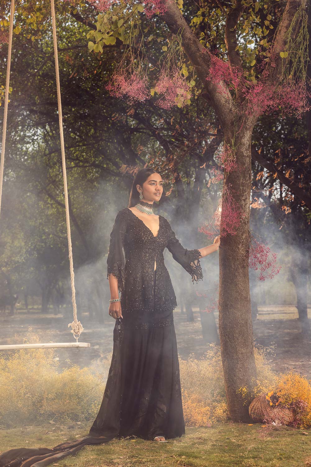 - Fabric: Black Organza Peplum Top And Dupatta With Satin Garara And Bustier