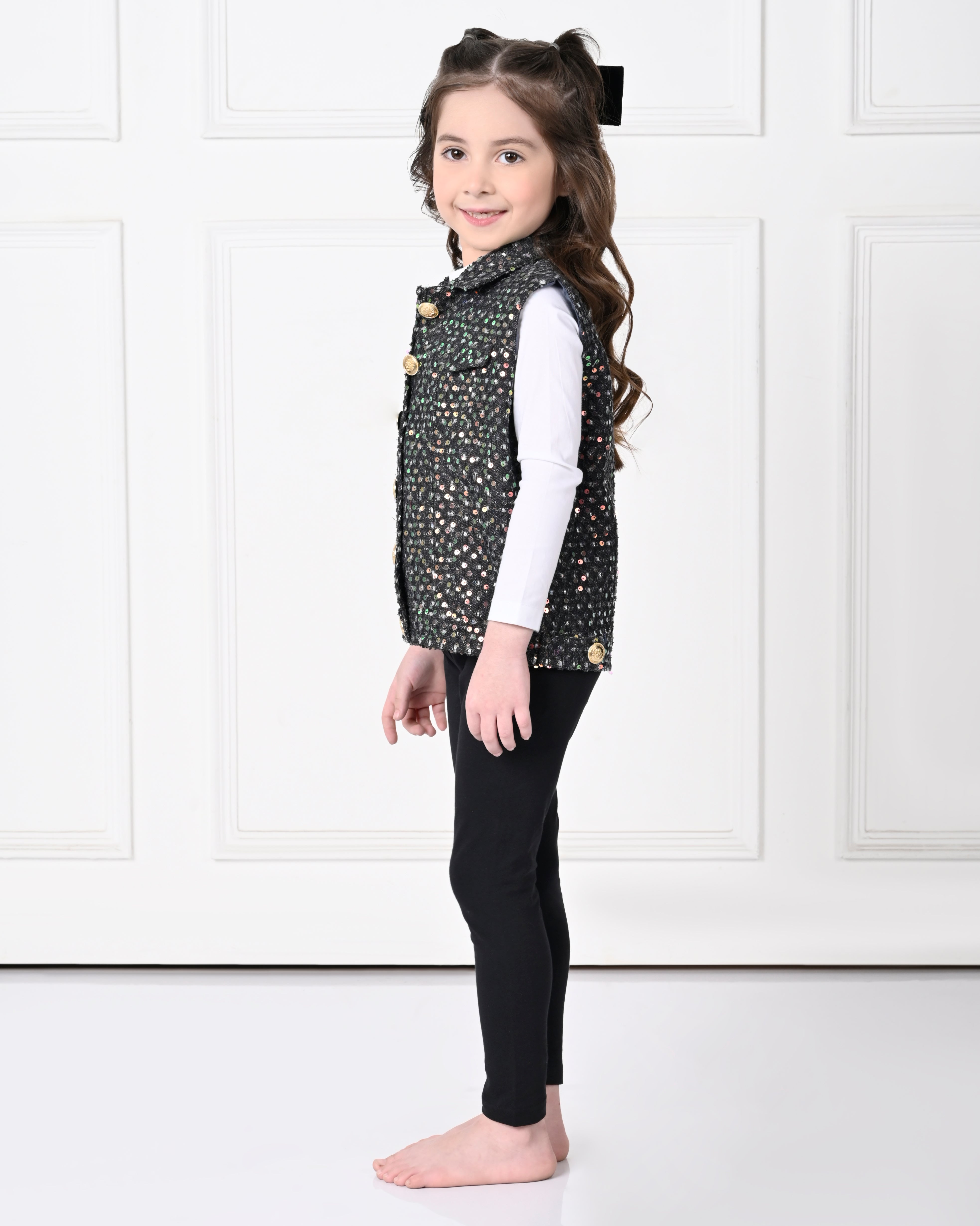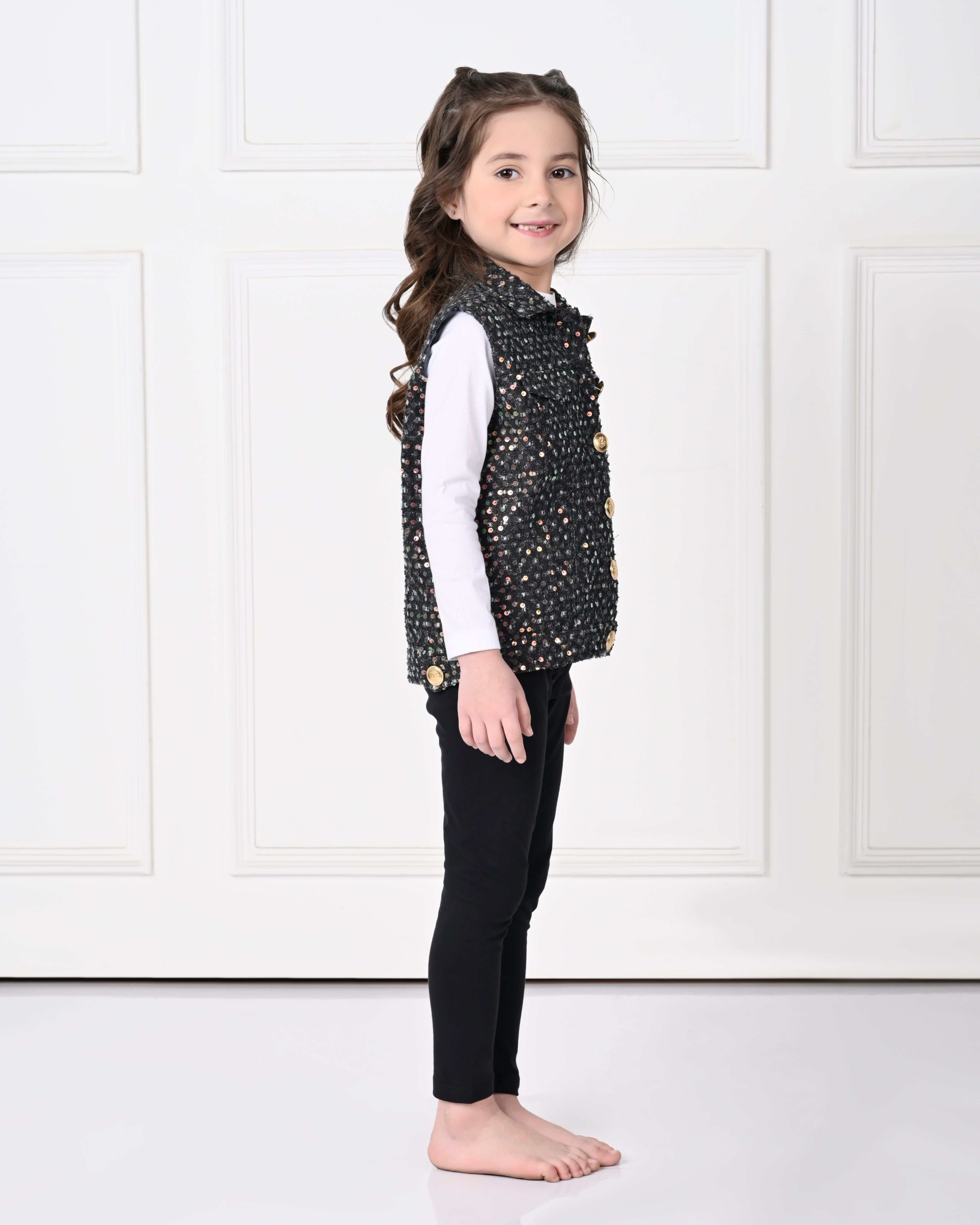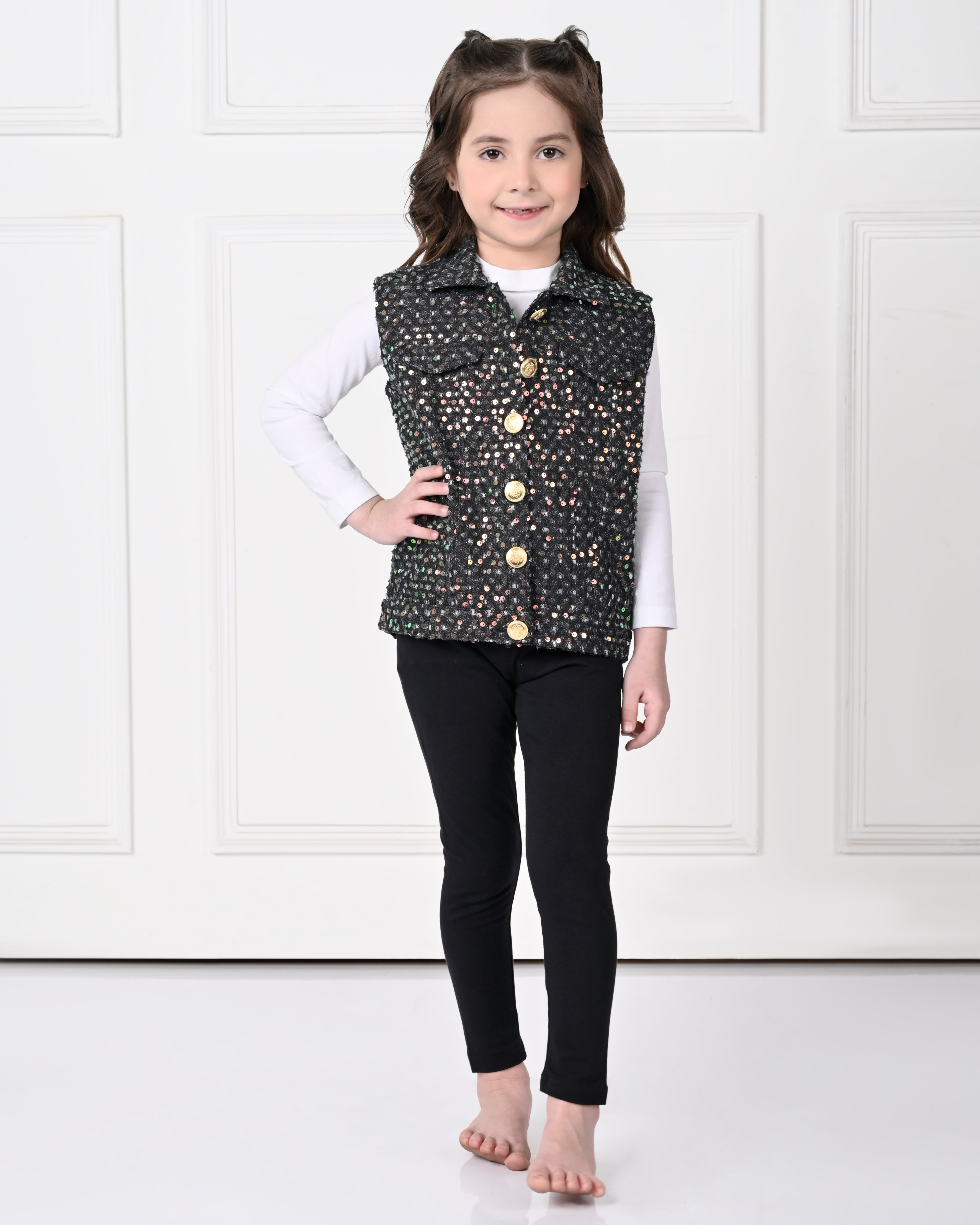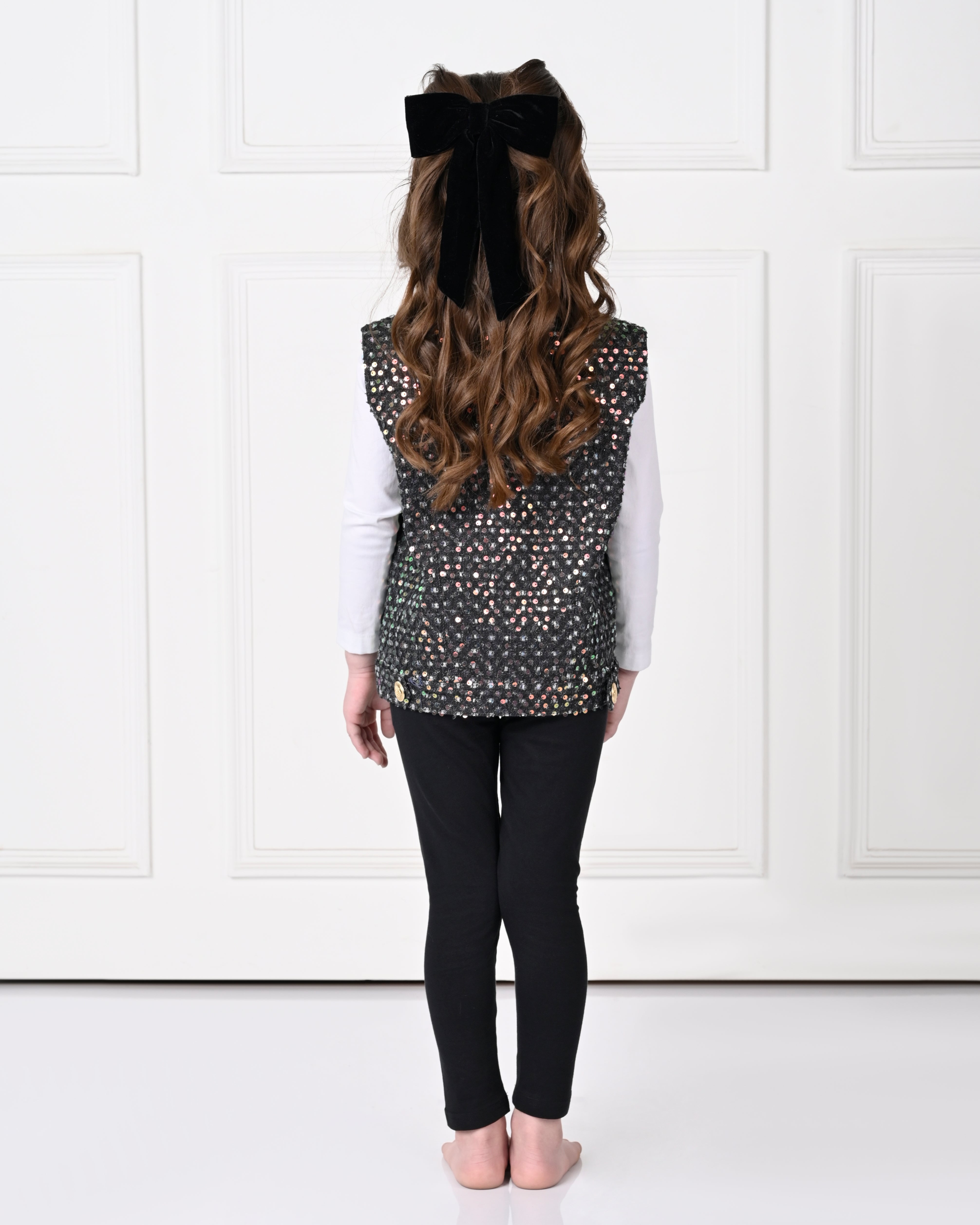 This Black Over Size Sleeveless Sequence work Jacket is designed for ultimate comfort and style. Made with high-quality materials, it offers a sophisticated and professional look, perfect for the workplace. With its oversized design and sleeveless cut, it allows for easy movement and breathability. Take your work attire to the next level with this statement piece.
