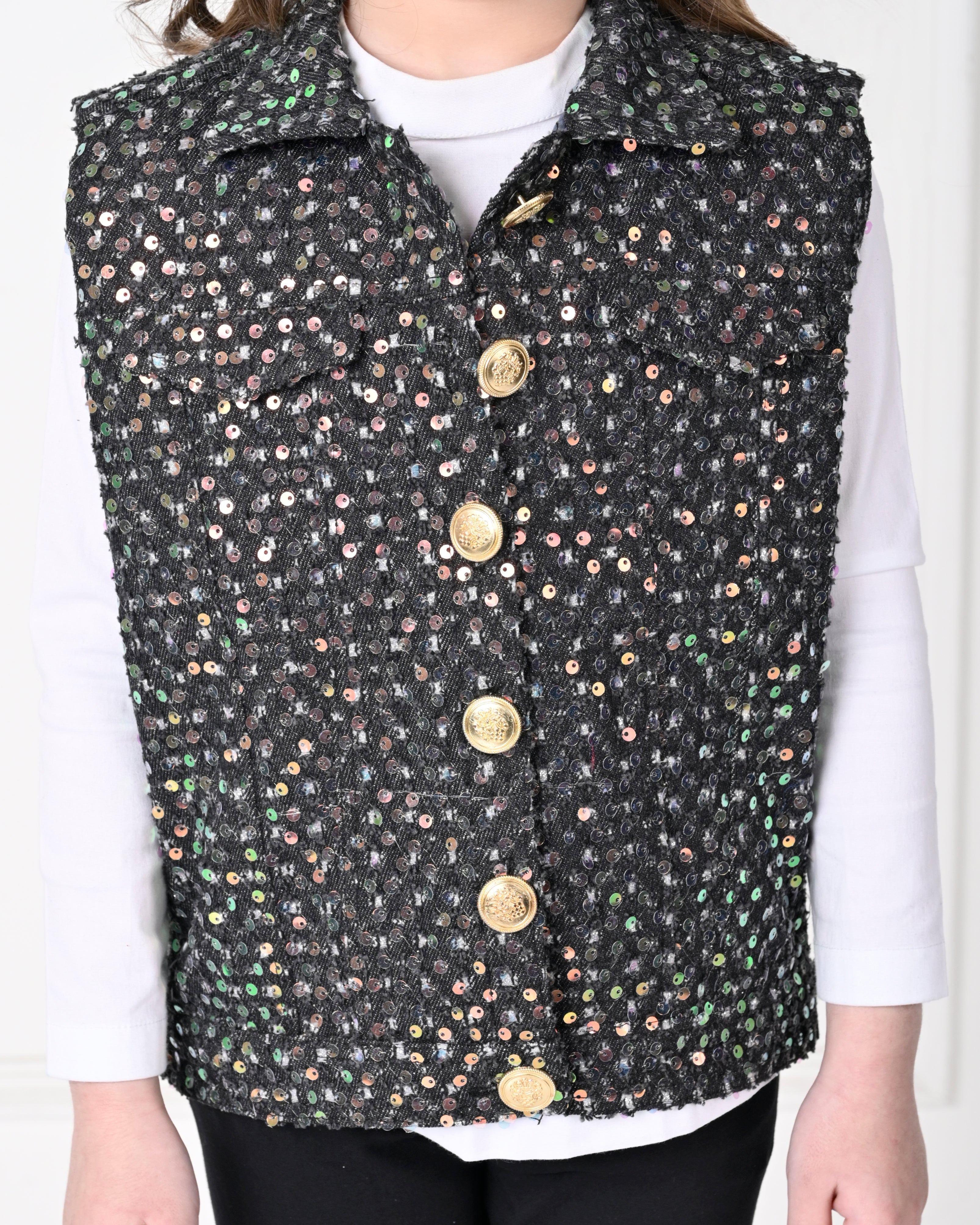 Black Over Size Sleeveless Sequence work Jacket