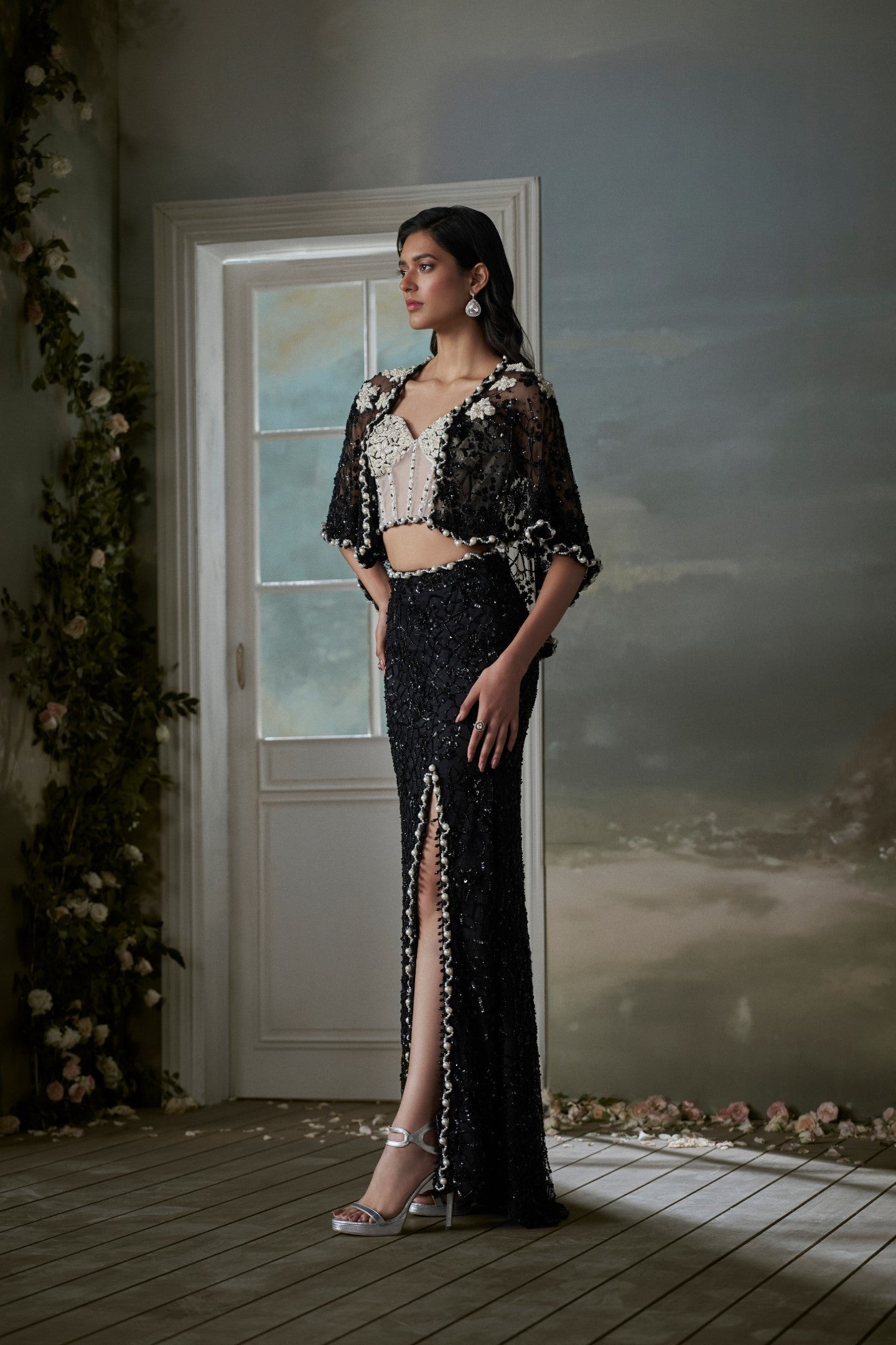 Black skirt with front slit paired with an ivory corset and a black short jacket embellished with pearlwork.