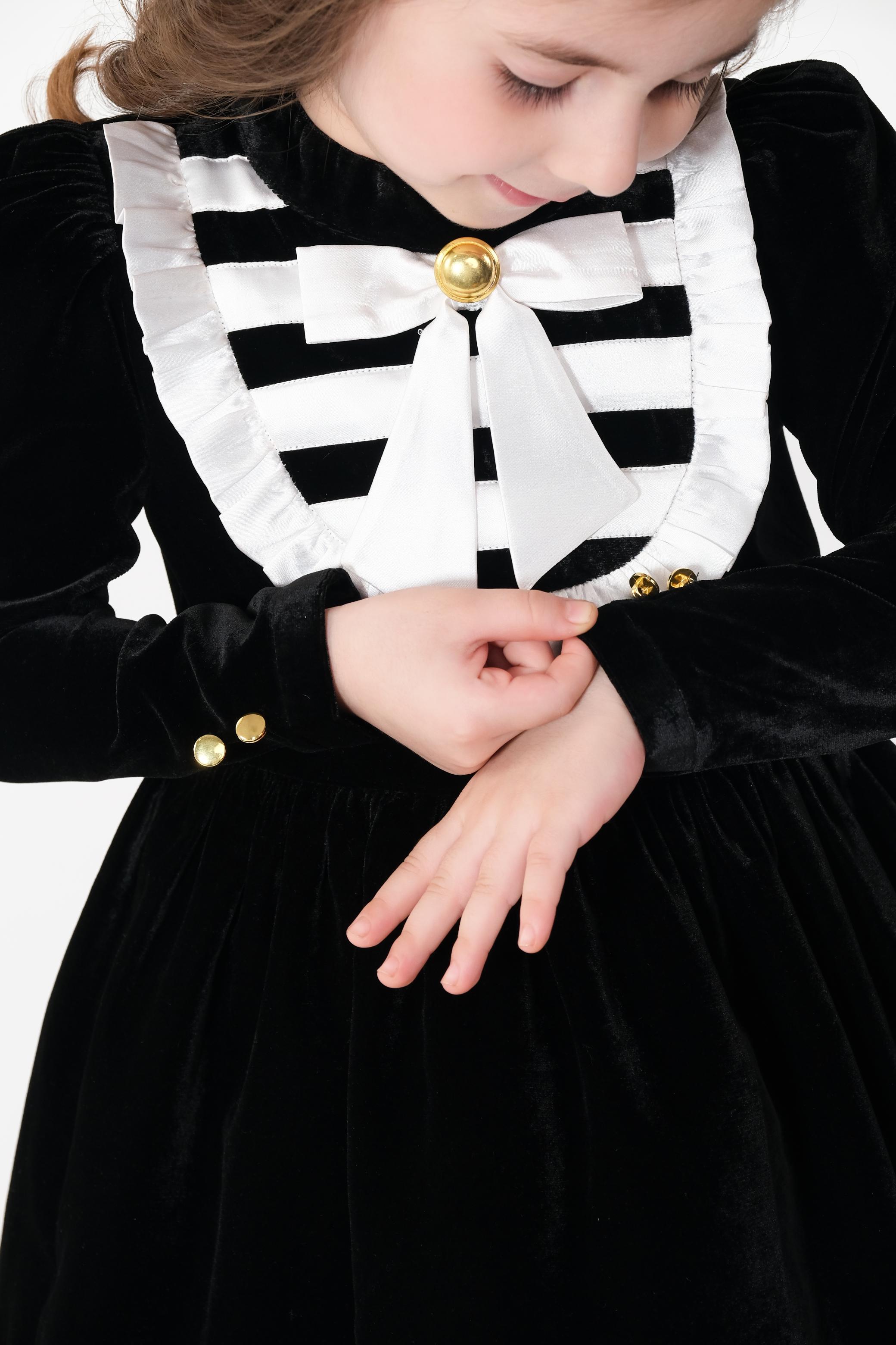 - Yok embellished with white satin appliques, a bow and gold buttons