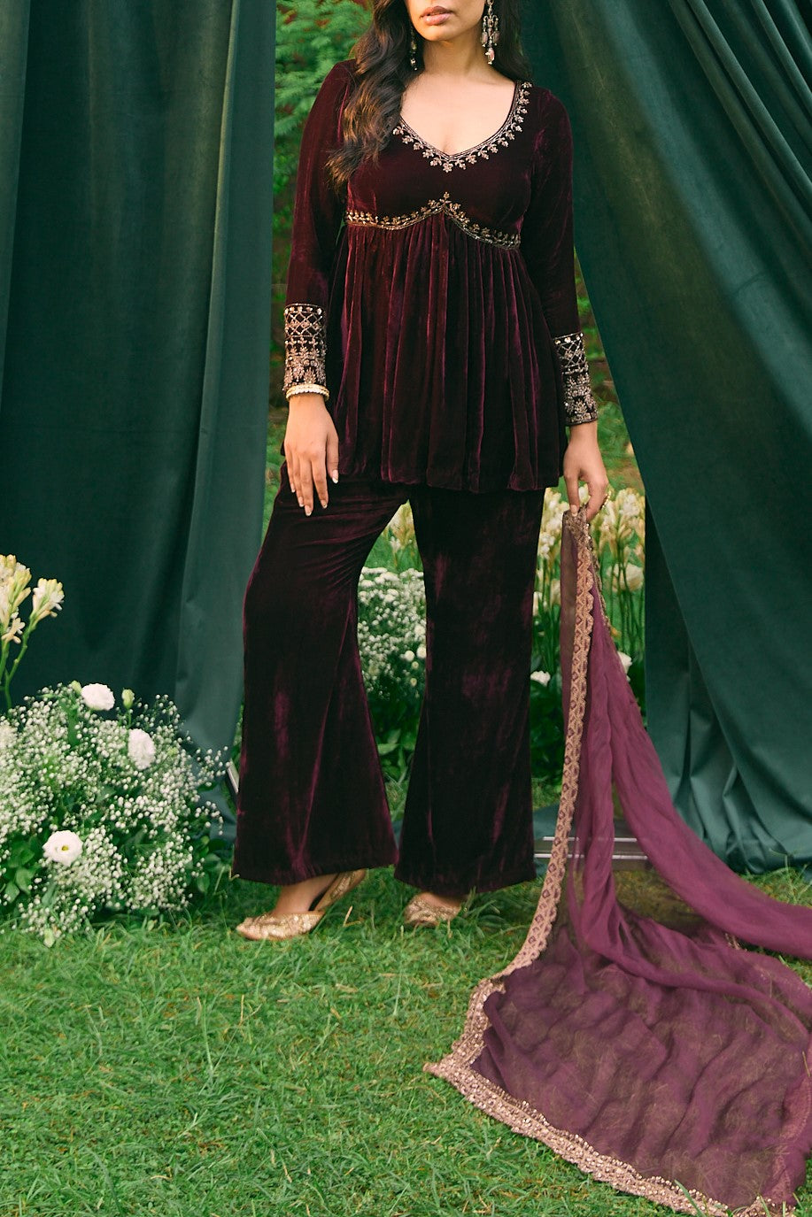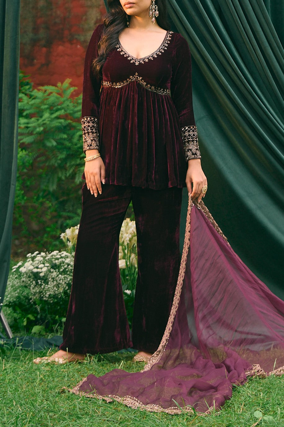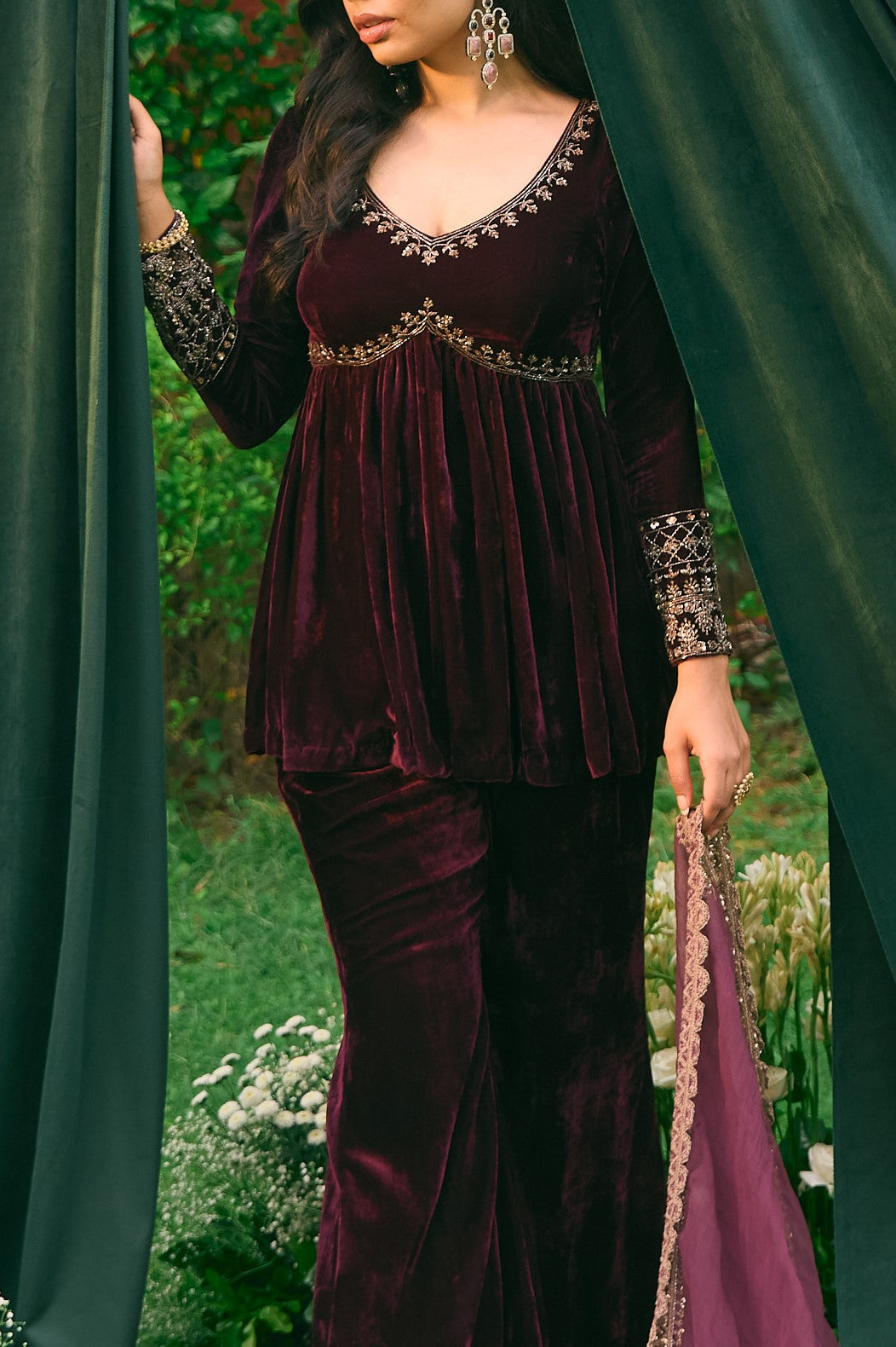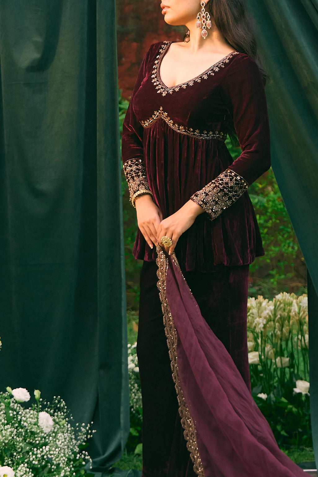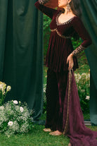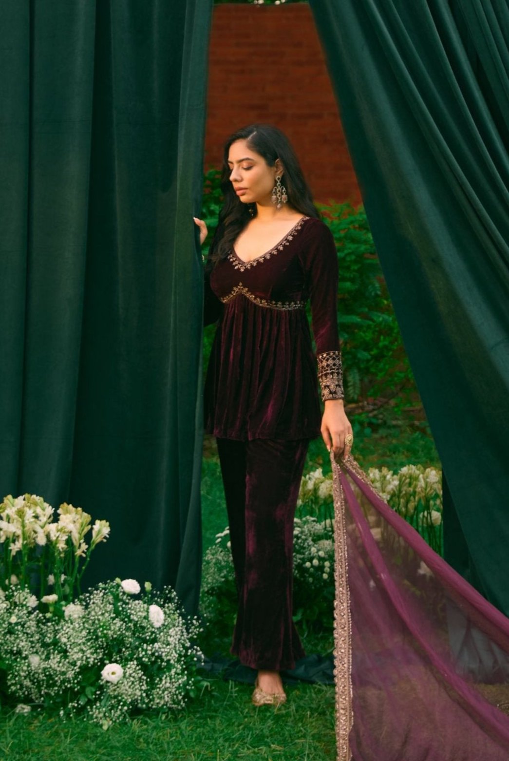 Featuring a Black Emblished Peplum and Sharara Set in Velvet.