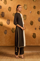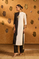 Details: Kurta- Straight half and half kurta adorned with beautiful gold embroidery motif at the front |Round neckline | Center back closure | Sleeves embellished with foil printed borders | Pinstripes printed backing detail Pant- Black straight pants with Cheery foil print placement | Embellished with gold printed borders | Side seam closure