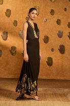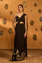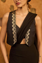 Details: Jacket- Cropped jacket adorned with foil printed border with sequin highlight Stitched Saree- Beautiful Zen foil printed pre stitched saree with center back enclosure | Comes with foil placement print pallu Blouse- Blouse with crossover neckline | Comes adjustable straps | Center back opening