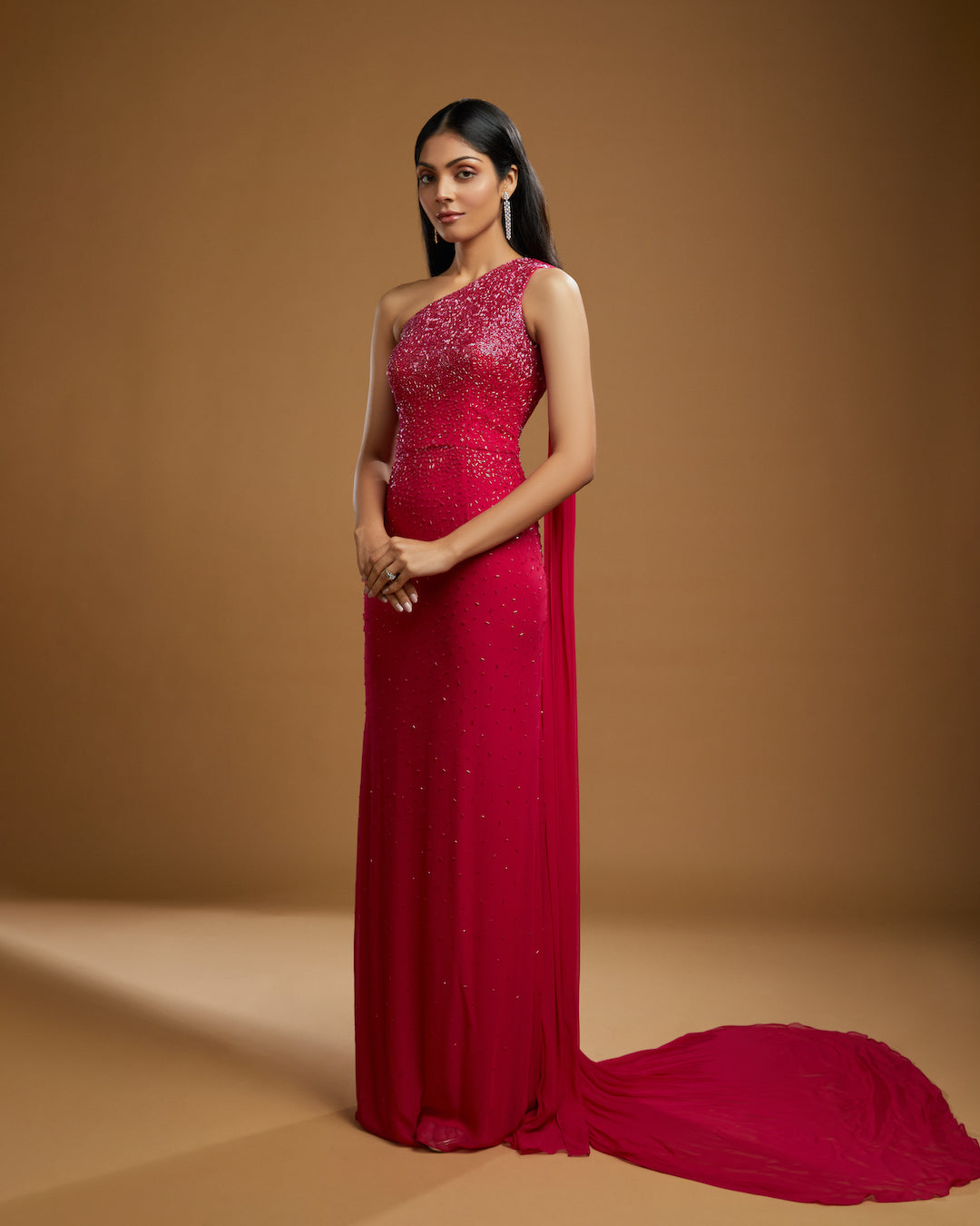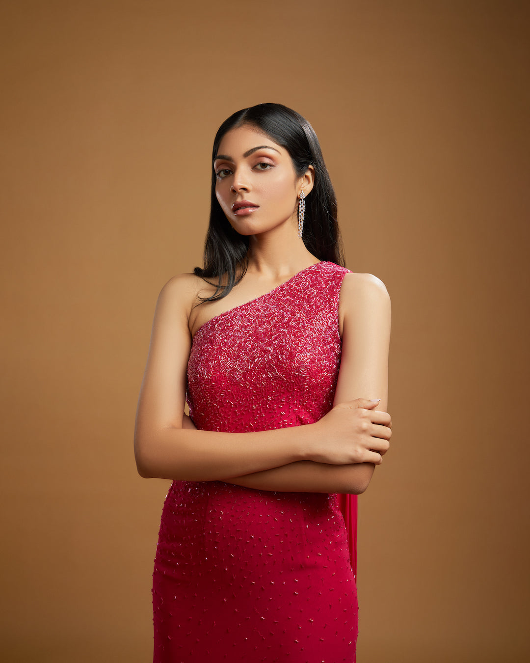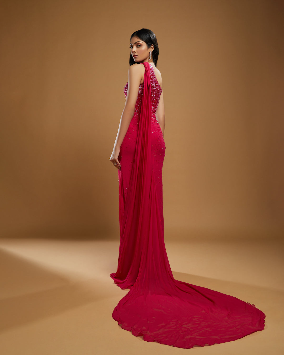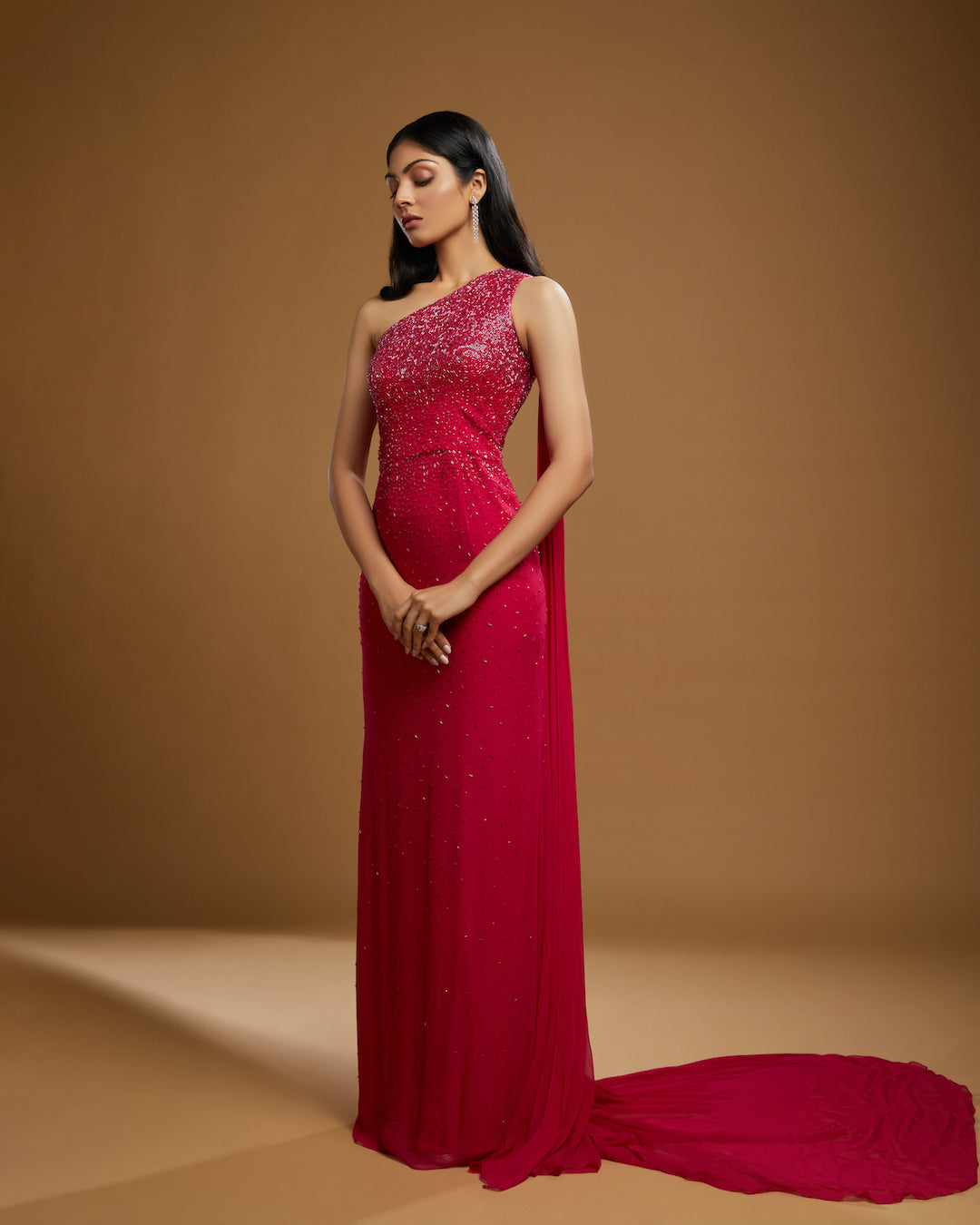 Blanche is our fuchsia pink georgette full-length one-shoulder gown embellished with an ombre technique of hand-done embroidery with glass beads. Along with an attached drape on the shoulder & a long trail on the bottom.