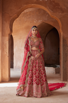 Blood red raw silk lehenga choli set with a worked belt and net dupatta, embroidered in a traditional jhoomar pattern with gold dabka, kasab, sequins, bead work and crystals. The ensemble can be paired with an additional embroidered net head veil .