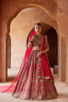 Blood red raw silk lehenga choli with a net dupatta embroidered with antique kasab, dabka, sequins beads and crystals. The ensemble can be accessorised with an additional embroidered net veil.