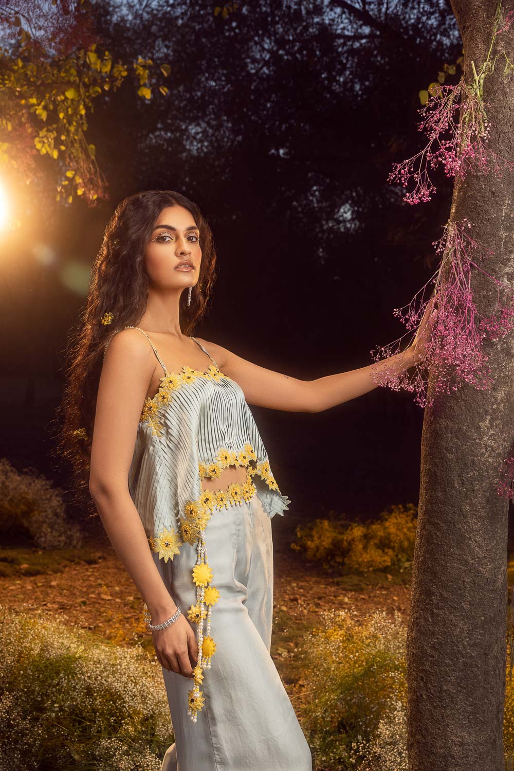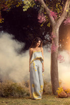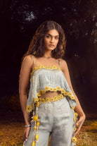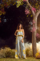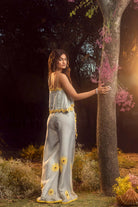 Blue grey organza palazzo set with a pleated crop top and belt embroidered with 3-d sunflower motifs