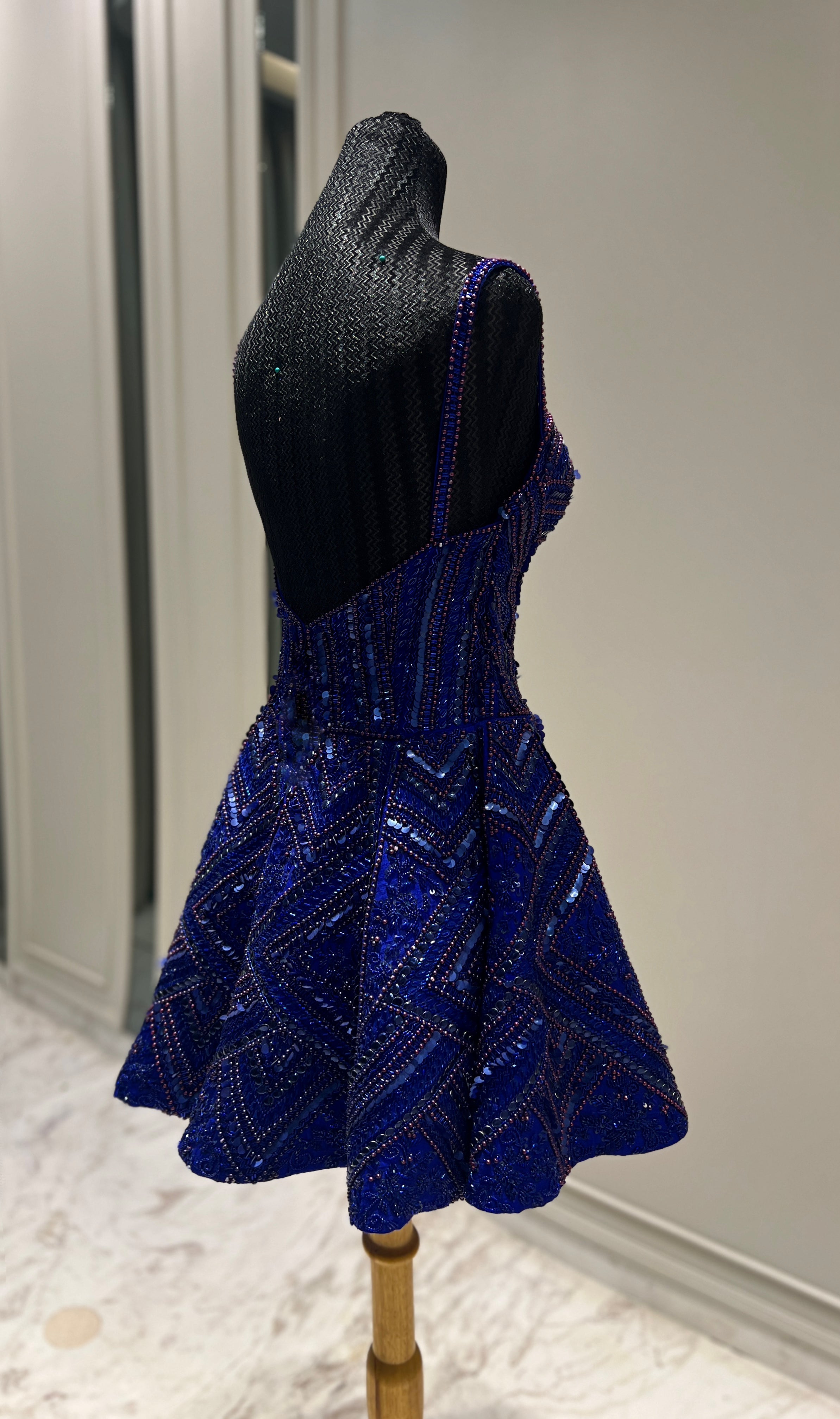 Experience elegance and luxury in our hand-embroidered Sapphire Blue Mirielle dress. This corset-style pixie dress is crafted purely with raw silk and adorned with pearls, crystals, sequins, and beads. Perfect for any occasion, from bachelorette parties to pre-wedding bashes, this dress will elevate your style and make you stand out in every celebration.