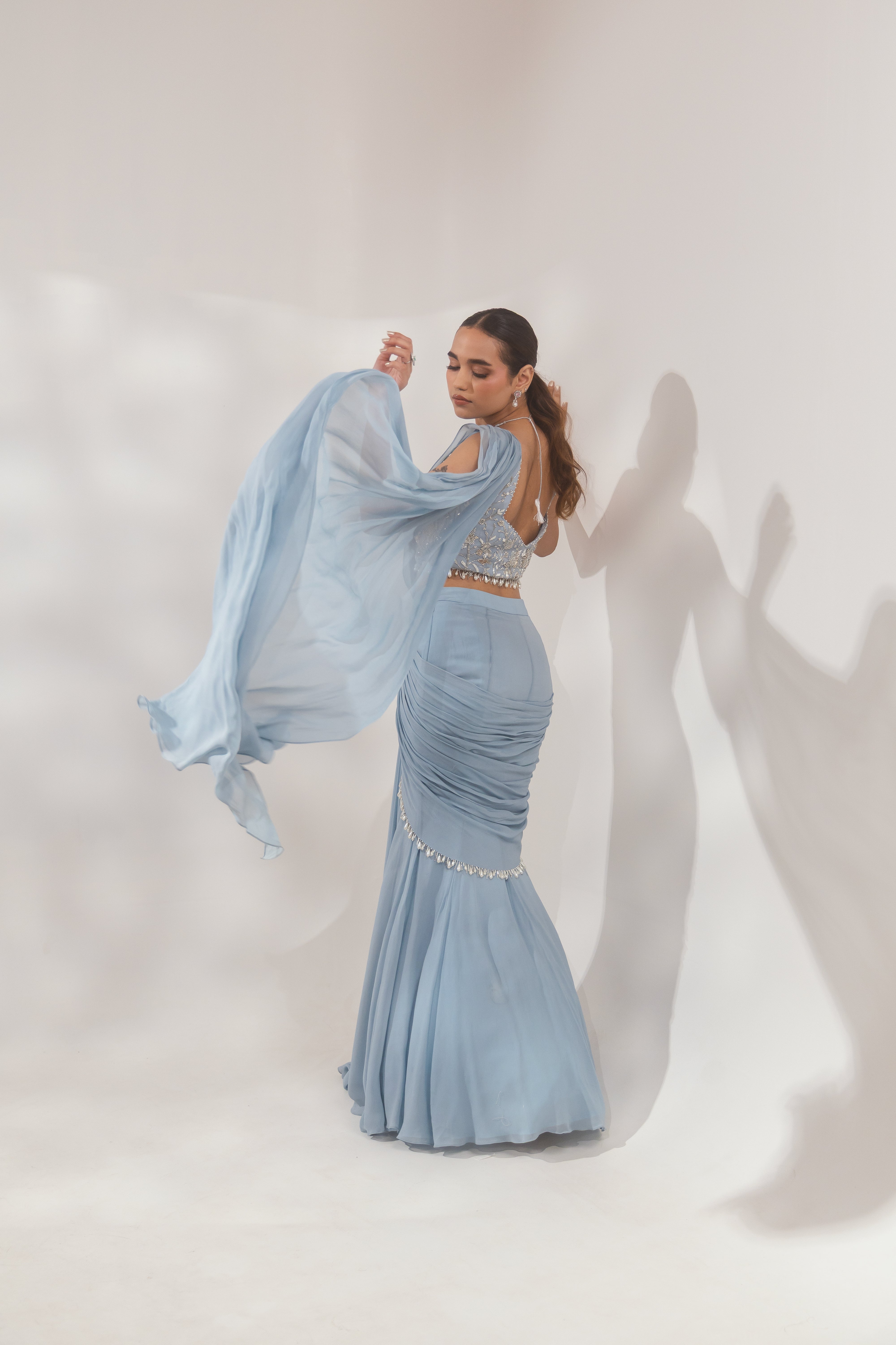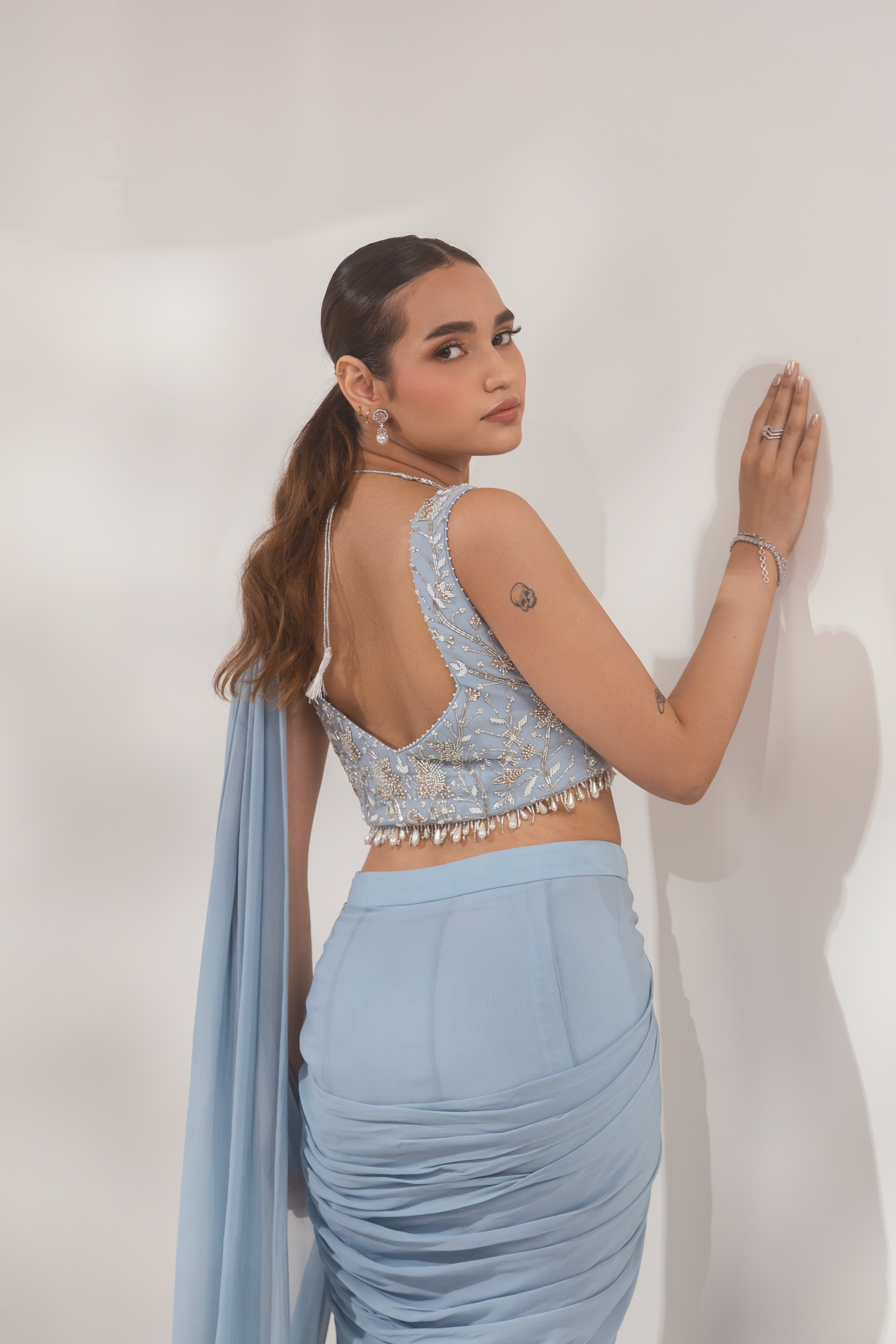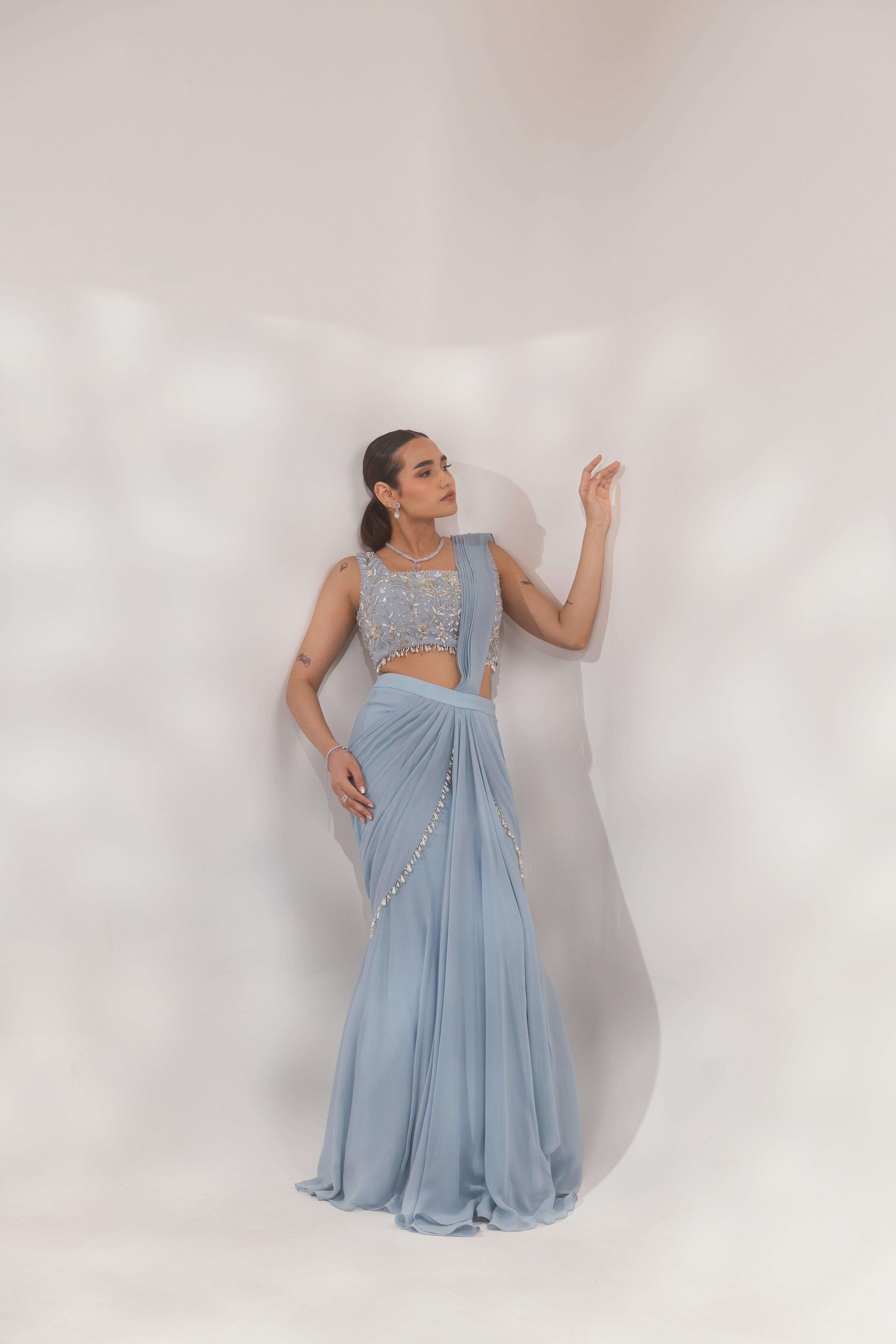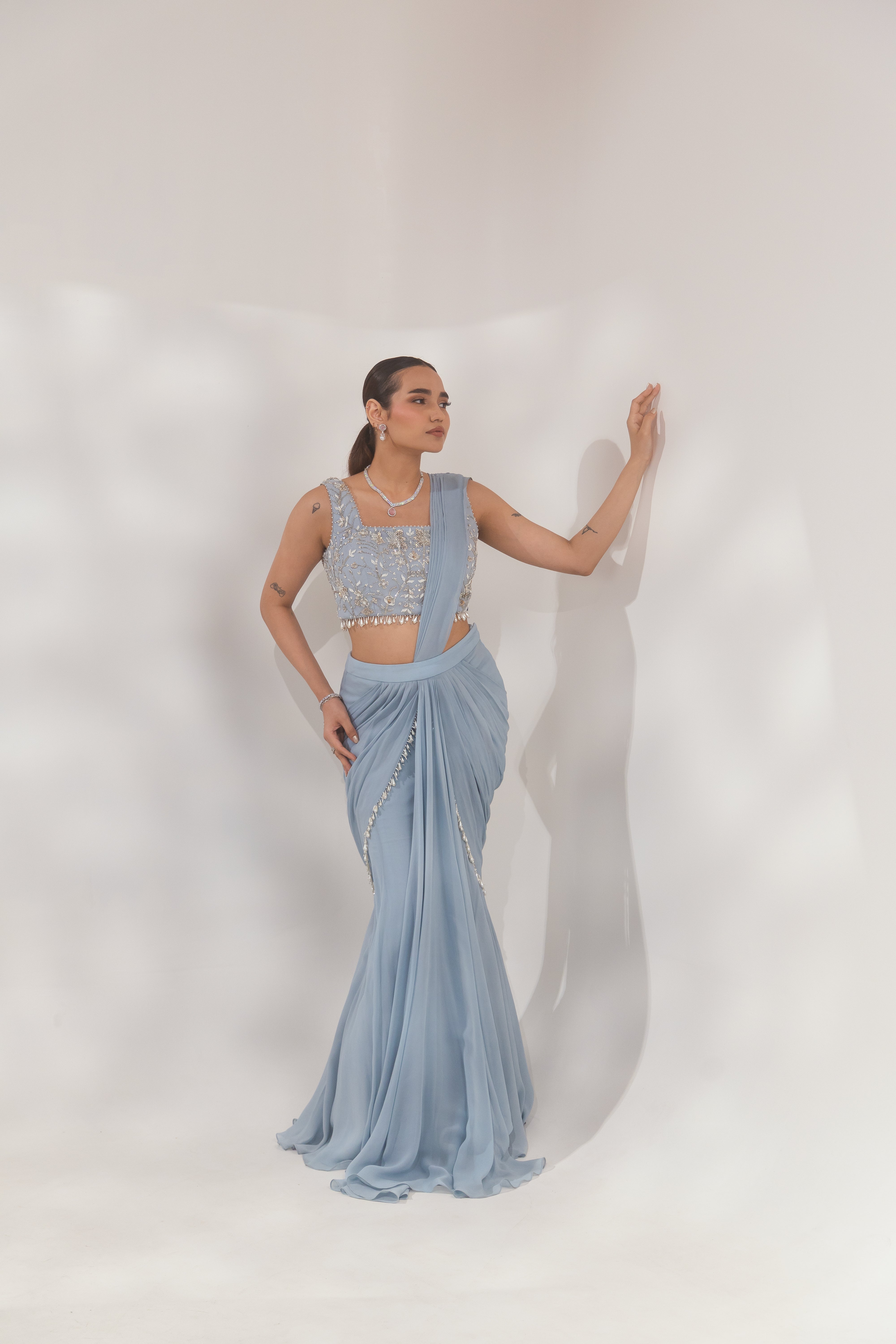 Shine in the Blue Pearl Layer Saree, featuring cascading layers and elegant pearl detailing. Discover this graceful ensemble at Paaro!