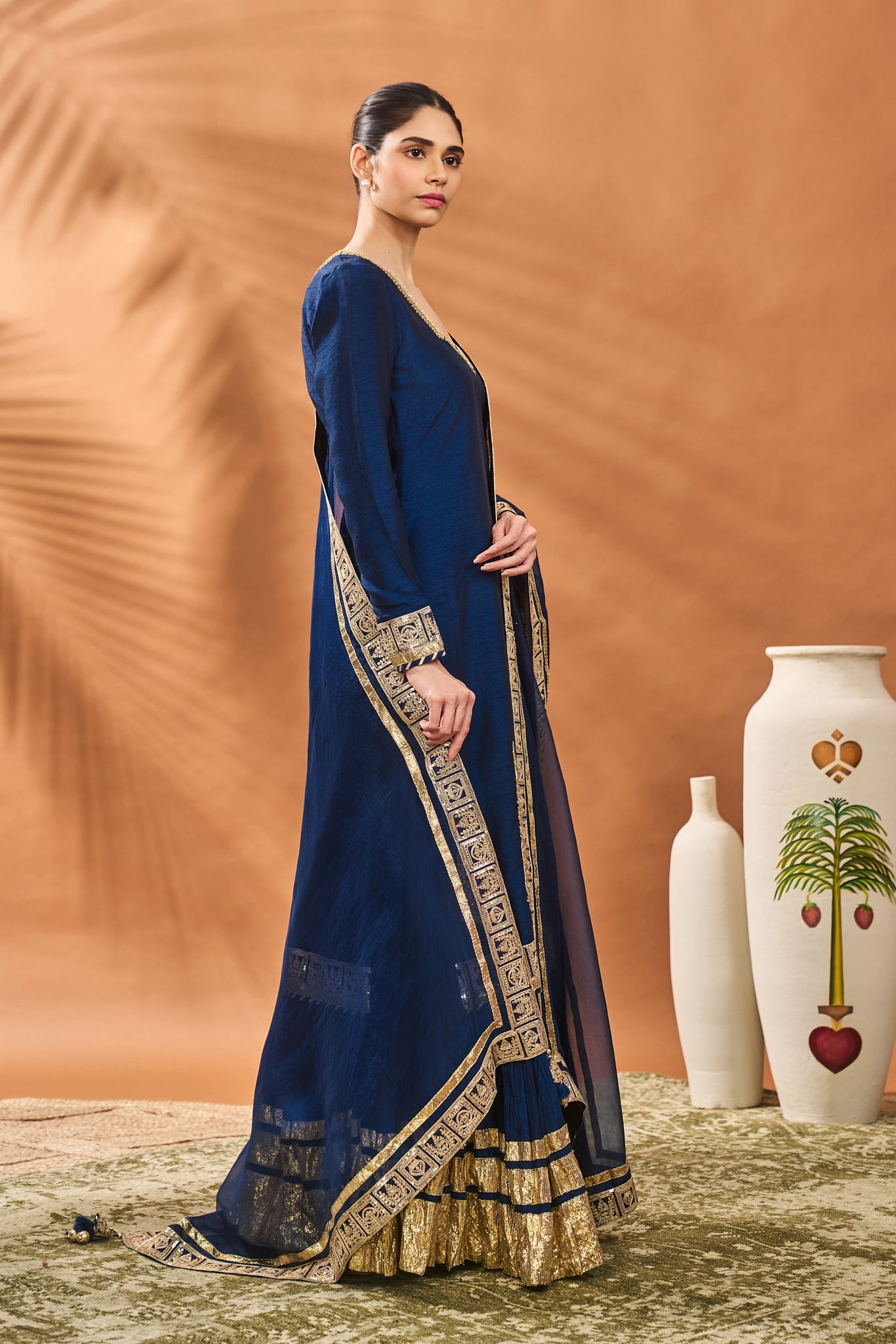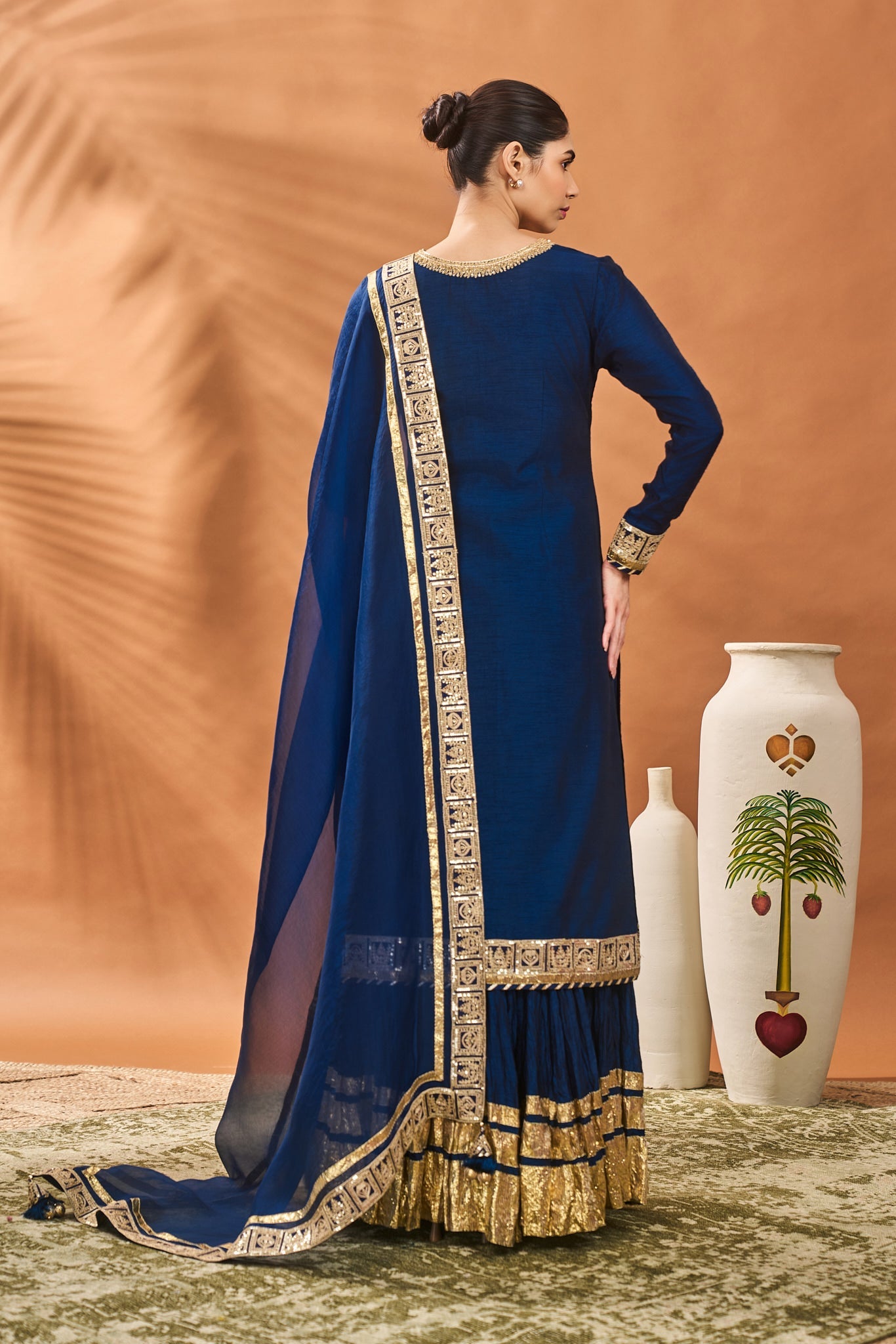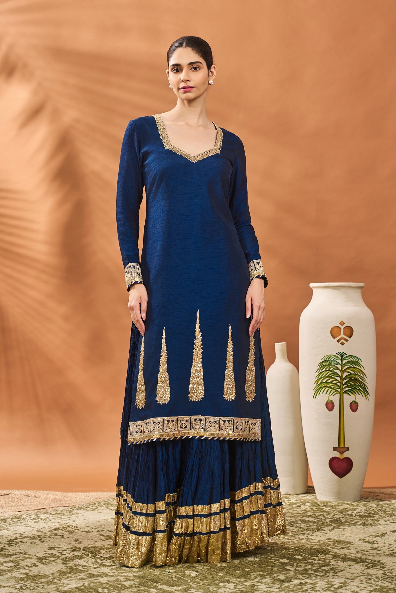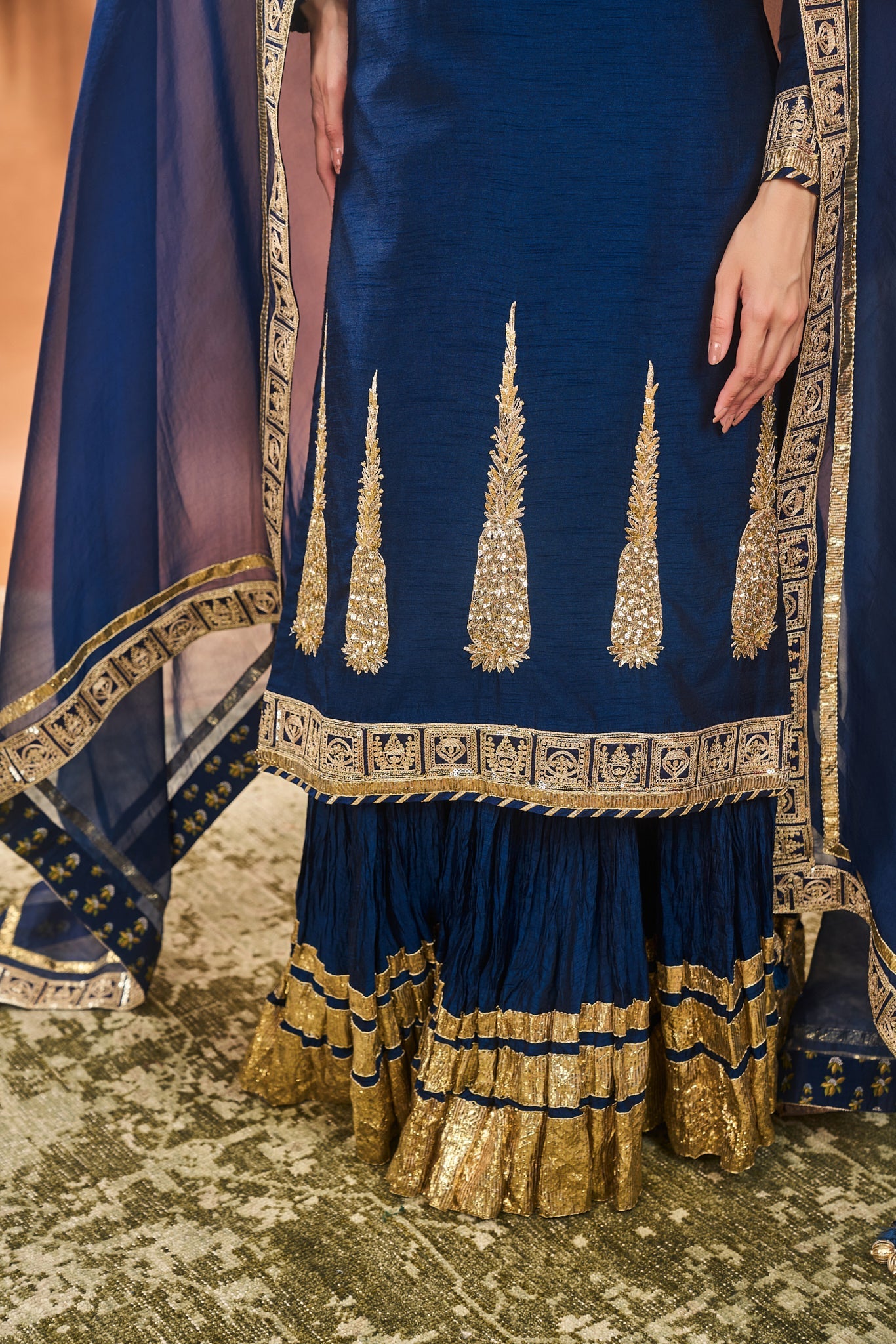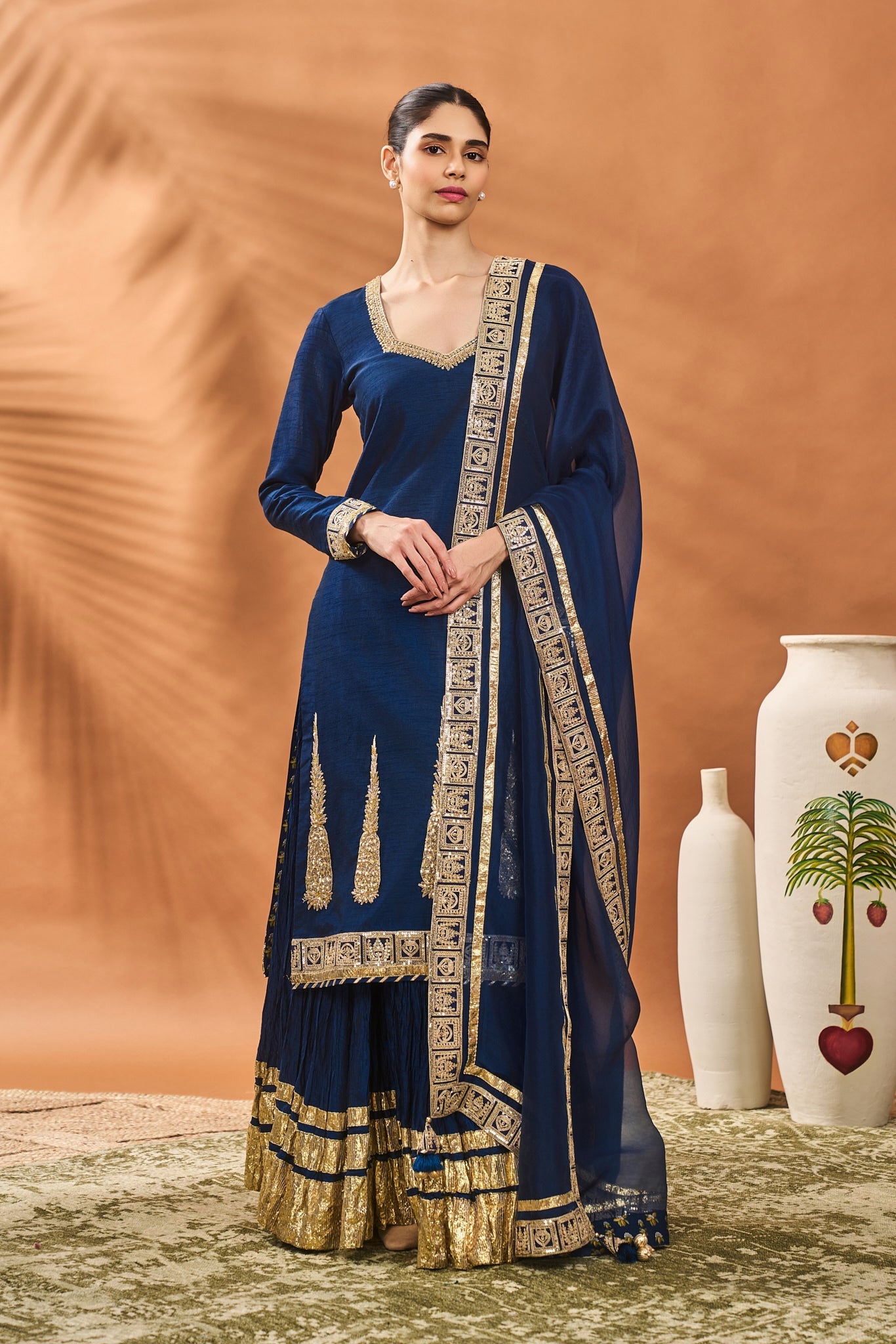 Details: Kurta- Straight kurta is embellished with embroidered borders around the neckline and hem | Neckline and hem embellished with gold embroidery | Full sleeves and hem adorned with border Skirt- Crushed skirt | Hem embellished with gota borders | Side seam closure Dupatta- Organza dupatta | Embellished with embroidered border and edged with kinari | Tassel Detail