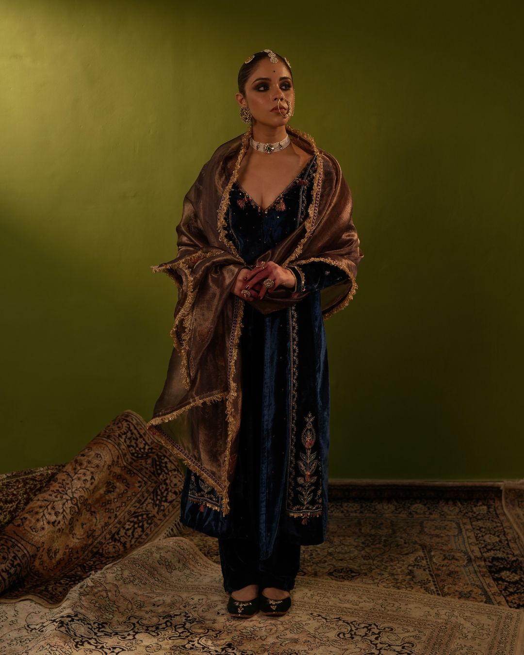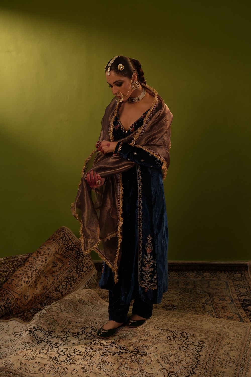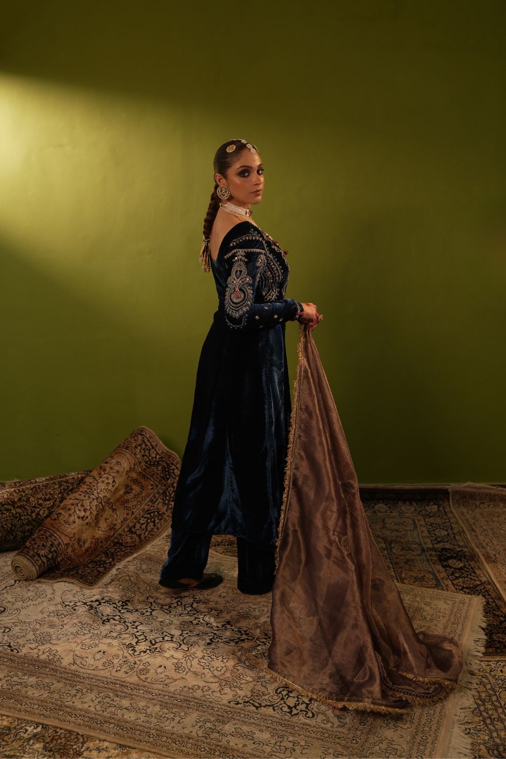 The rich blue Anarkali with the stylized V neckline and full sleeves contribute to a refined and contemporary aesthetic. The carefully crafted sequin, pearl, and zardozi handwork adds intricate detailing, creating a luxurious and eye-catching effect. The ensemble, completed with a tissue dupatta, not only adds grace but also ensures a well-balanced and harmonious look, making it a standout choice for memorable occasions where style meets tradition. Inclusive of bag.