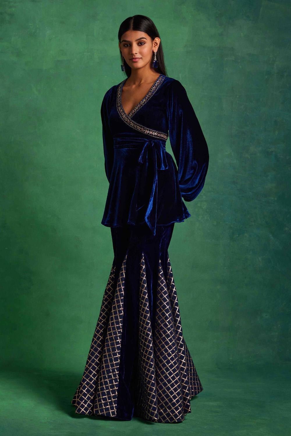 Blue silk velvet peplum with embroidery detailing at the neckline and a tie detail at the waist, it has balloon sleeves and mirror-work embroidered cuffs it is paired with godet pants with checks detailing.