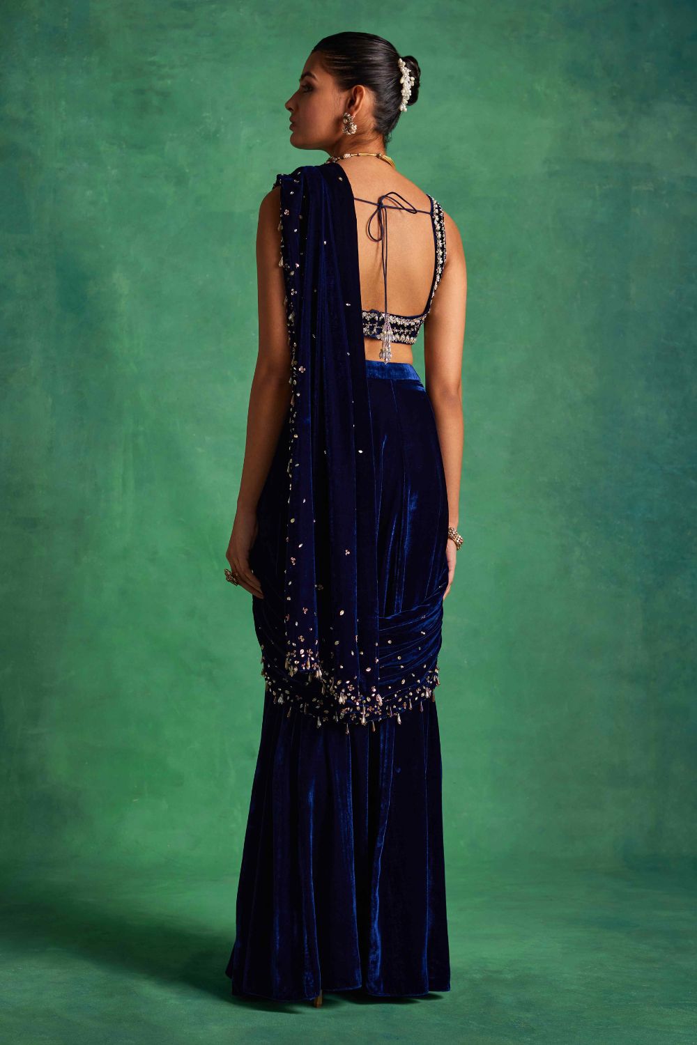 Blue silk velvet slit saree with hand embroidered palla with tassel detailing, it is paired with a u neck mirror and sequins hand embroidered blouse.