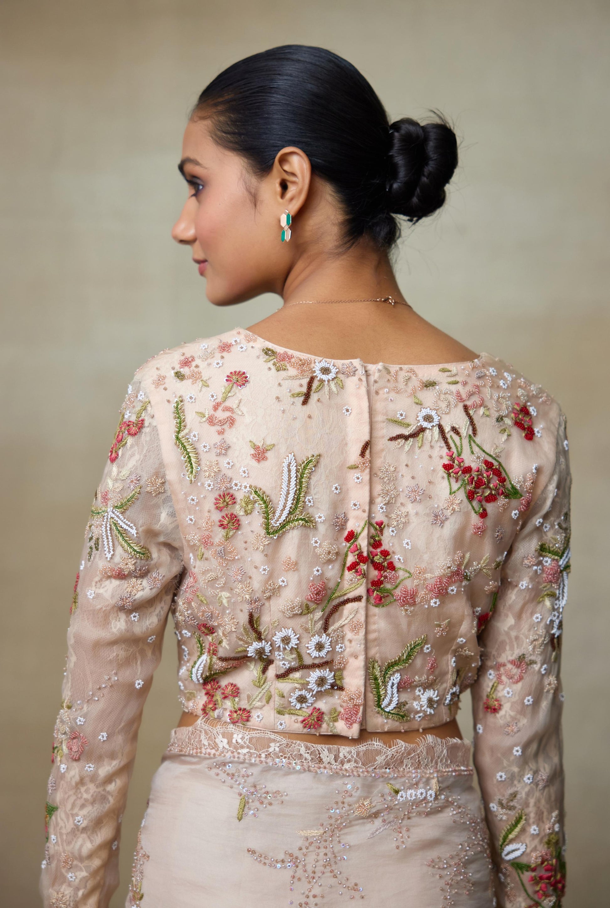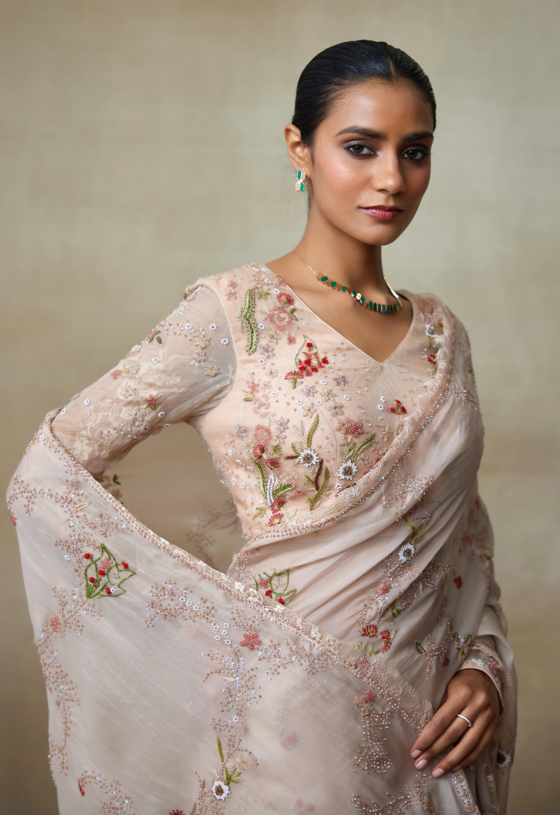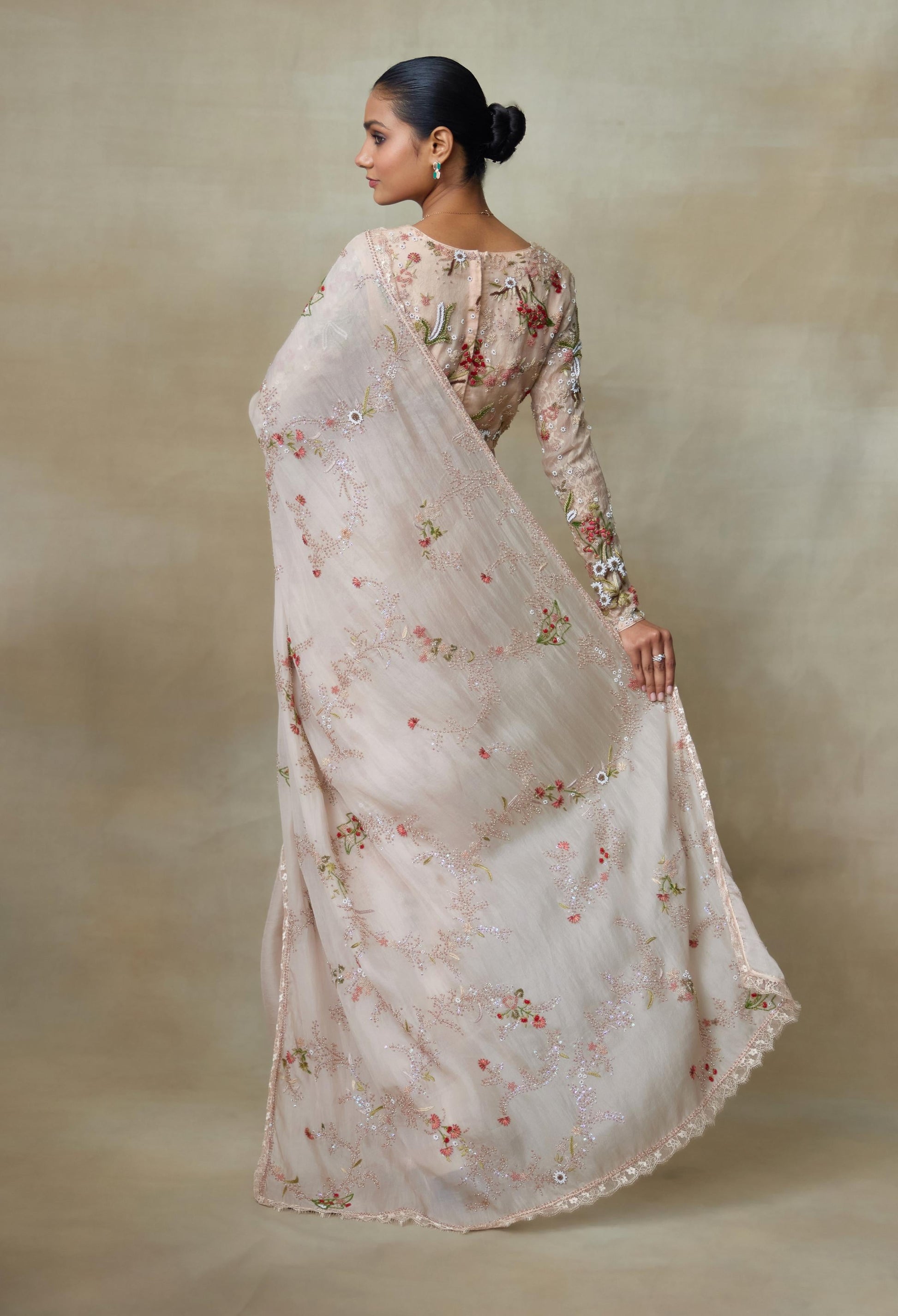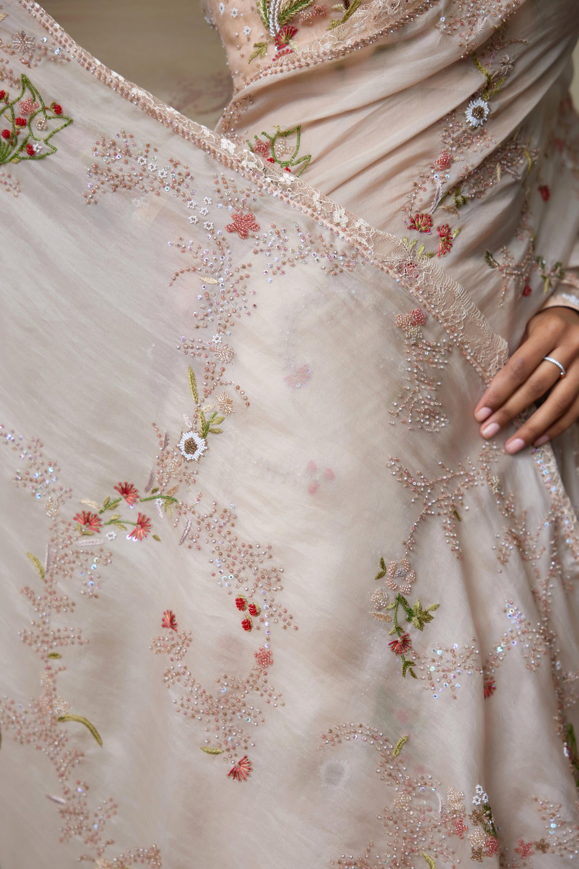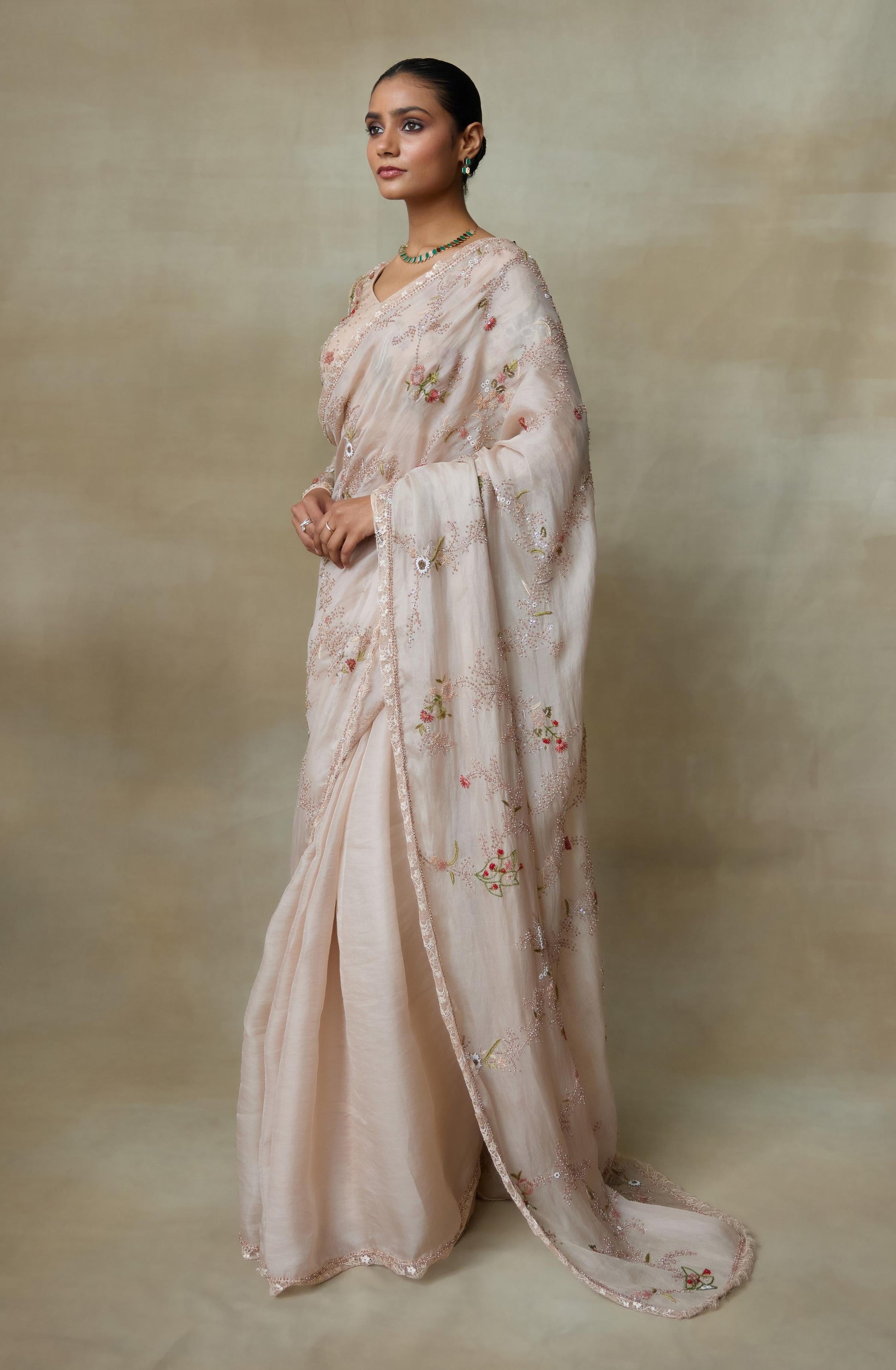 Our Silk Organza Rose Coloured Saree With Blouse Has Our Floral Work Of Beads And Sequence Which Has Lace Edges Making It A Enchanting Ensemble.