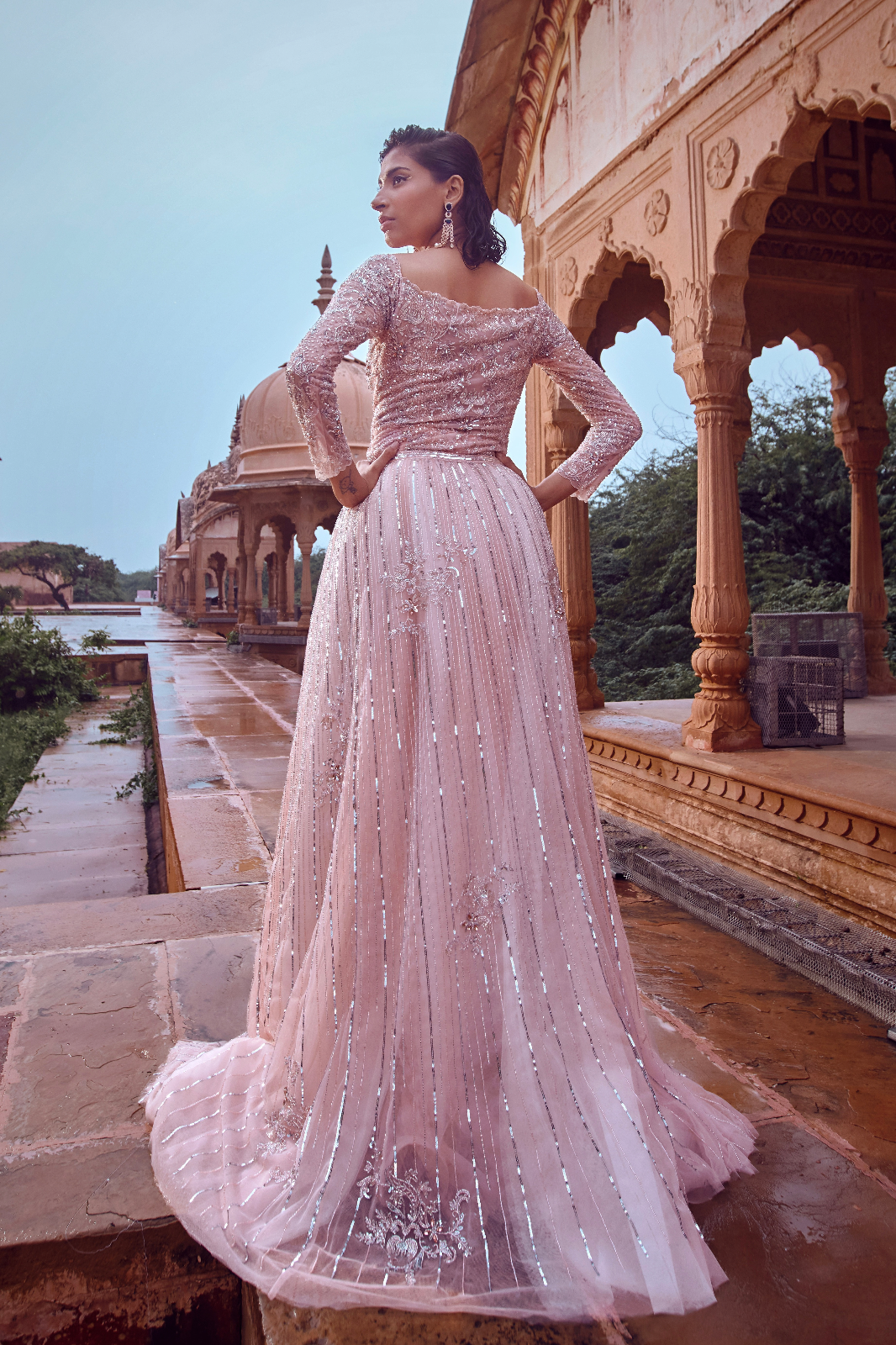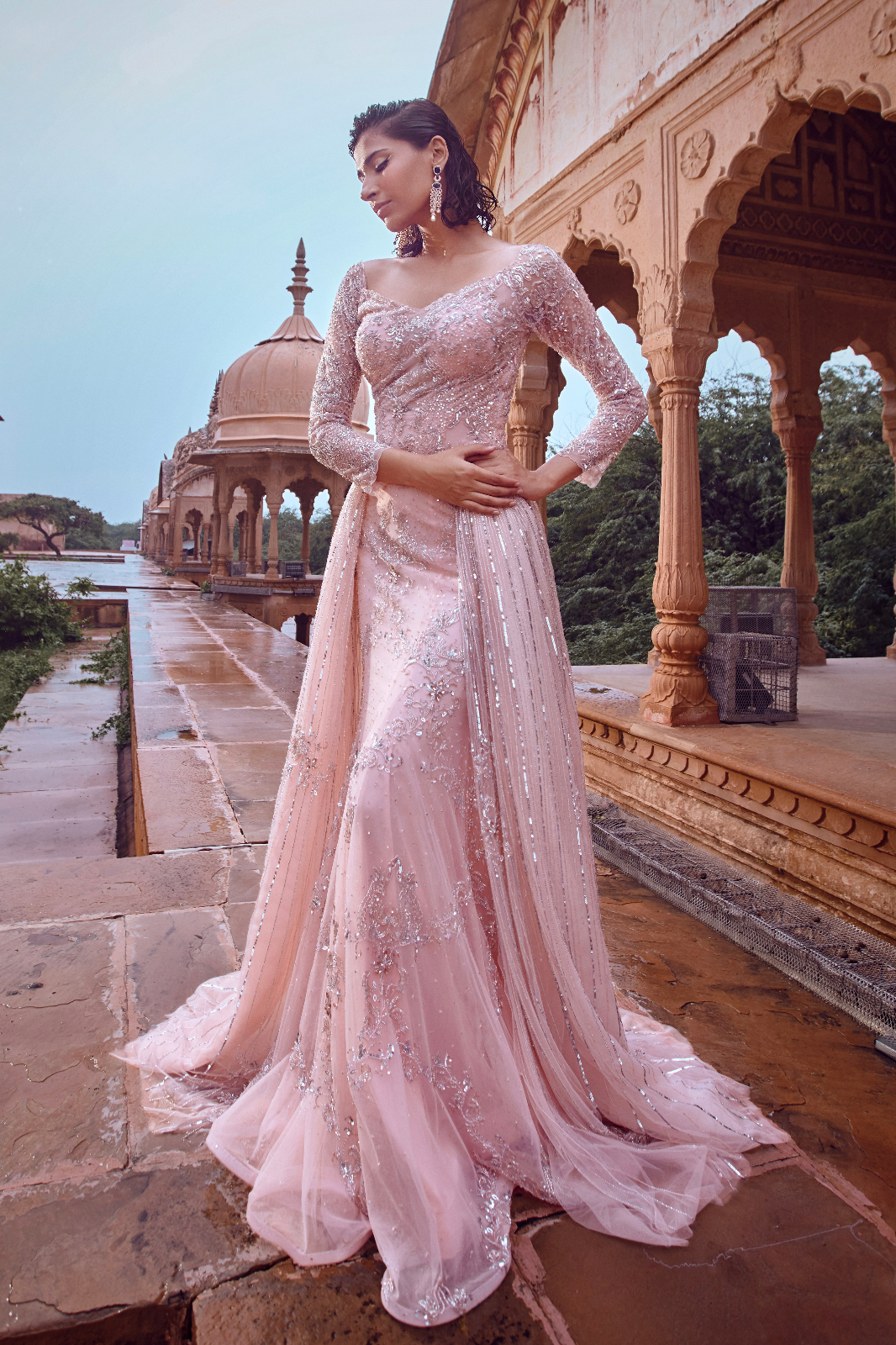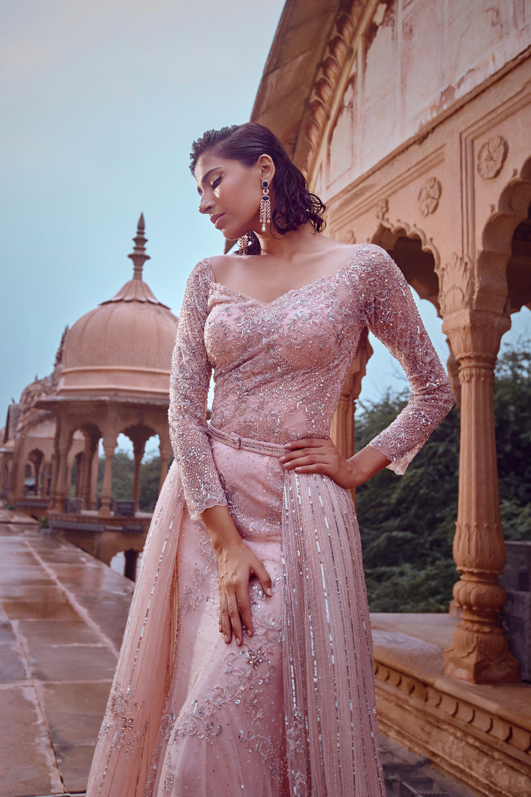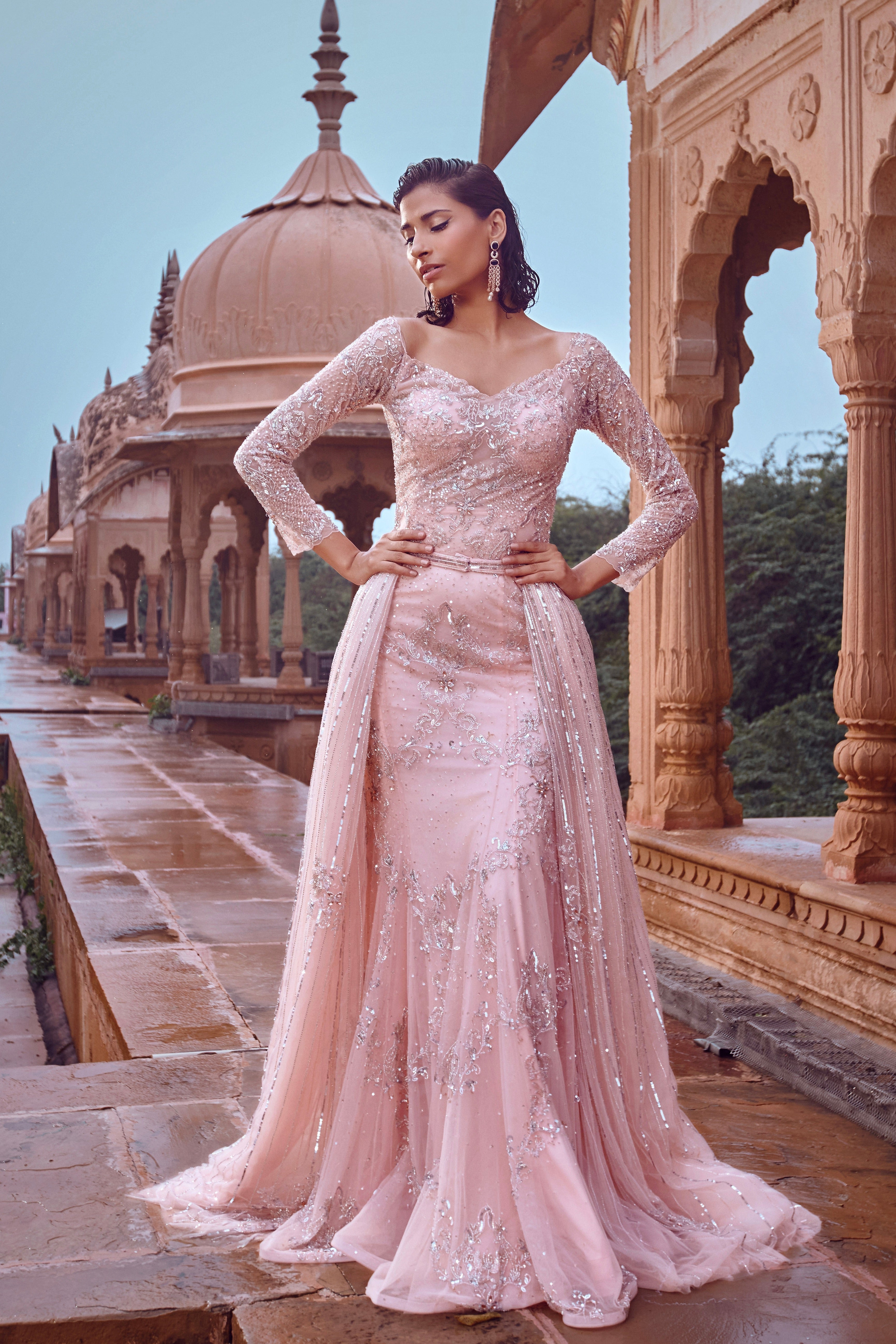 Featuring a blush pink, with tone-on-tone work with a touch of silver embellished flared gown style with a drape belt to give more flare
