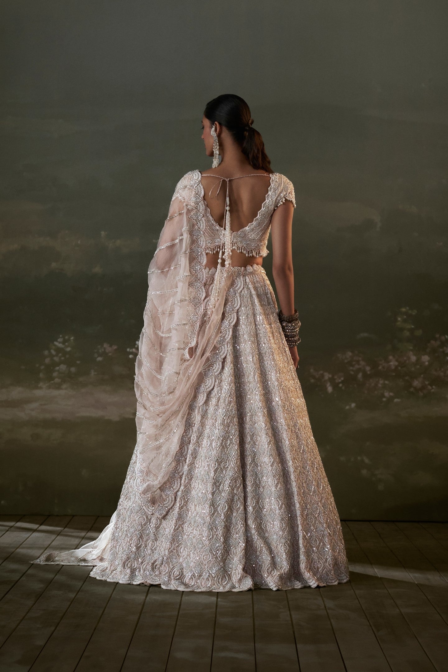 Blush pink satin organza lehenga choli with organza dupatta embroidered intricately with tonal resham, sequins, beads and crystals. This outfit can be accessorised with an optional veil which can be ordered addionally.