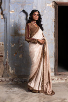 Blush Pink Monga tussar woven saree with a velvet blouse and border embroidered in antique dabka, zari, and beadwork.
