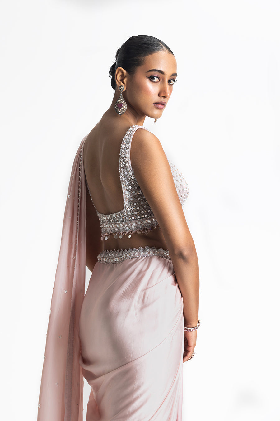Rose To Blush Ombre Dyed Satin Draped Saree With Net Blouse And Satin Palla Worked In Tonal Sequins, Beadwork, And Crystals.